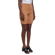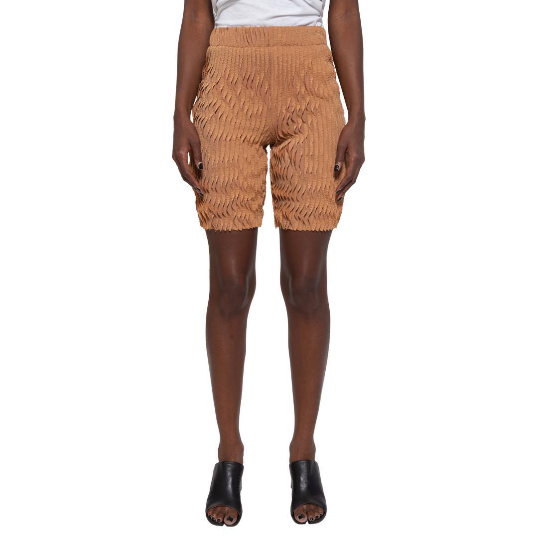 From LĒO Spring/Summer '22 collection 'Aura.' Flared wavy jersey biker shorts with soft touch texture in sand.