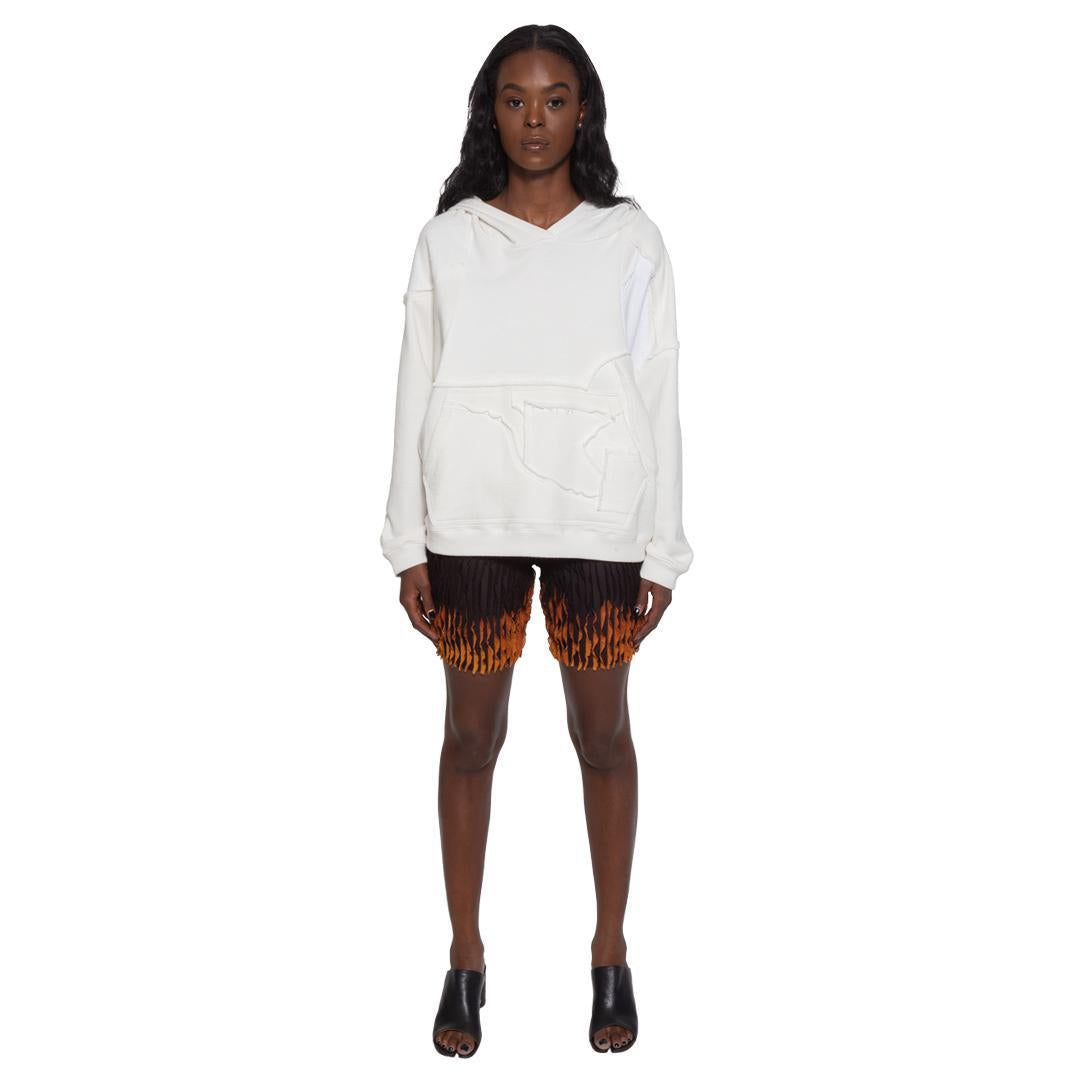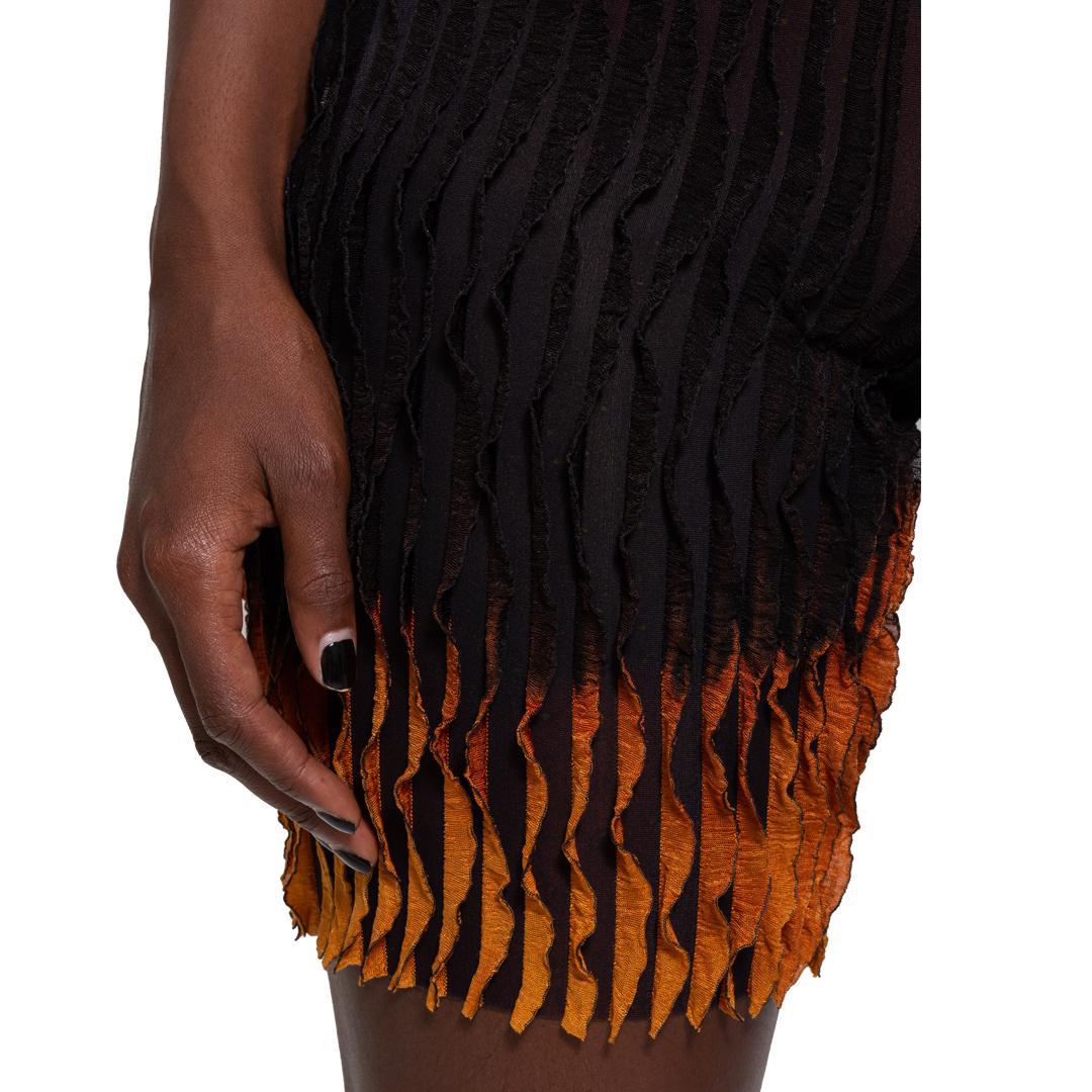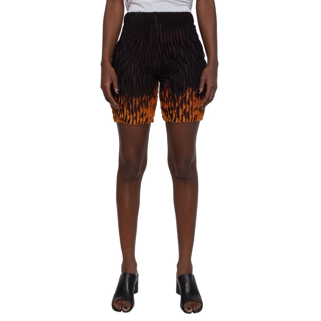 From LĒO Spring/Summer '22 collection 'Aura.' Flared wavy jersey biker shorts with soft touch texture in black with horizontal tie dye placement at bottom of legs.