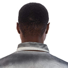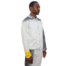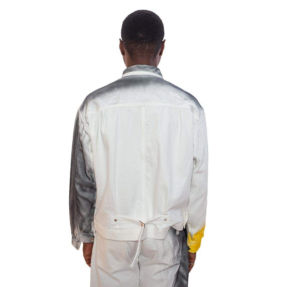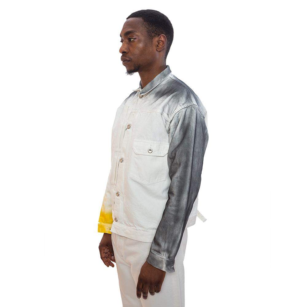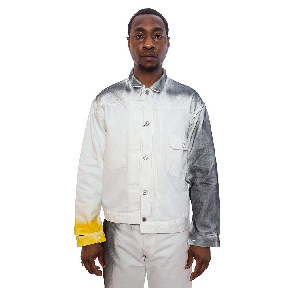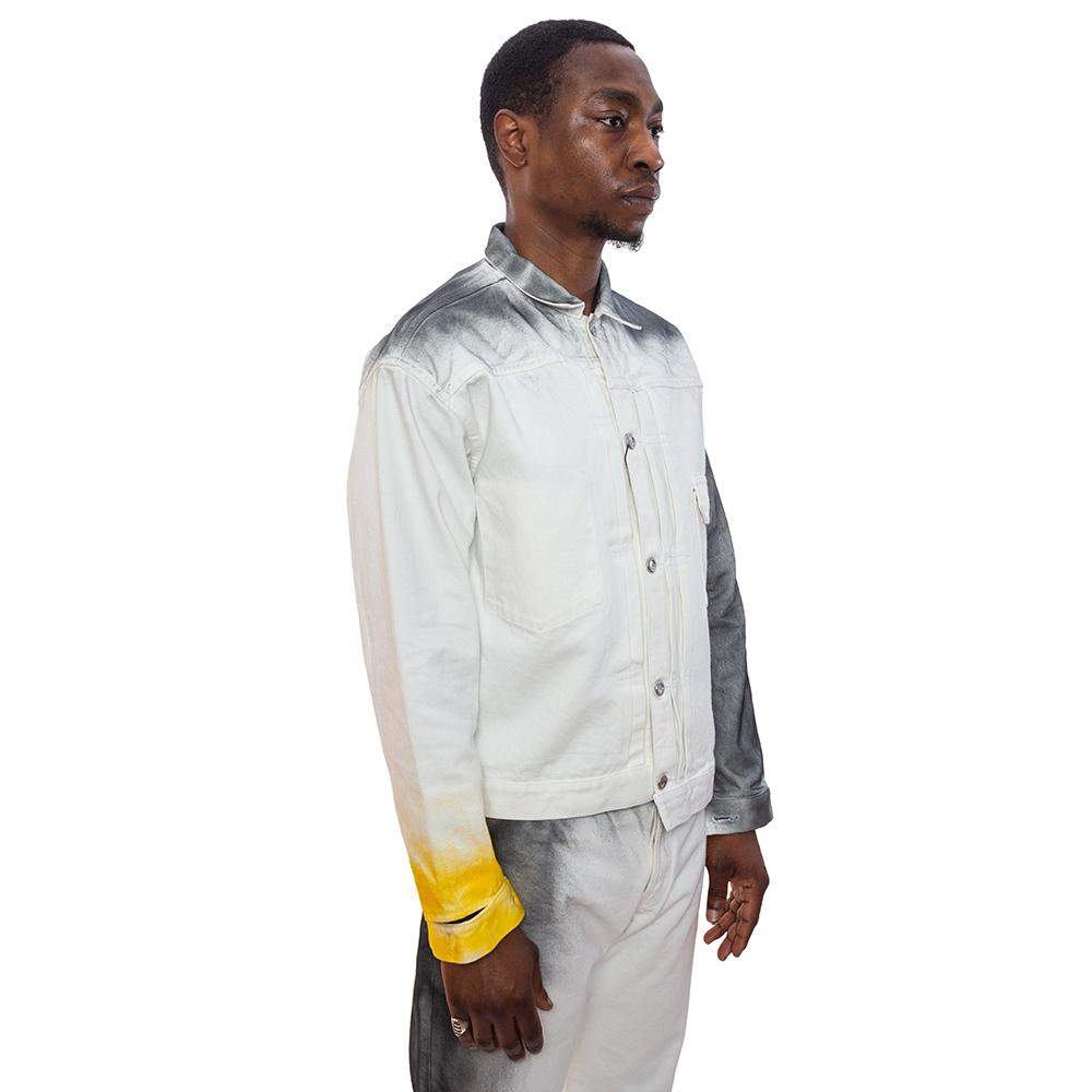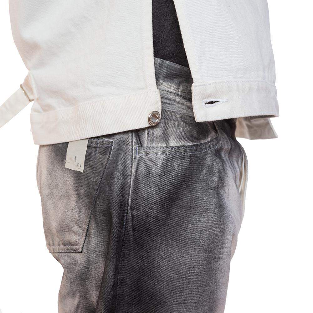 The front is tack-style and follows vintage details. Slits have been added to the back of the collar and cuffs. The unbalanced collar and length that are different on the left and right produce an exquisite "shift". By coloring with a spray, the texture of mohair knit is expressed abstractly. The button is an original with a logo. A moderate tapered silhouette with a moderate volume. Use 13.5oz rigid denim. Non-stretch
