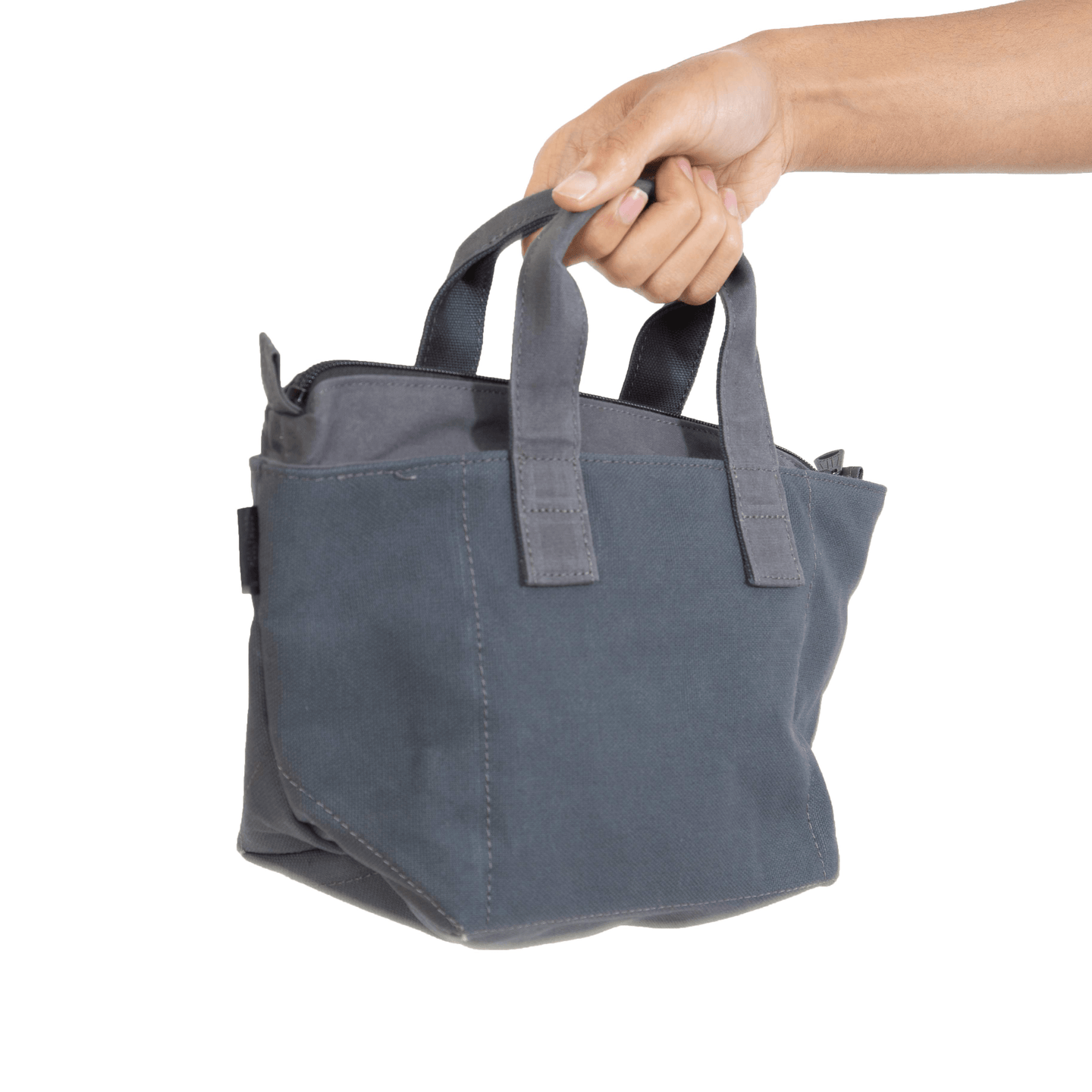 Canvas tote in grey. Twin carry handles at top. Logo flag at side. Zip closure. Patch pockets and logo patch at interior. Partial twill lining. Tonal hardware. Approx. 13" length x 6.5" height x 5" width.