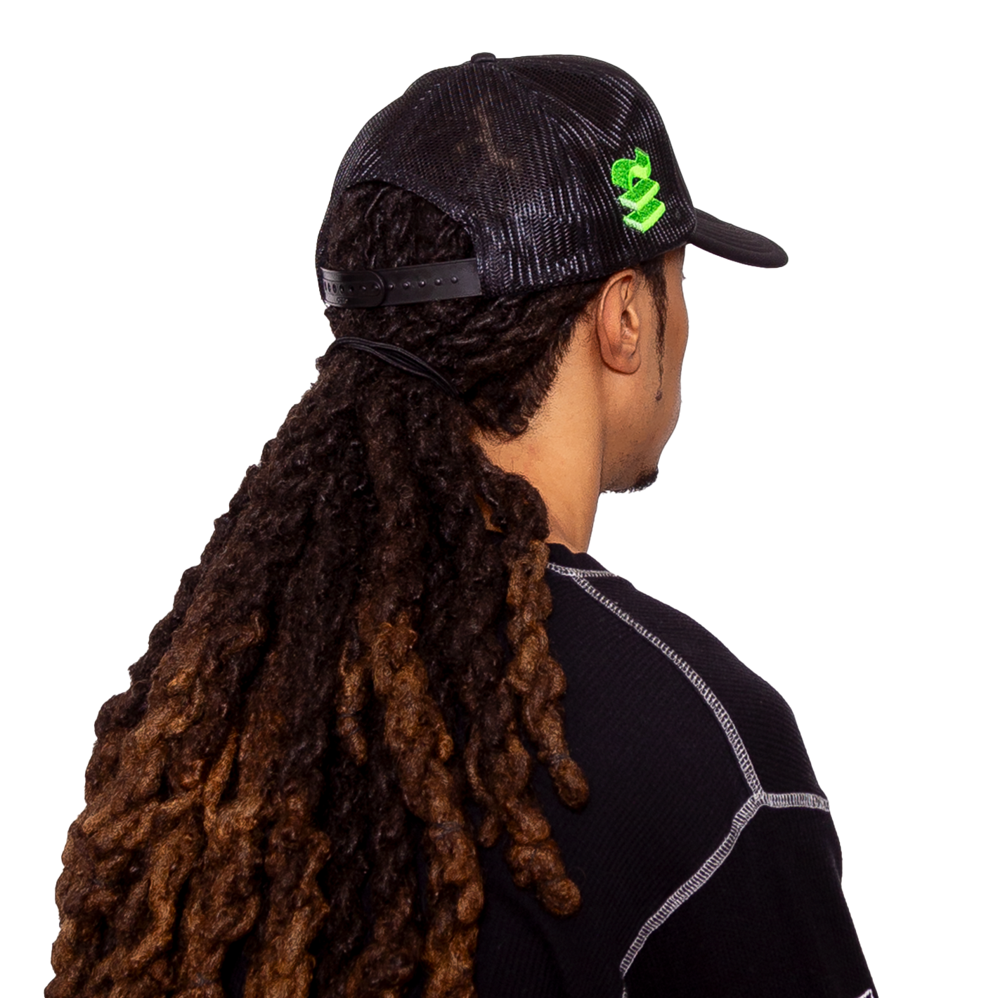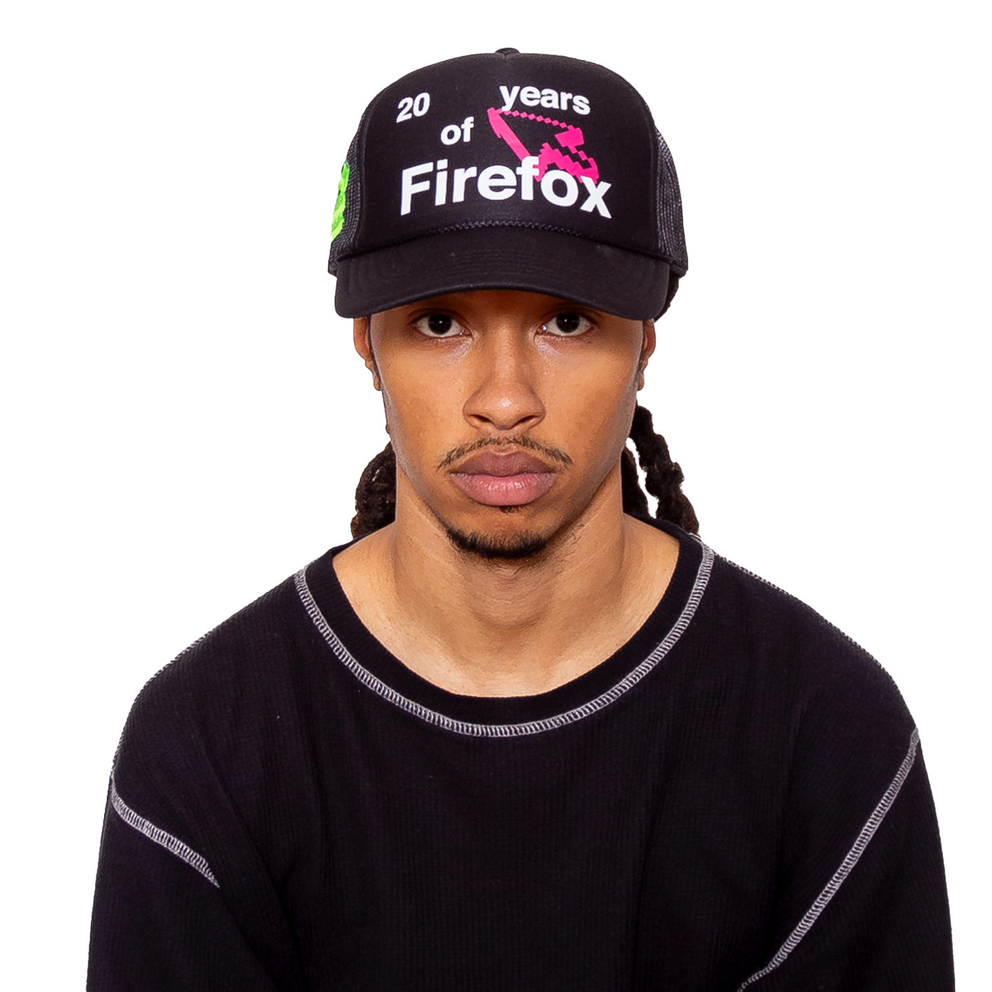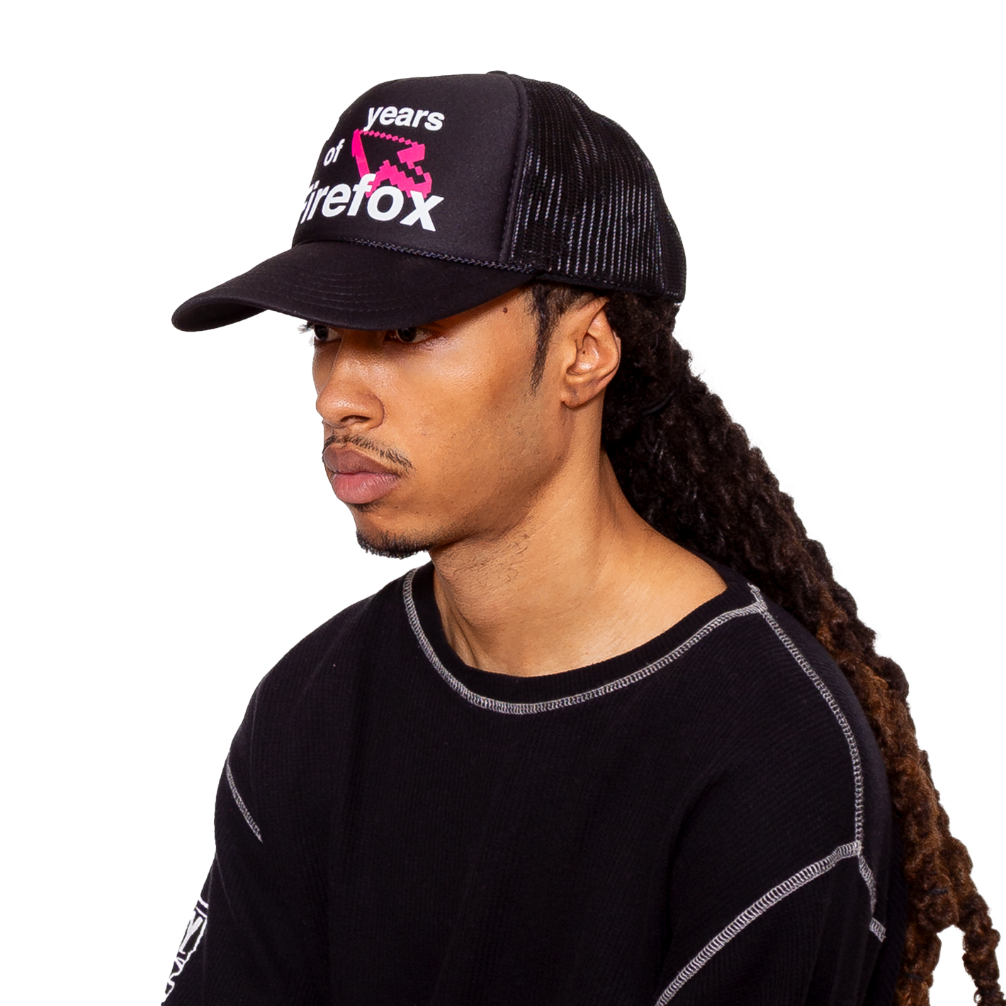 Classic black mesh backed trucker hat with "20 years of Firefox" graphic print on front. Congruent logo embroidered on right side. Adjustable snap enclosure.