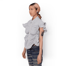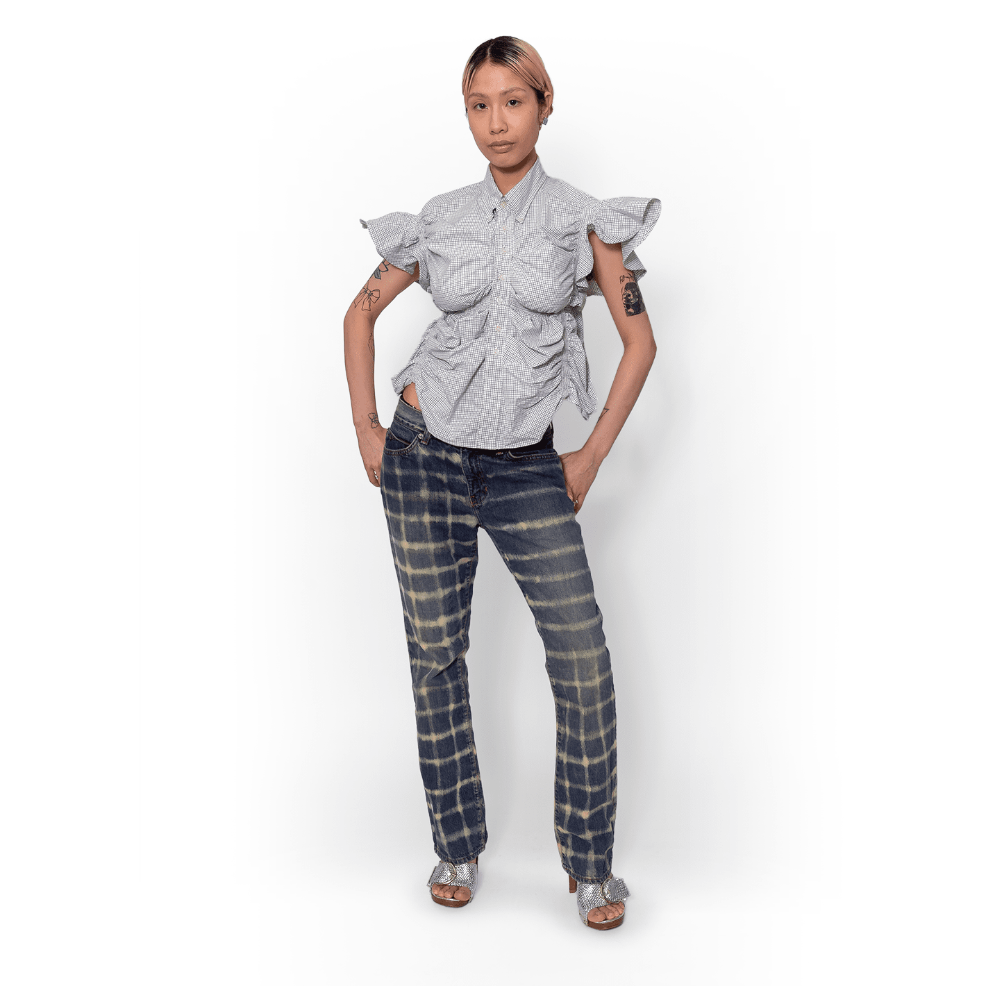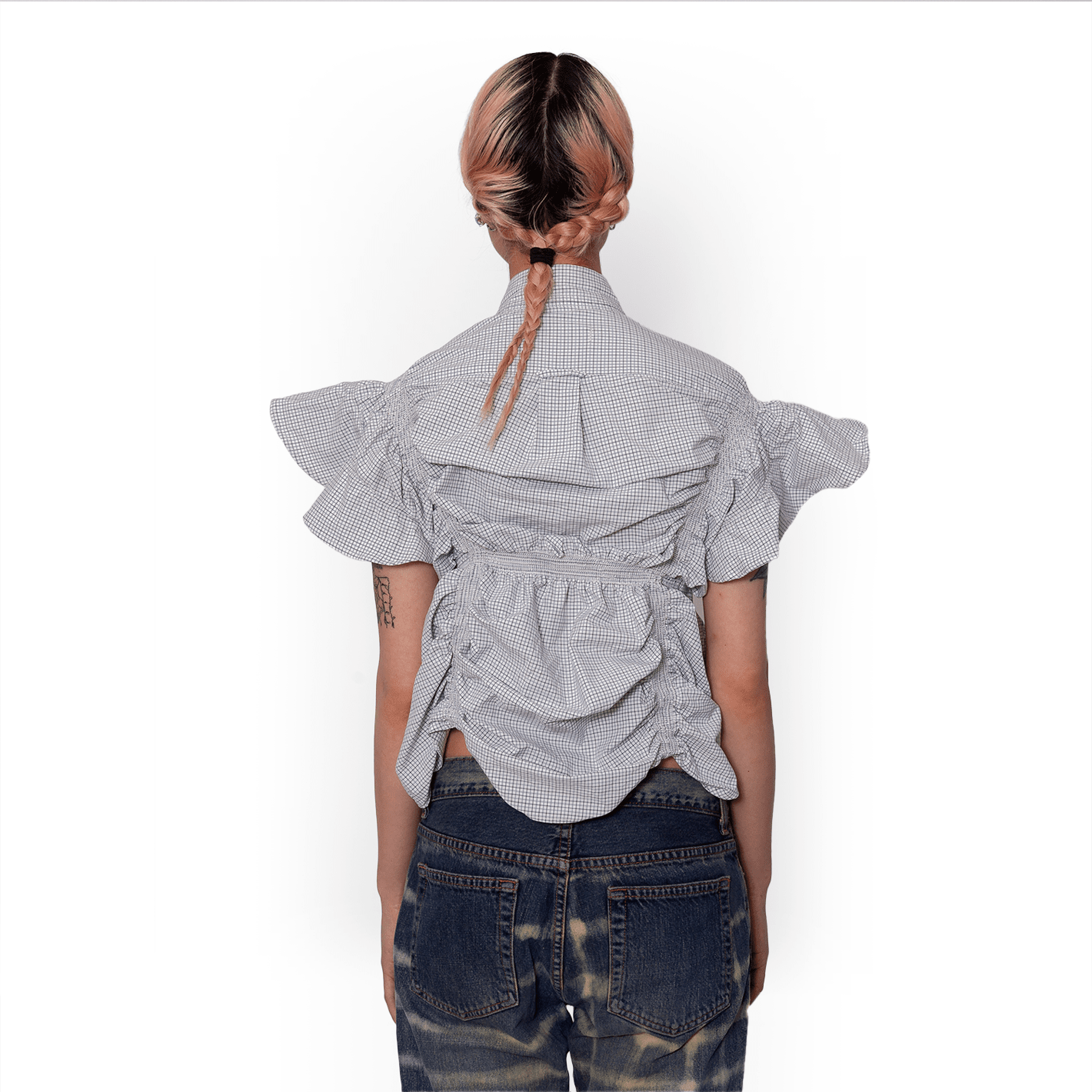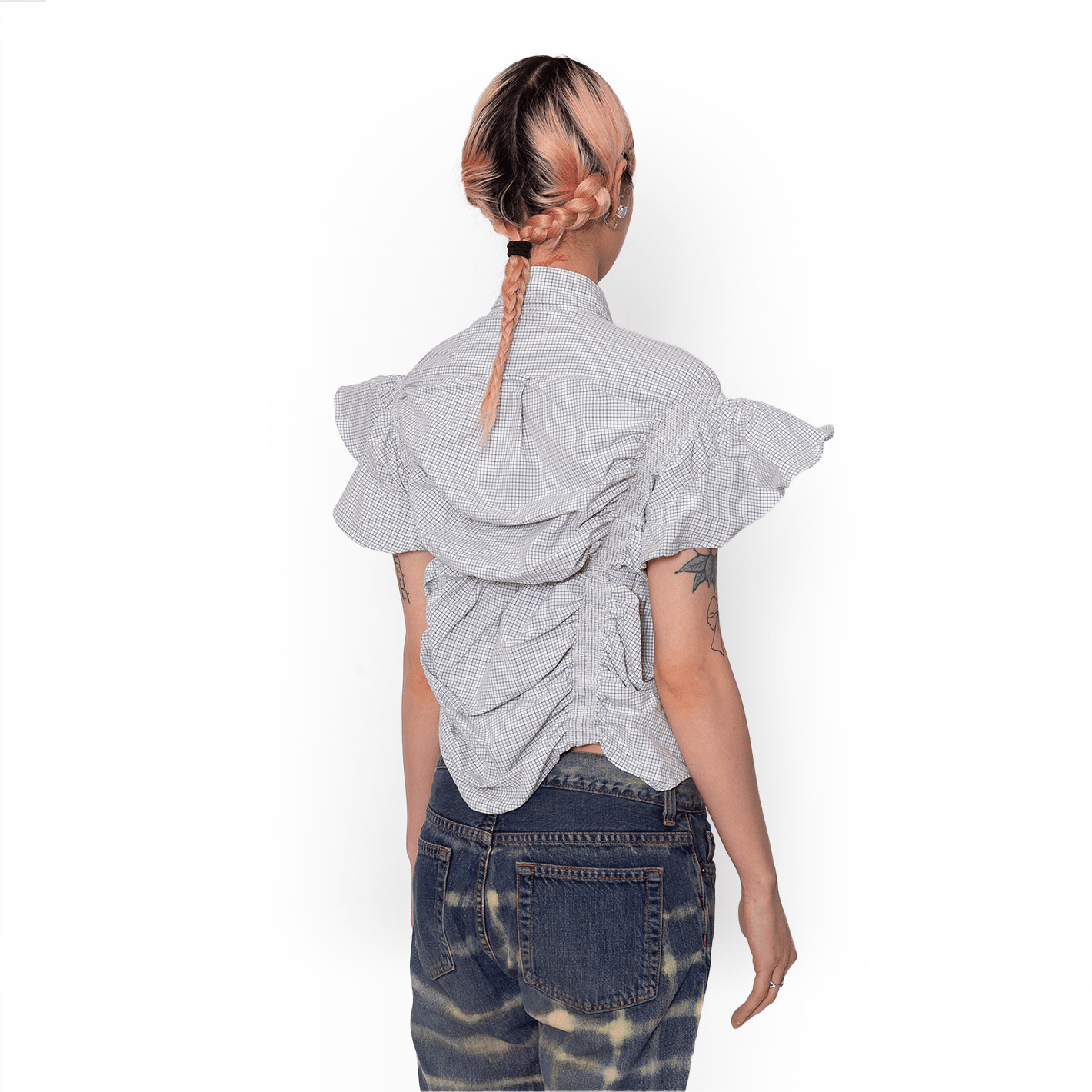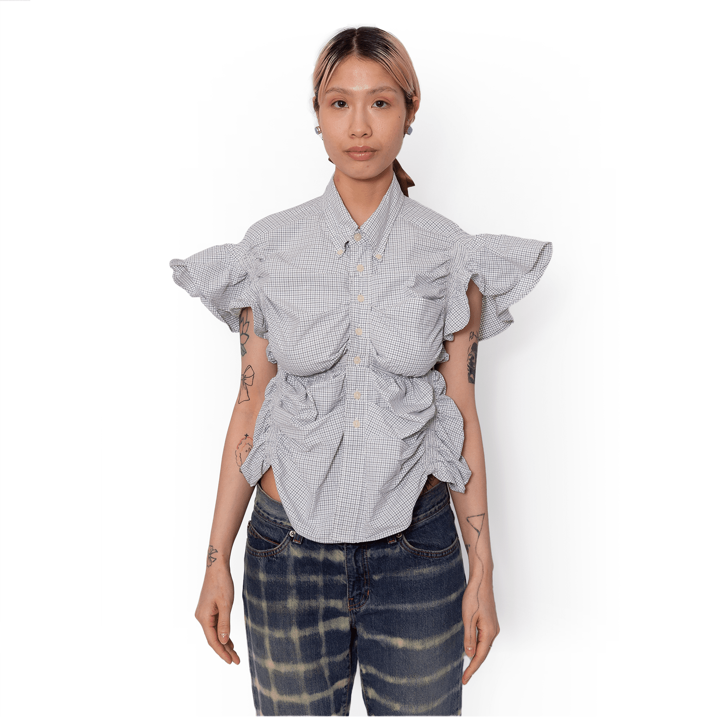 One-of-one reworked button down shirt. White / blue gingham with exaggerated shoulder pleats. Whimsical take on a classic garment. 100% Cotton and elastic. Hand wash cold or dry clean.