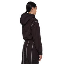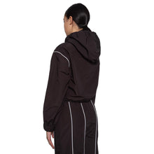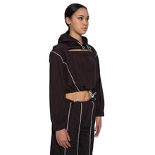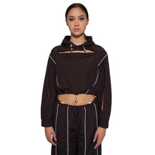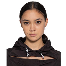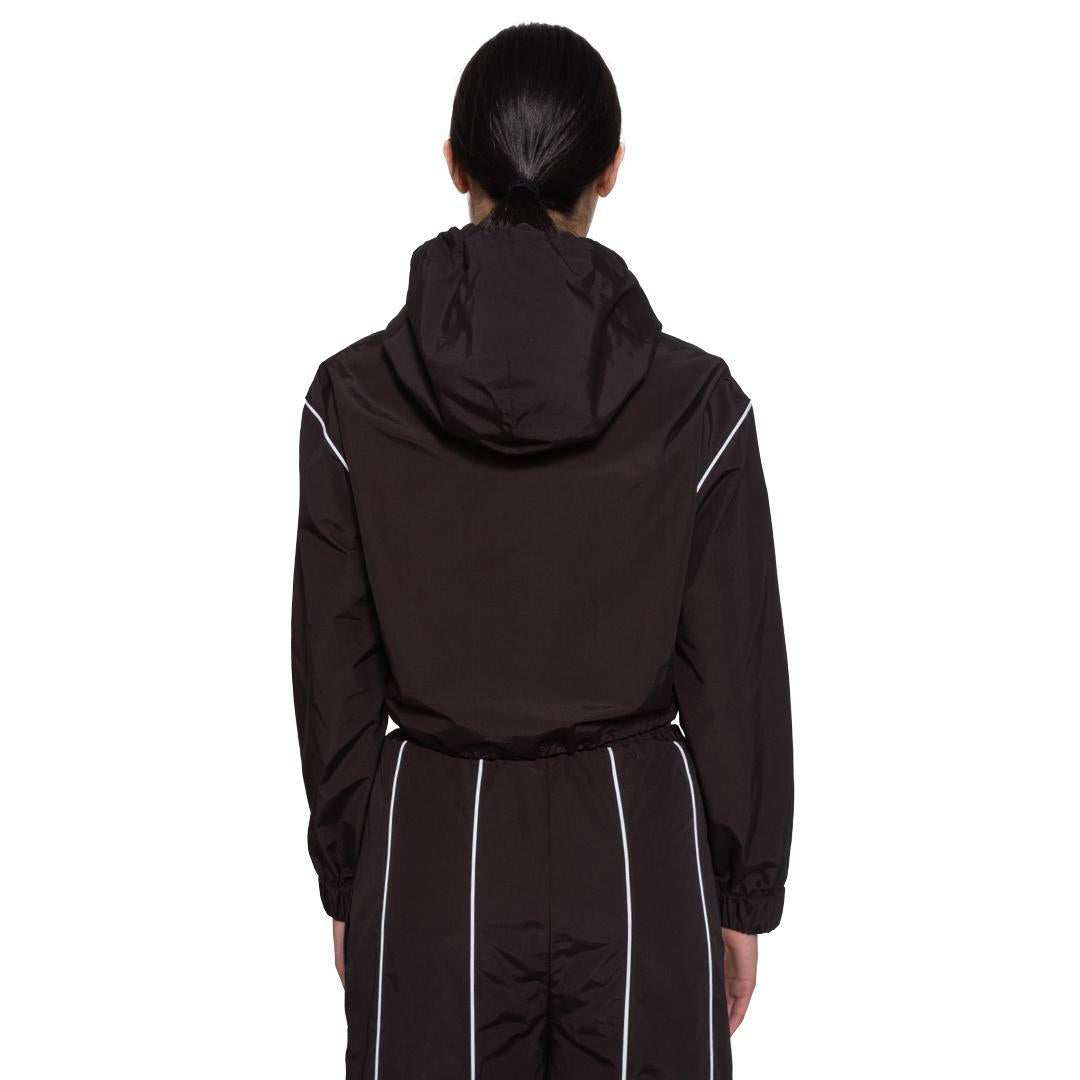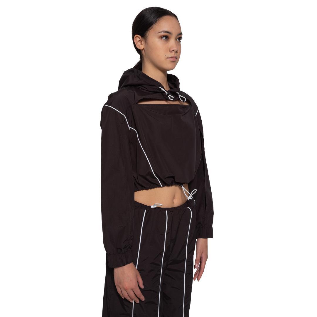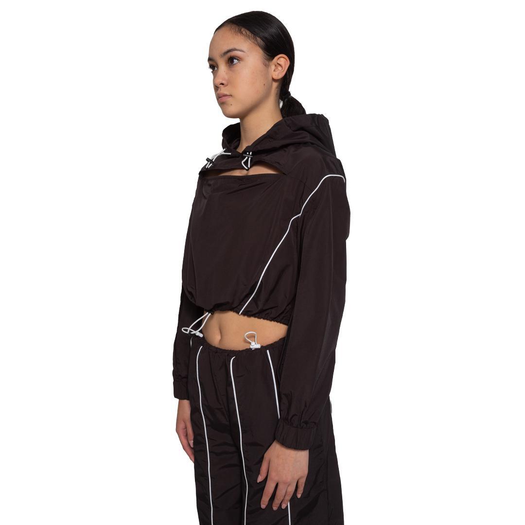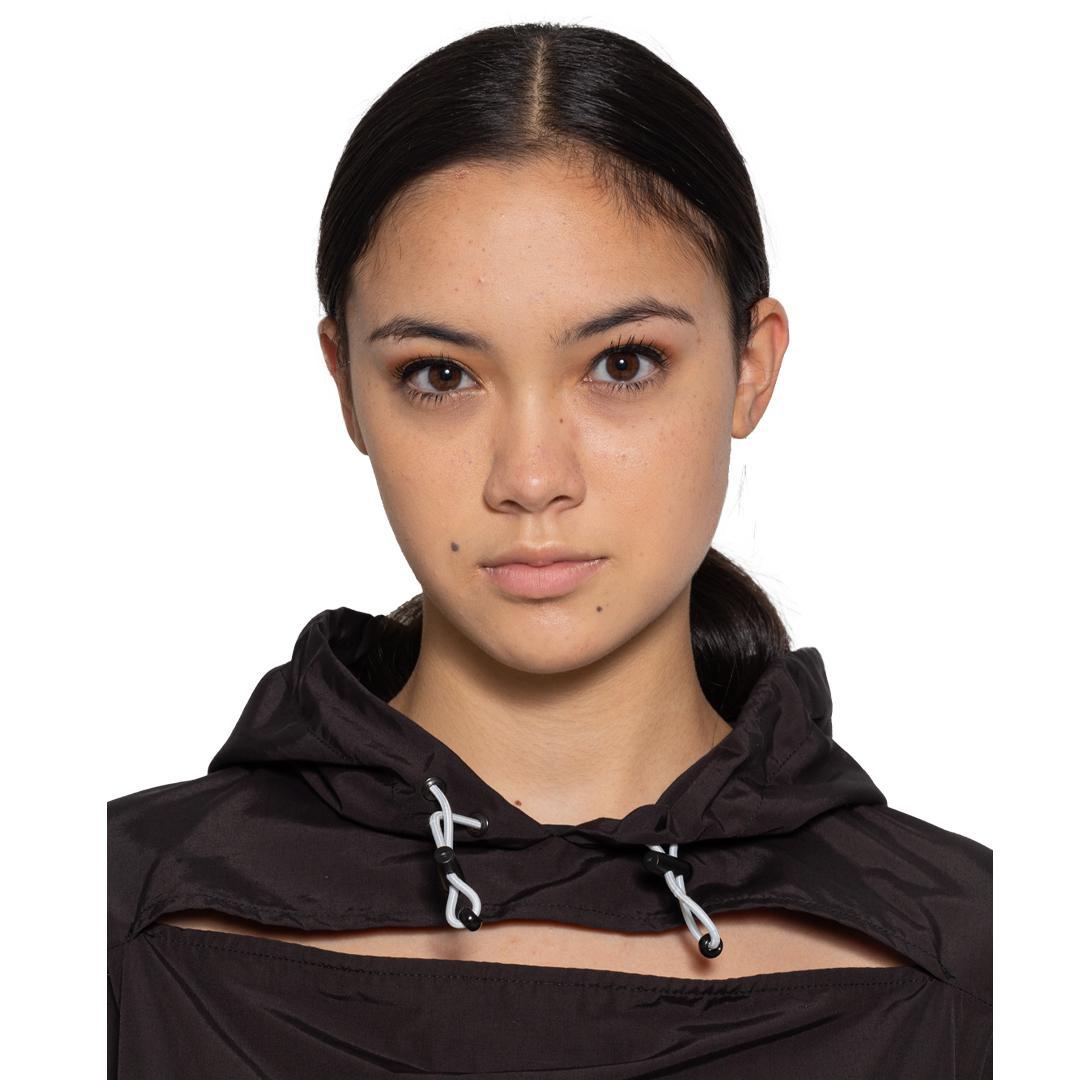 Black nylon windbreaker cropped at high waist with adjustable elastic pulls. Adjustable elastic pulls also in the hood, with slit detailing along the sleeves and front.
