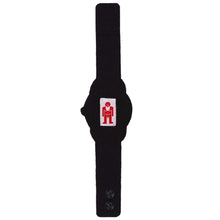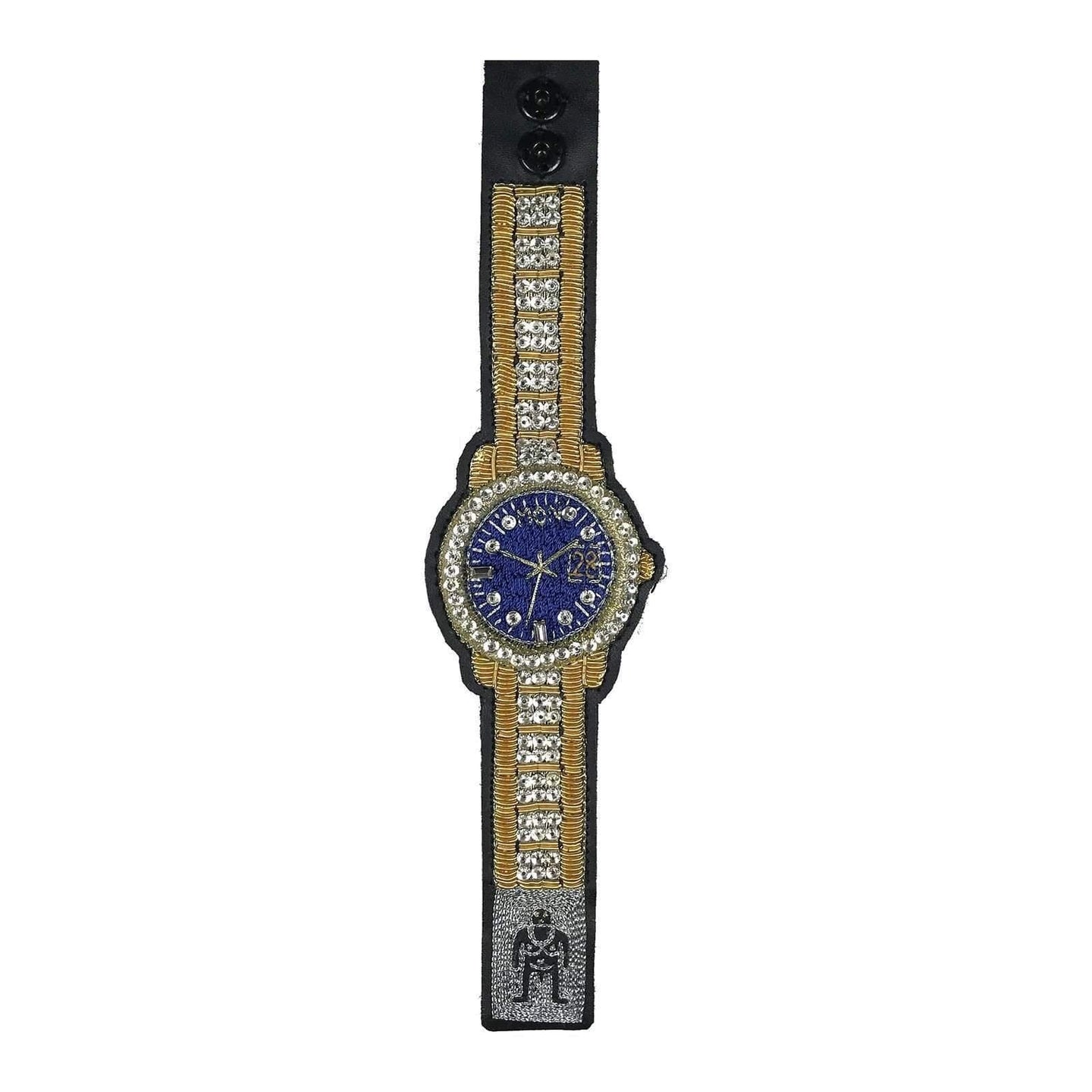 Continuing his never ending experimentation with materials; glass beads, metal yarn, and artificial stone (along with other materials) come together to form a particularly famous dive watch face. Branding tag on inside of bracelet and “Walterman,” embroidery on strap. Adding to the long line of iconic jewelry by Walter Van Beirendonck.