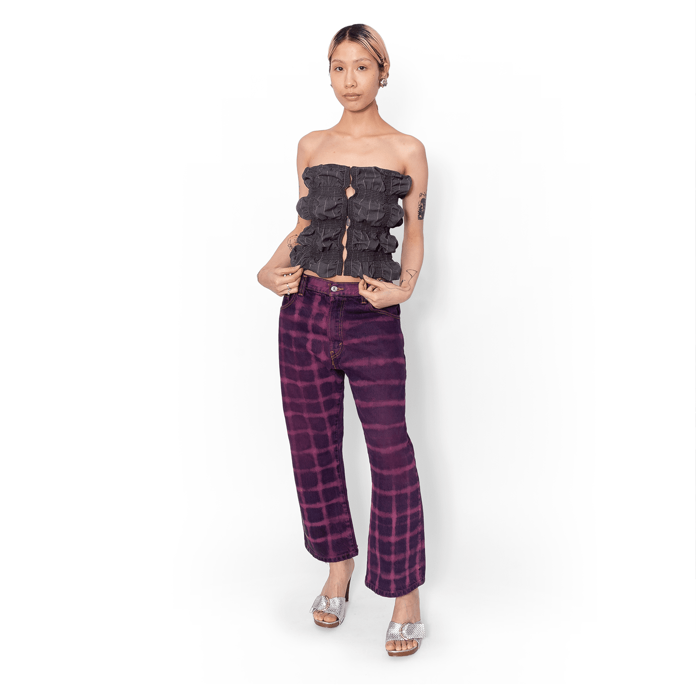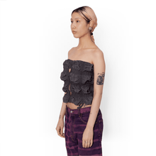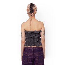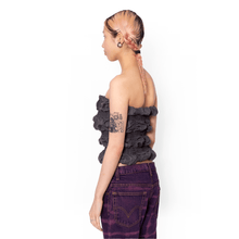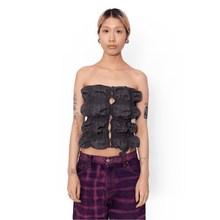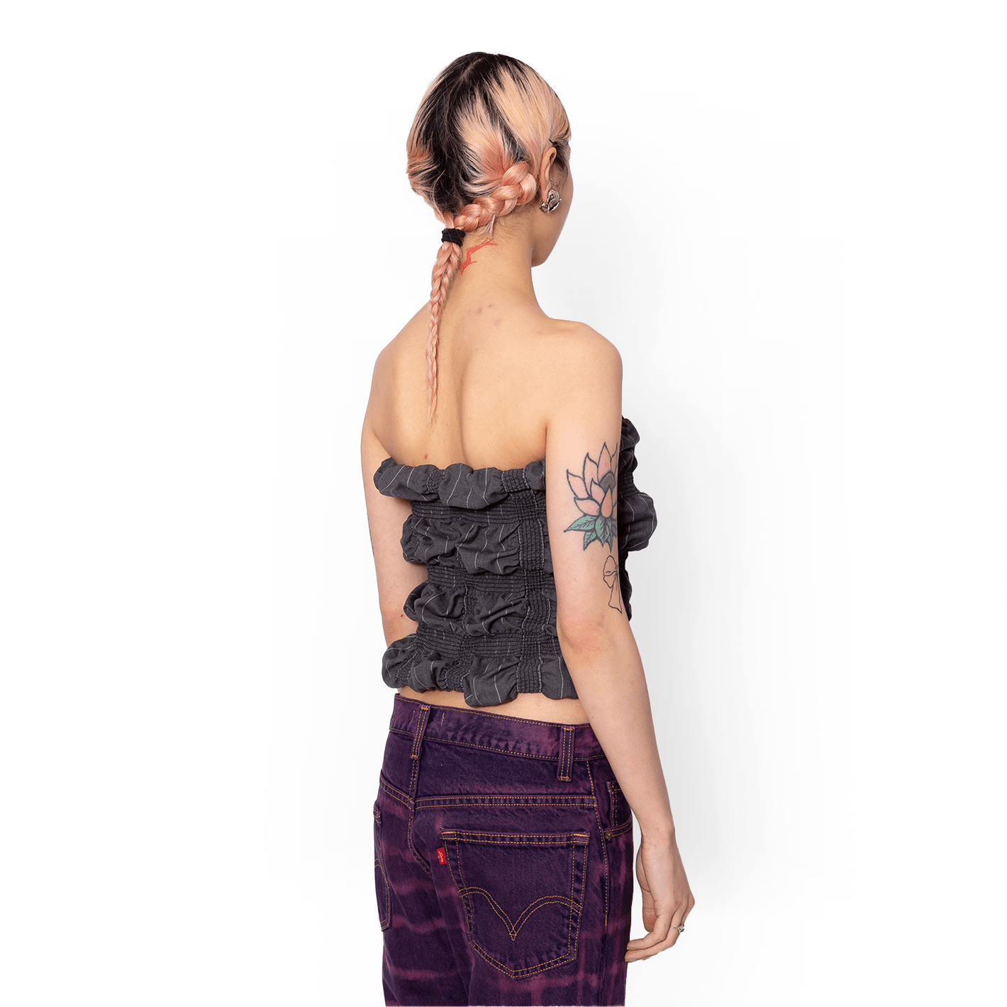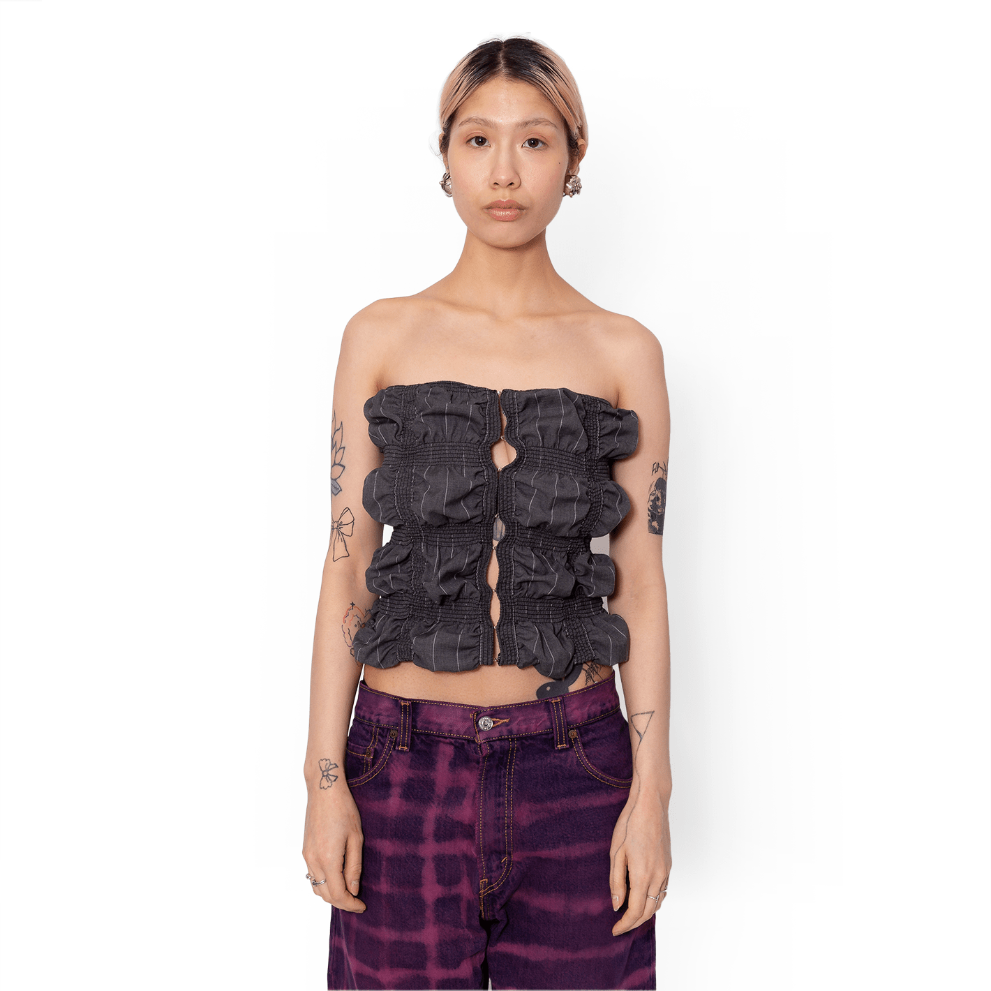 Charcoal corset top with hook and eye closures at the front. White pinstripes. Handmade in NYC with deadstock fabric. 80% Cotton, 20% Elastic. Dry clean only.