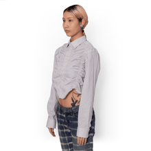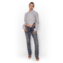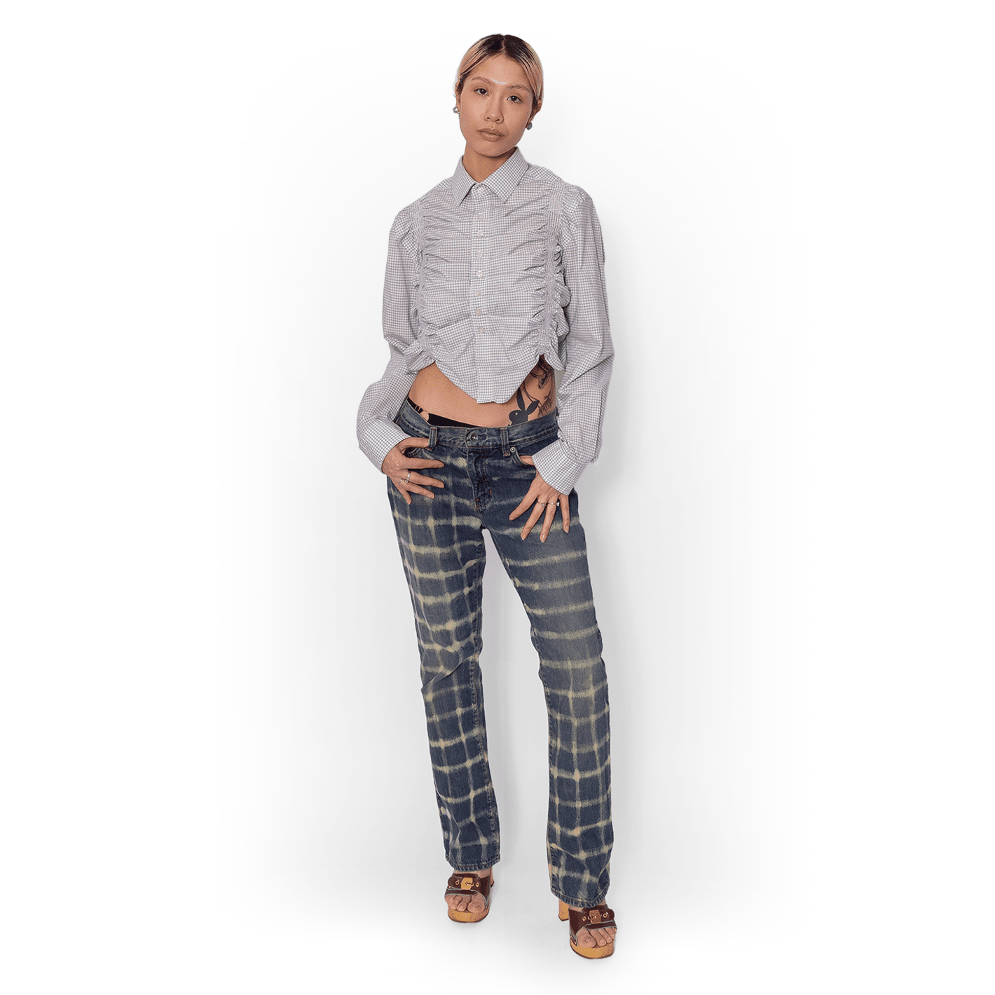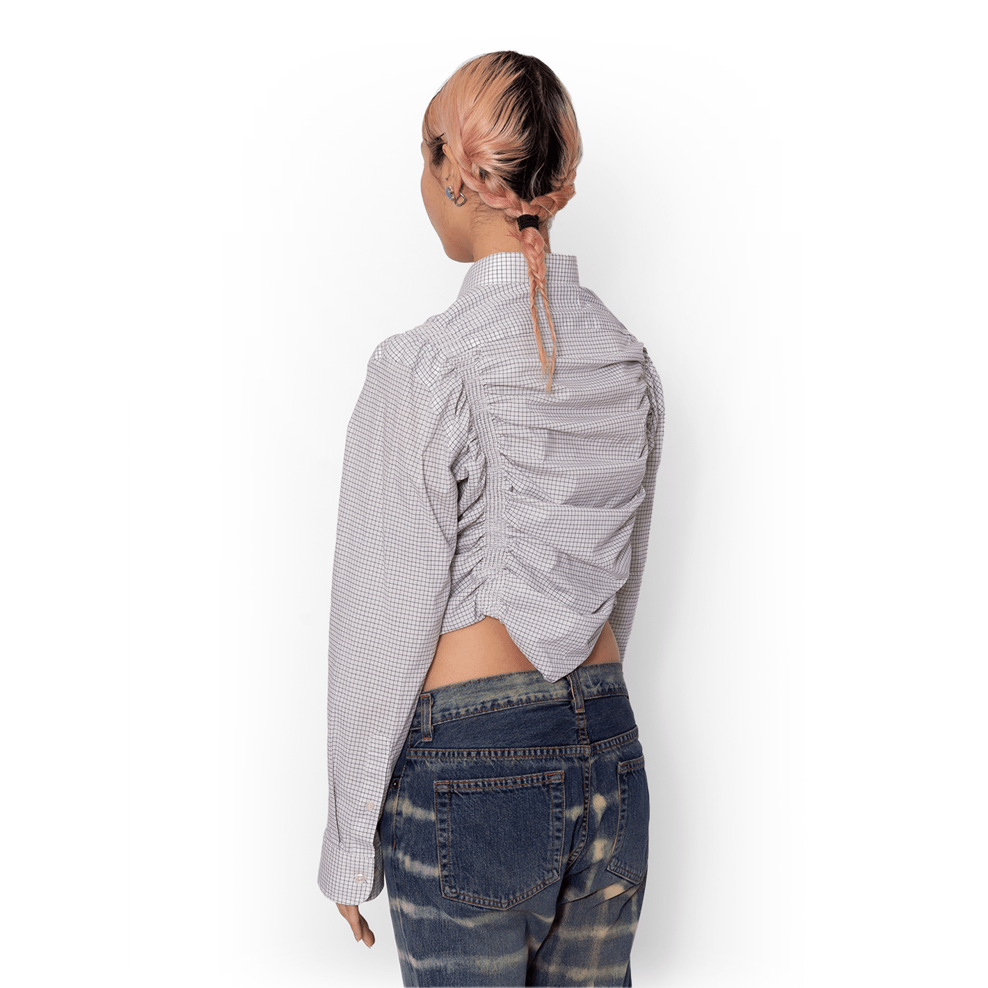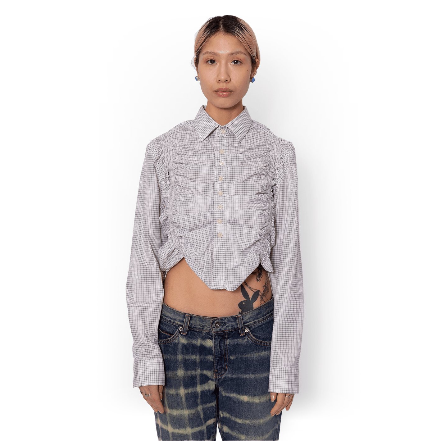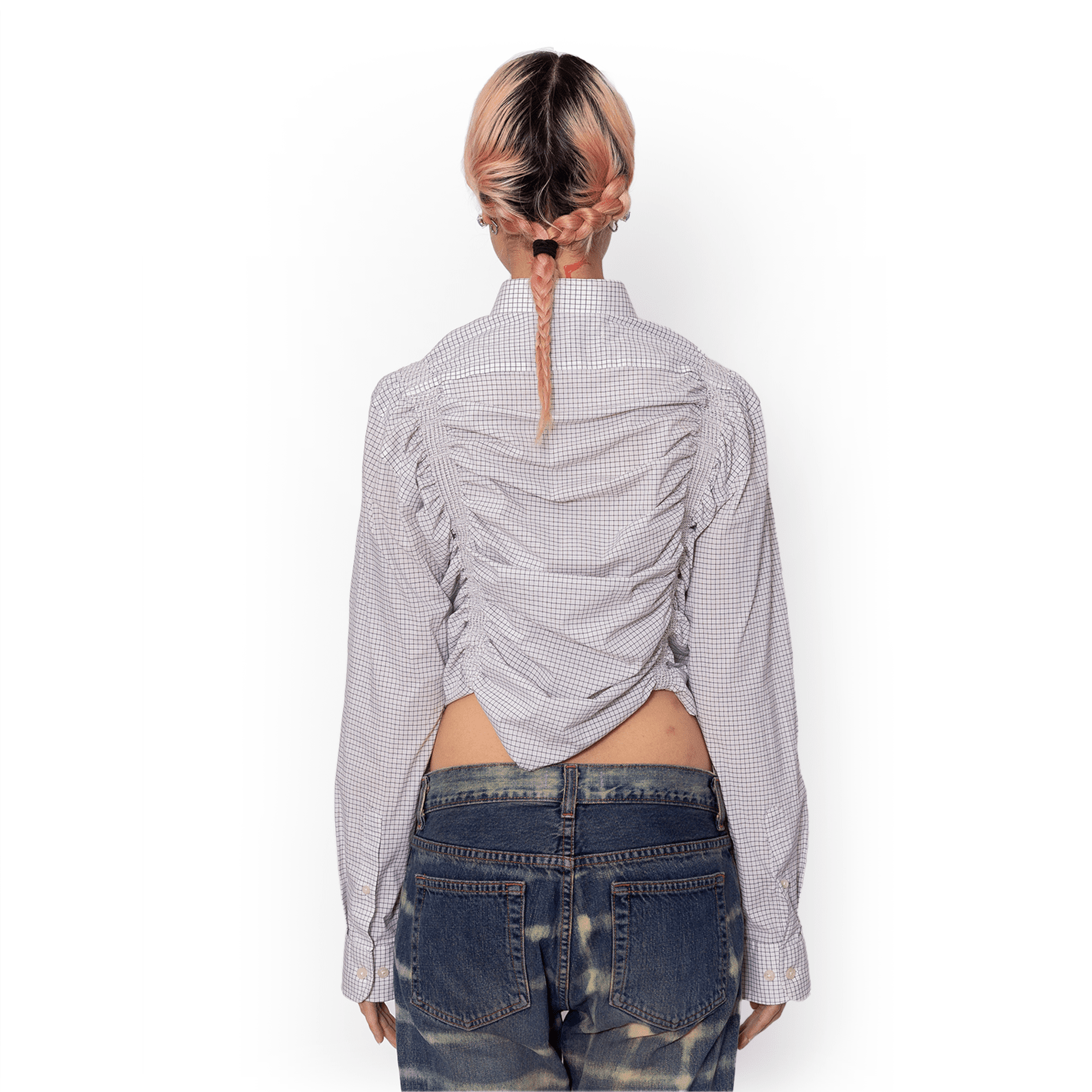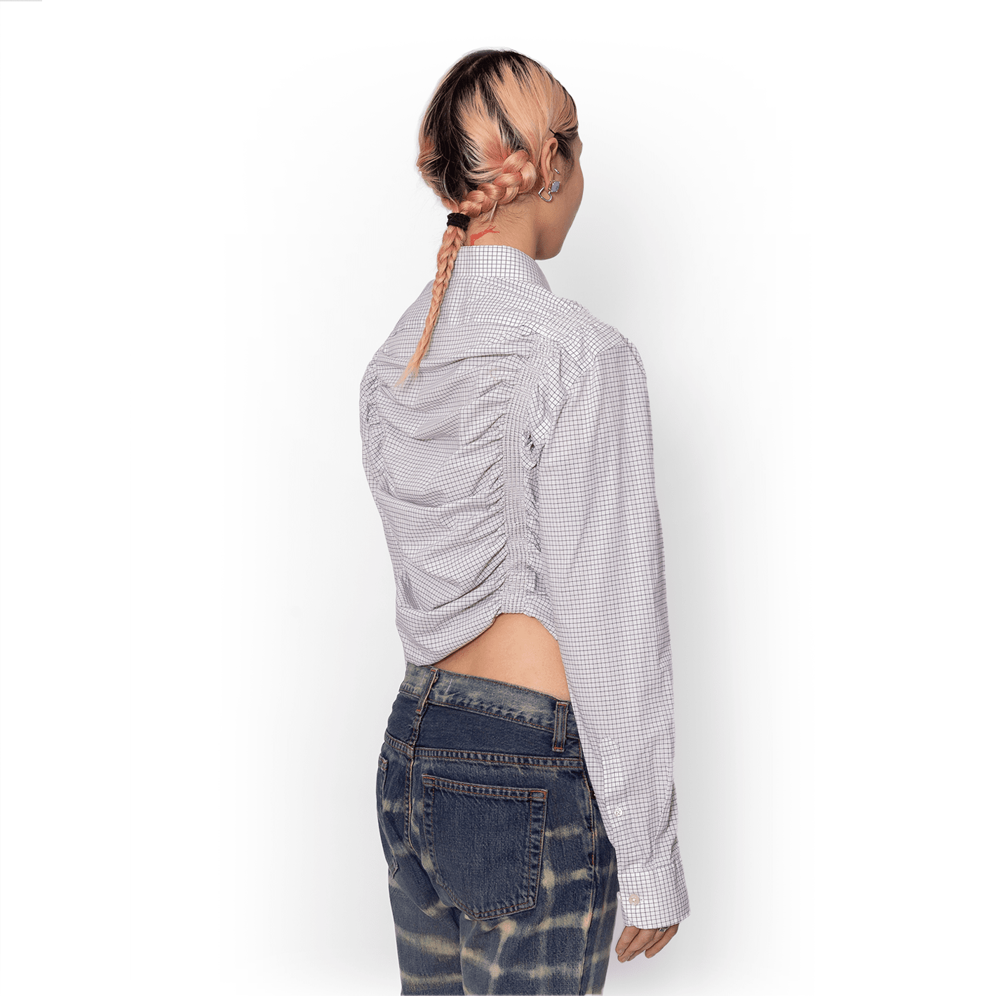 One-of-one reworked button down shirt, in graph paper pattern. White with blue checks. 100% Cotton and elastic. Hand wash cold or dry clean.