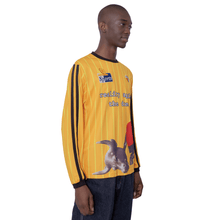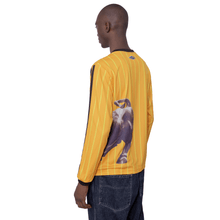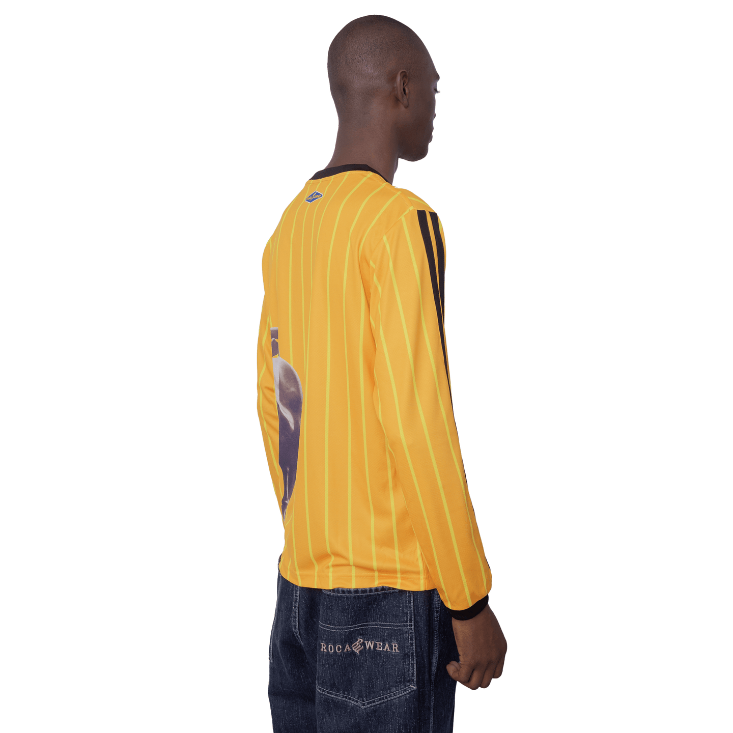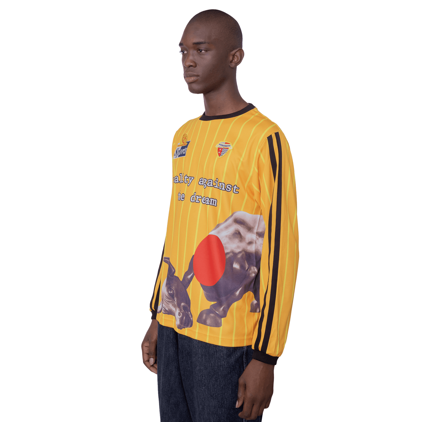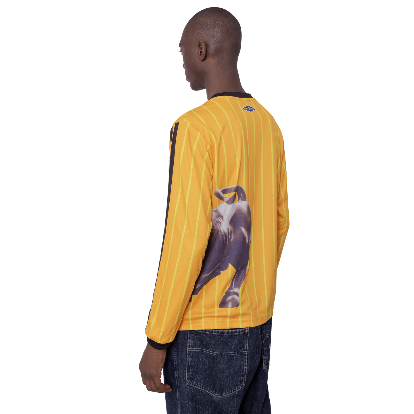 Gold and black pin-striped long sleeved jersey featuring "Reality Against the Dream" on chest with wrap-around Bull graphic. Matching collar and cuffs for effortless sporty look.