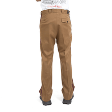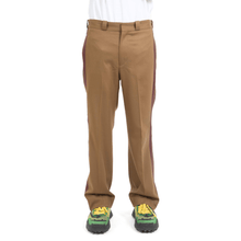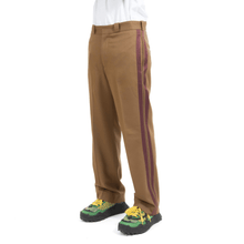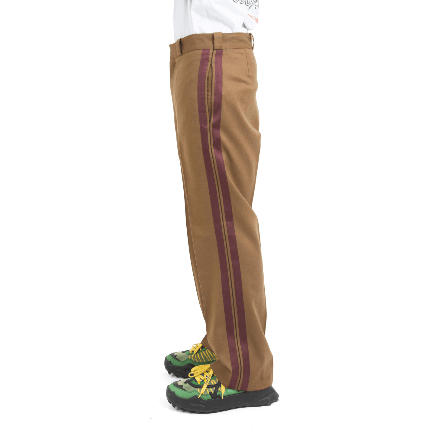 Beige tuxedo trousers with burgundy piping. Straight fit. Featuring 3 pockets, two front pockets and one rear right pocket. A great casual dress pant.