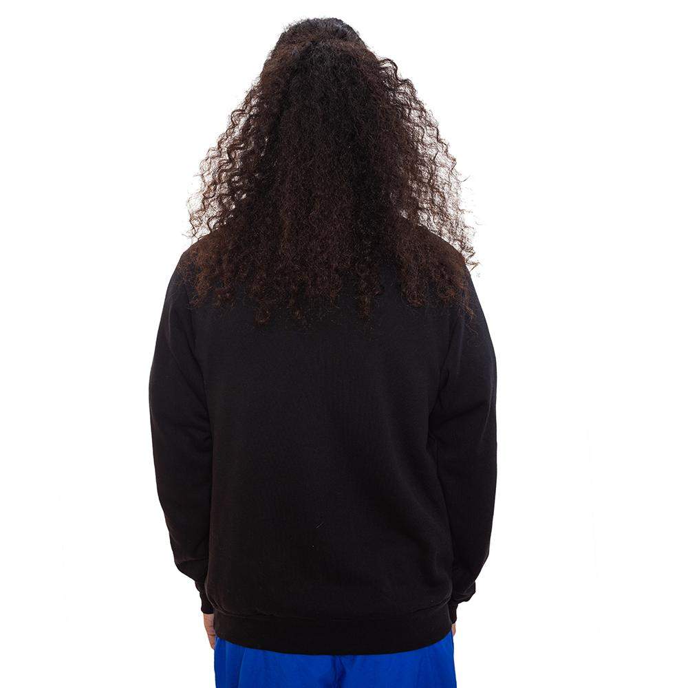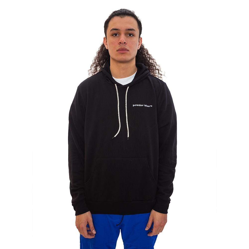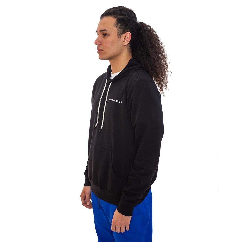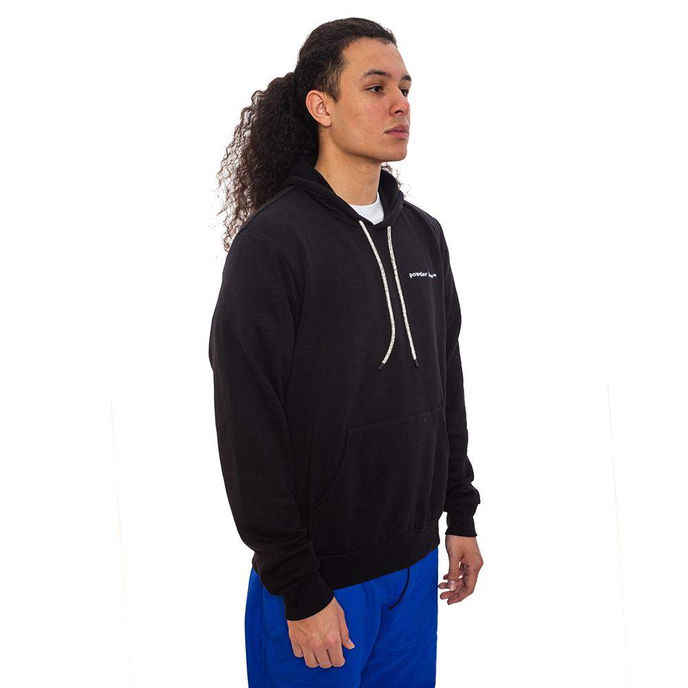 Black hoodie with white embroidered logo and crystal drawstrings.