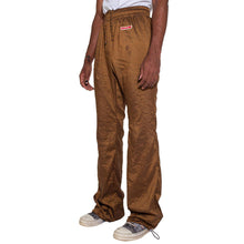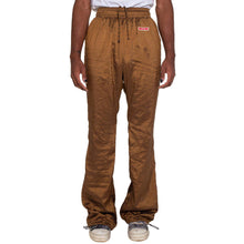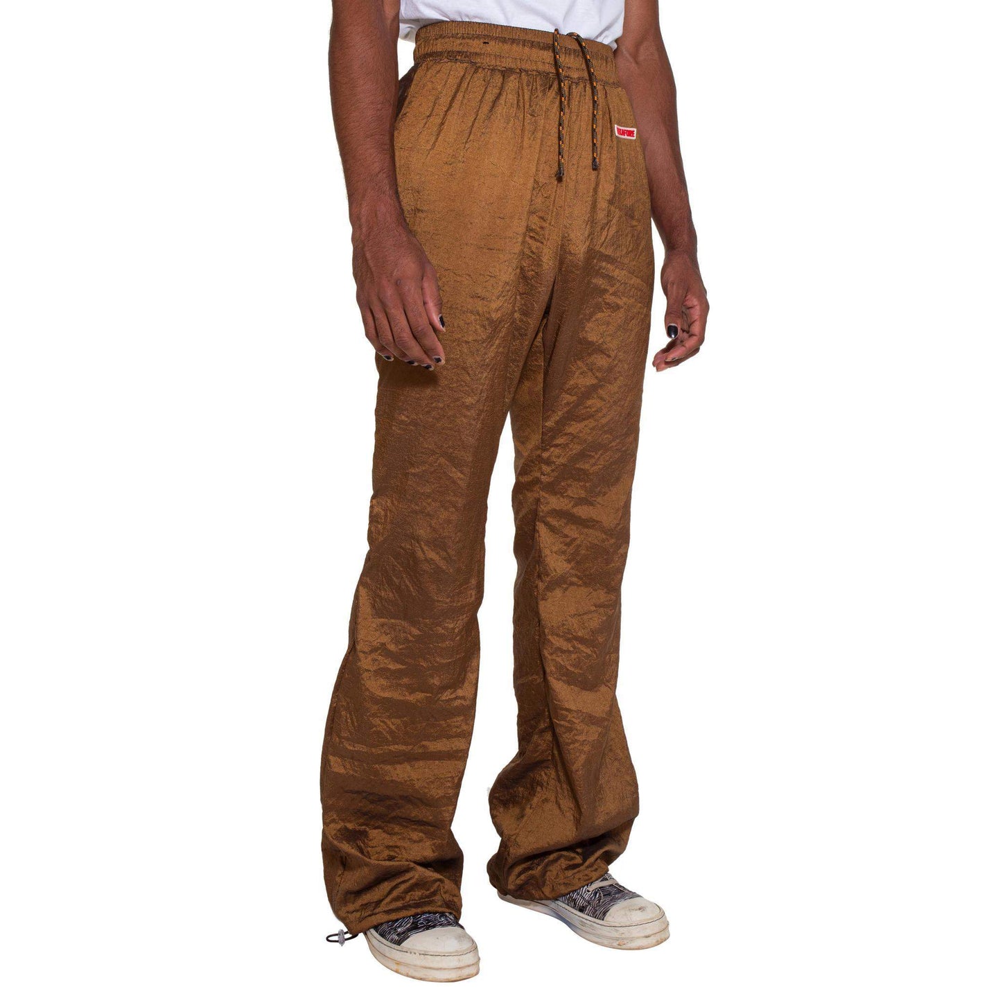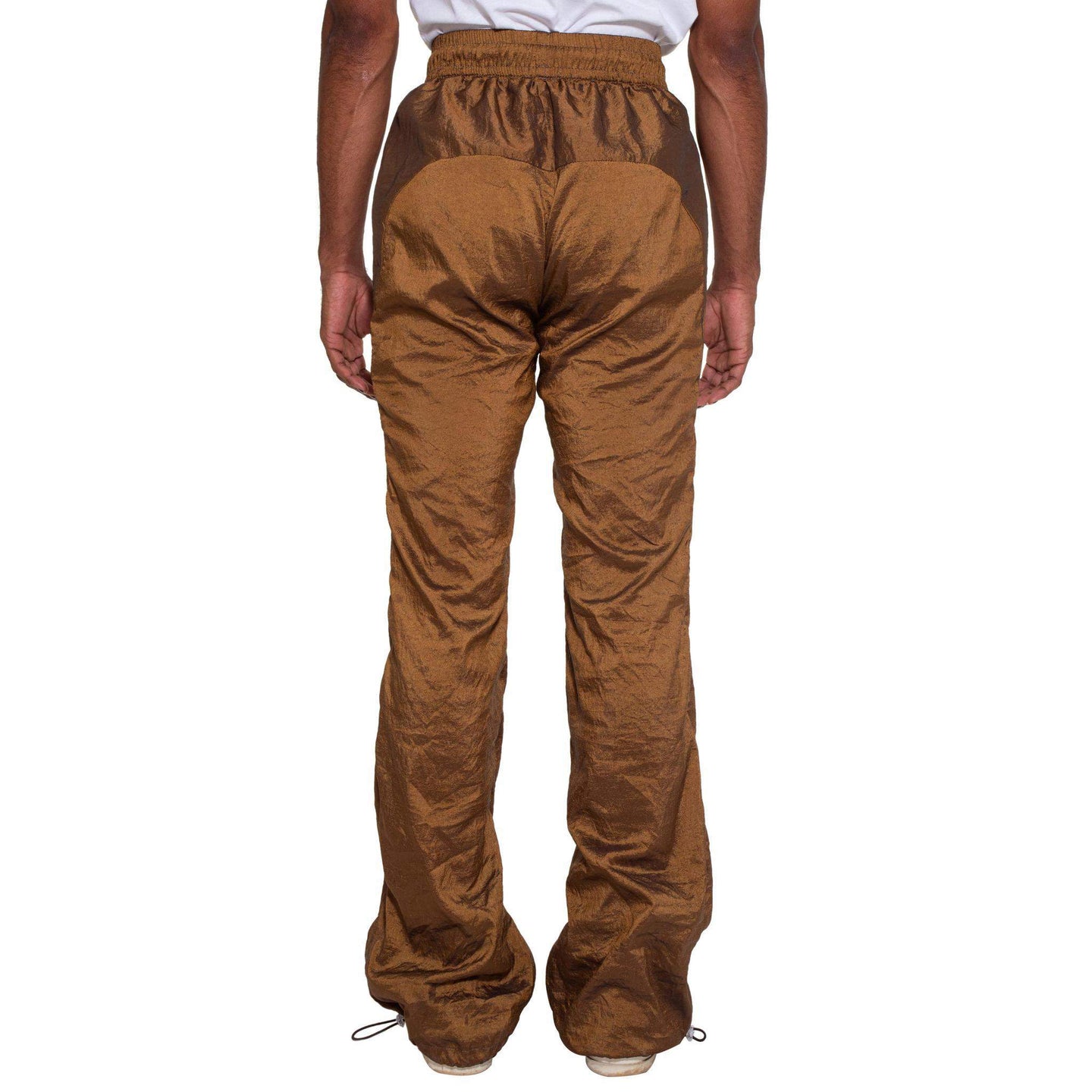 Metallic brown nylon track pants with two front side pockets, rubber logo patch, and adjustable ankles.