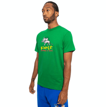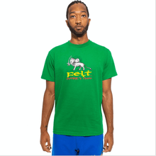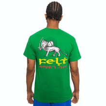 Green screen printed 6oz 100% cotton shirt with printed neck tag.