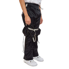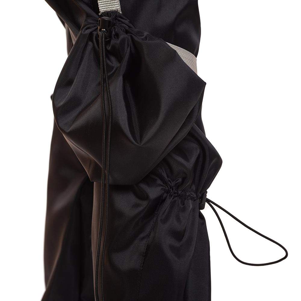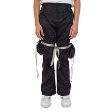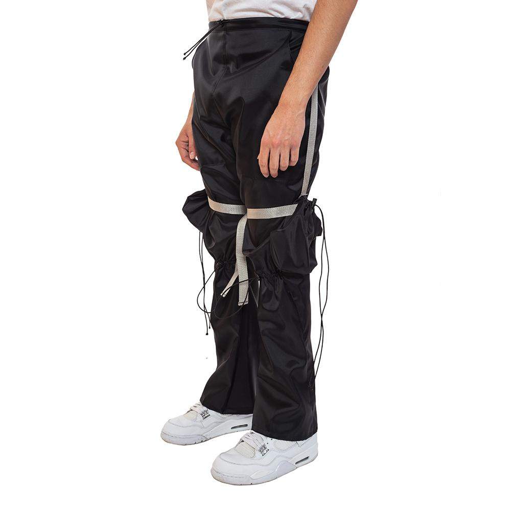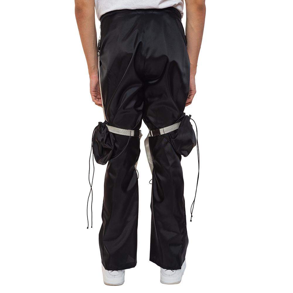 Handmade nylon pants with adjustable drawstrings at the knee, two front pockets, removable cargo pockets with adjustable strap, and drawstring closure on the pockets.