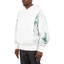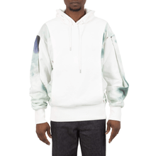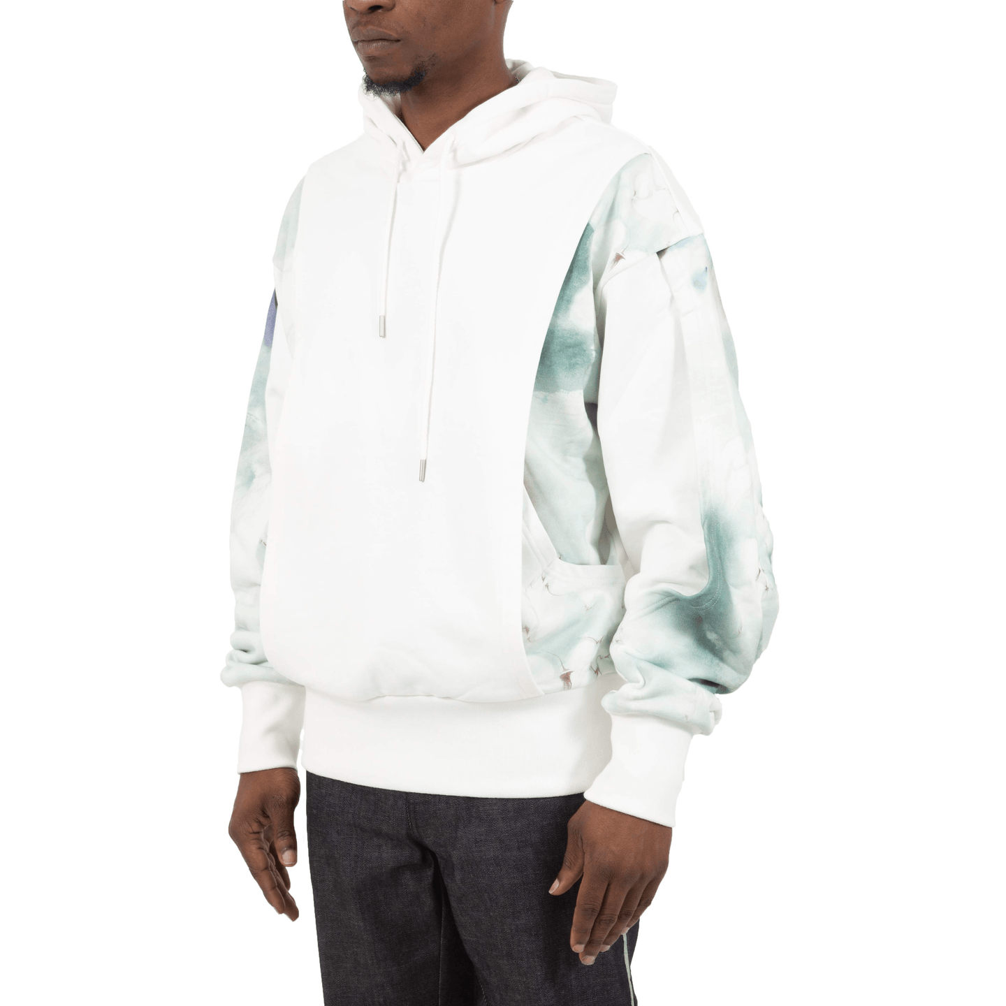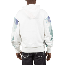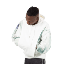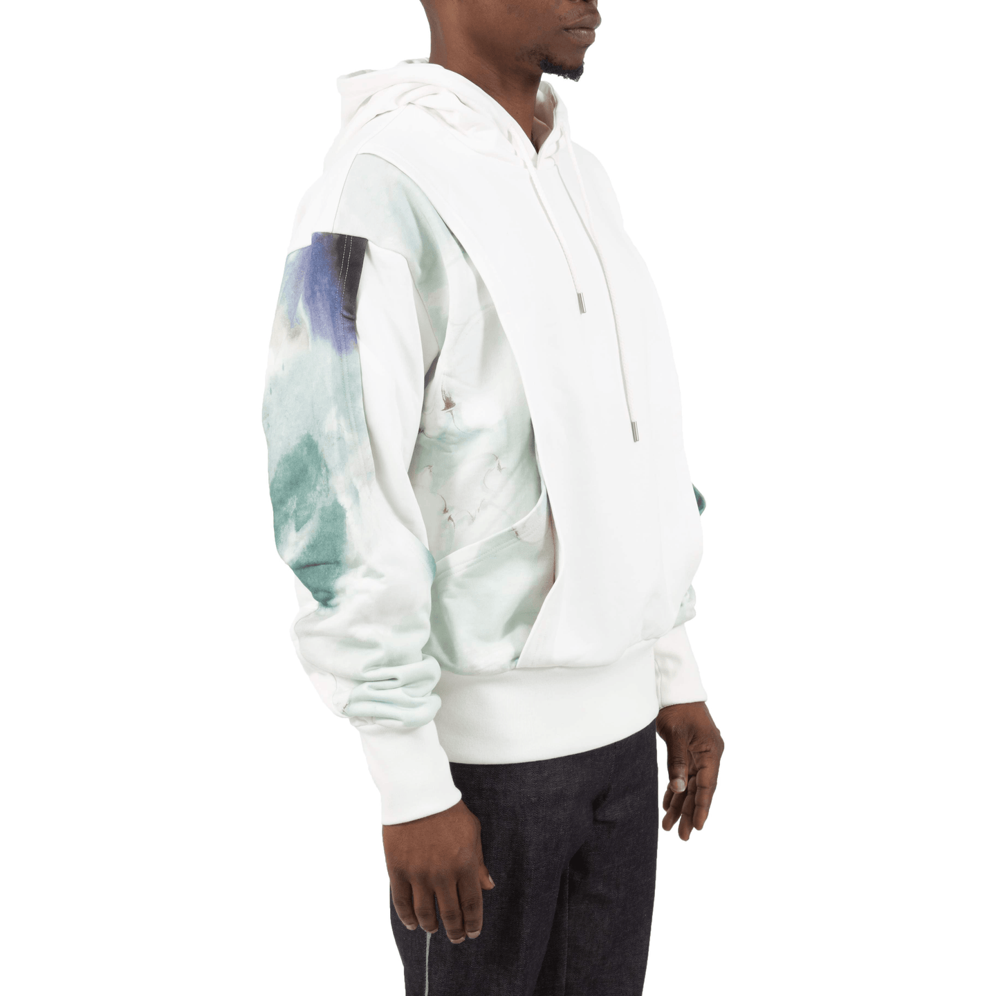 Long sleeve French terry hoodie in white featuring watercolor graphic pattern printed throughout, layered construction, drawstring hood, partially concealed kangaroo pocket at waist, and rib knit cuffs and hem.