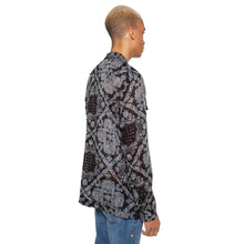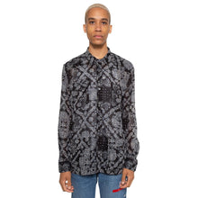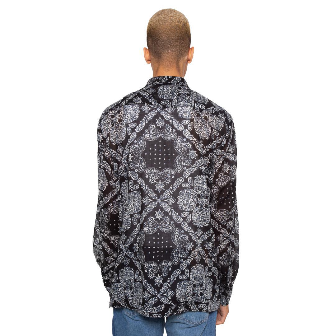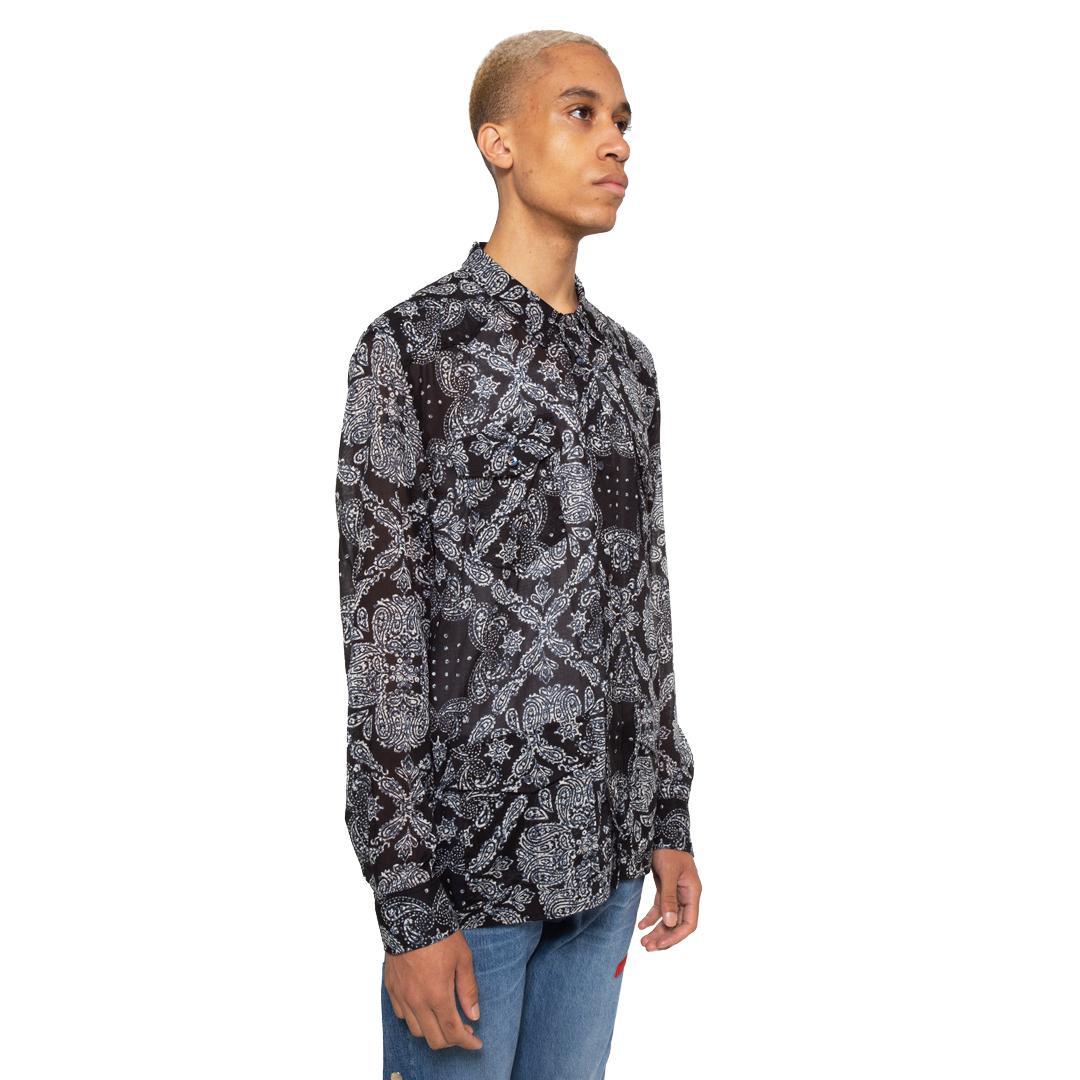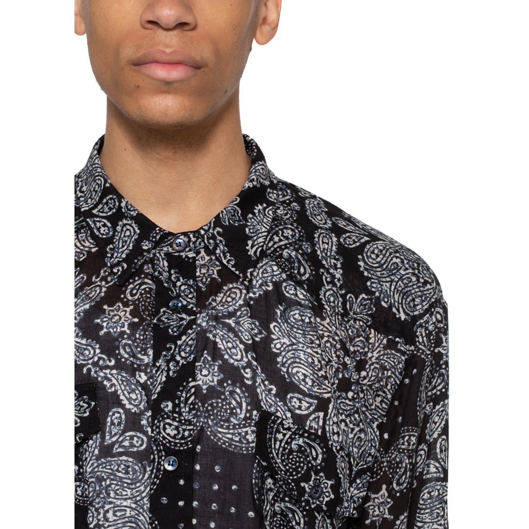 Inspired by the guayabera shirts of the Caribbean, this black button-up Dojo Shirt has four large front pockets and is made from a Japanese semi-sheer printed cotton. The patchwork bandanna work and the inspiration for this shirt provide an interesting combination of cultures and influences that lead to an incredibly unique piece.