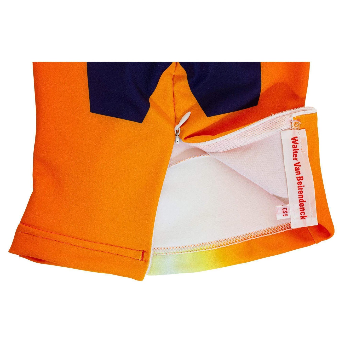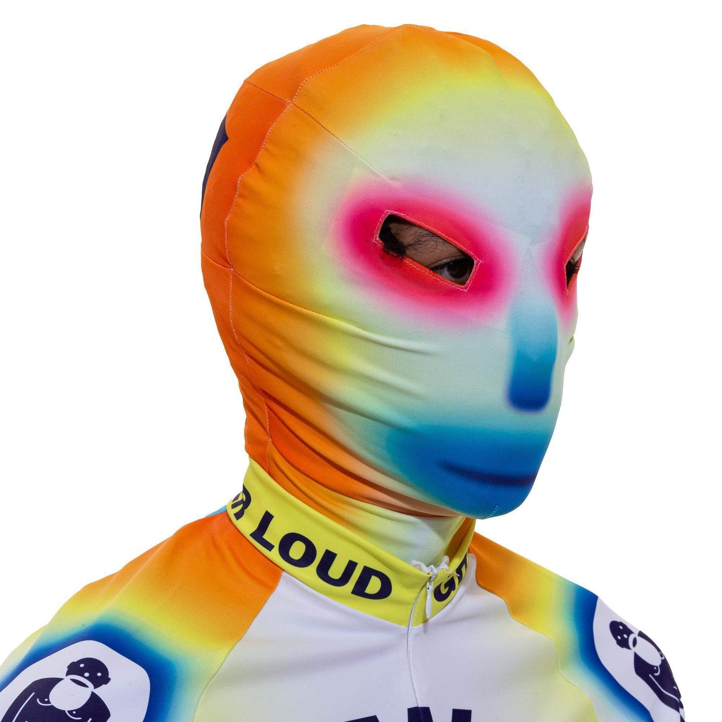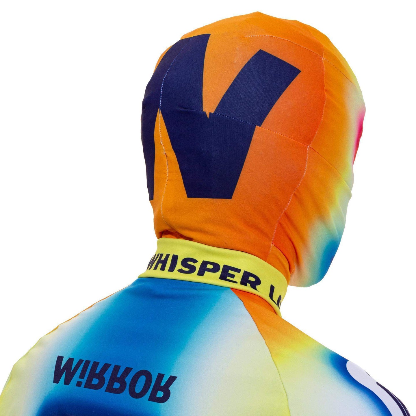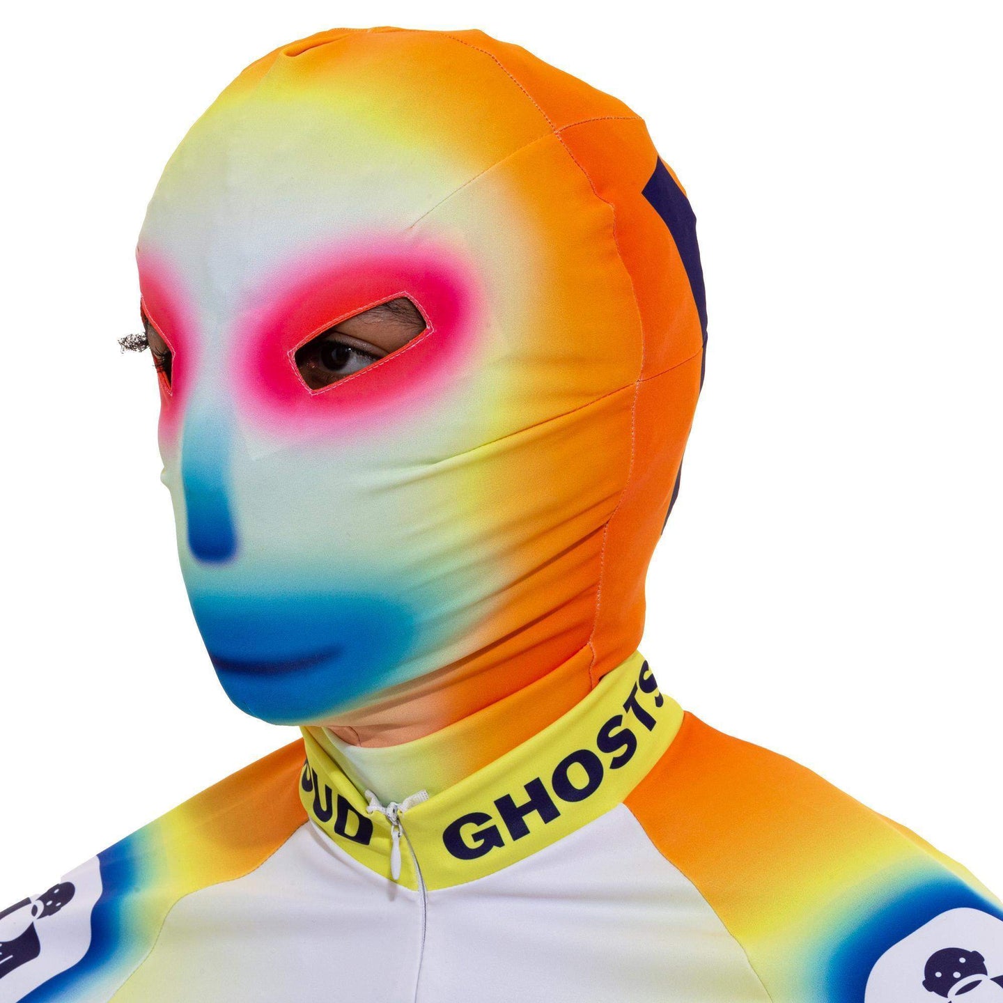 Walter Van Beirendonck's Ghost Morph Mask was released alongside the Ghost Bike Tops and leggings as part of the S/S 21 collection. An elastic stretch mask with zipper closure on the back, featuring a ghostly orange to blue gradient. With a ghostly stylized face on the front and a huge W on the back, this mask is the best way to completely hide but totally stand out at the same time.