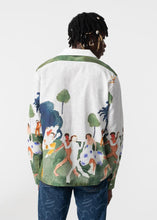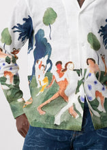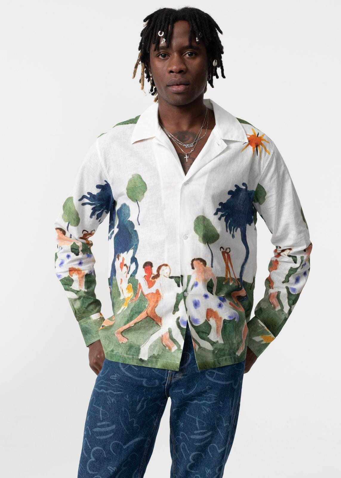 Long sleeve linen cotton blend shirt in cream, featuring graphic pattern printed in multicolor. Button closure at front. Made in Portugal with love.
