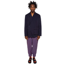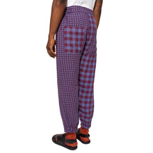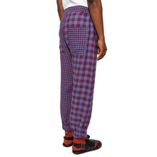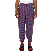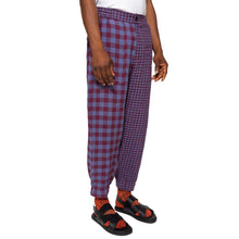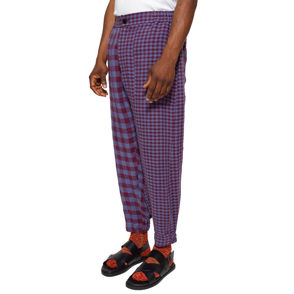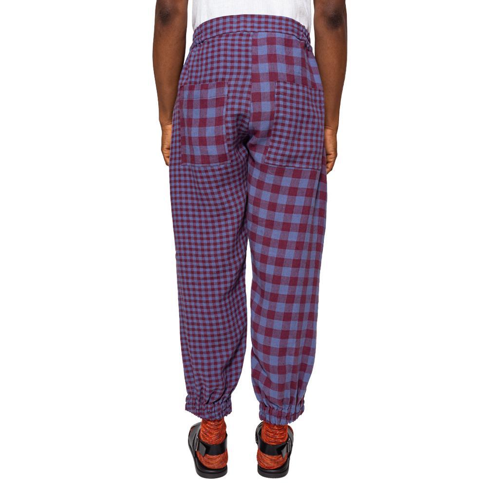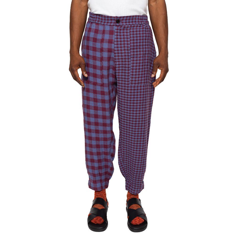 Linen-cotton mix pants in an asymmetric purple check pattern with a gathered ankle provides a unique optical experience and silhouette. Pants are constructed with a front button enclosure and zipper, belt loop, and side pockets.