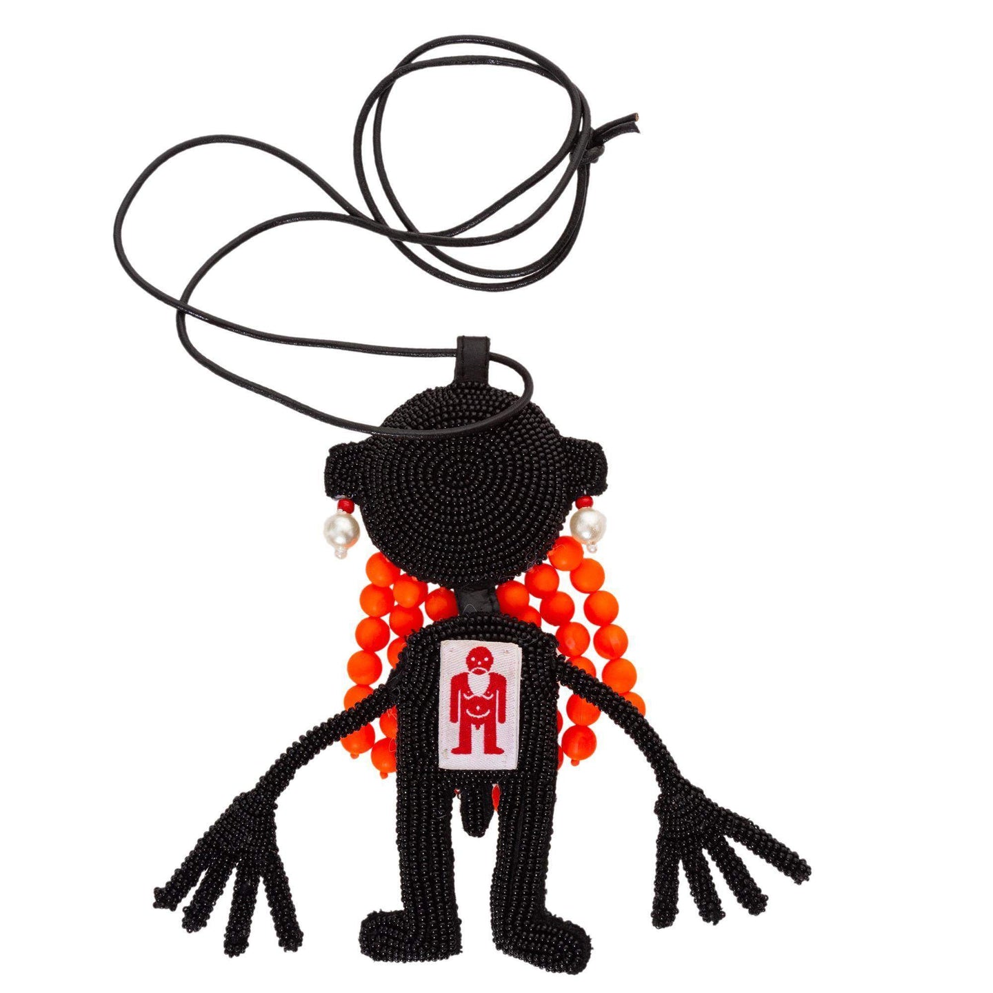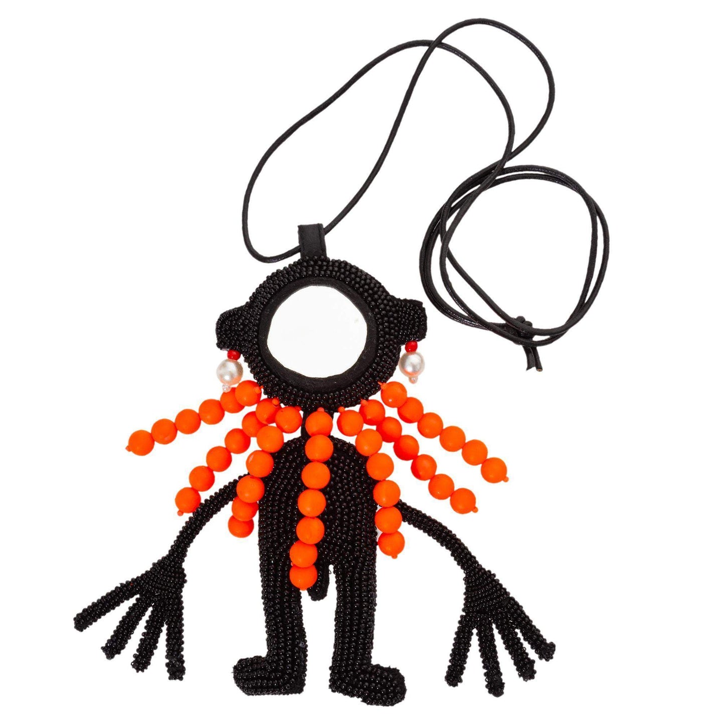 Walter Van Beirendonck Mirror Man. Hand beaded black figure with a mirror face, orange beaded beard details and poseable arms.