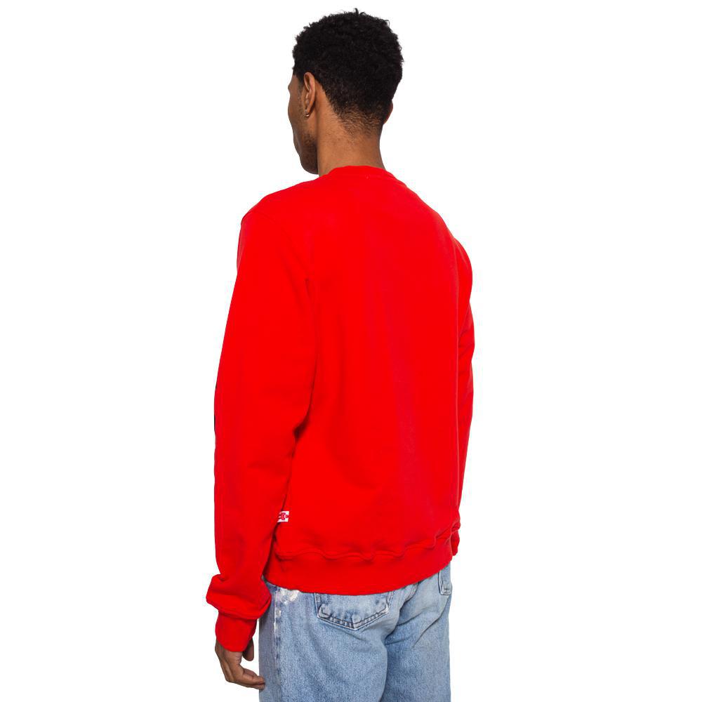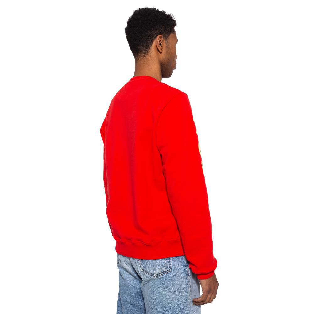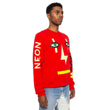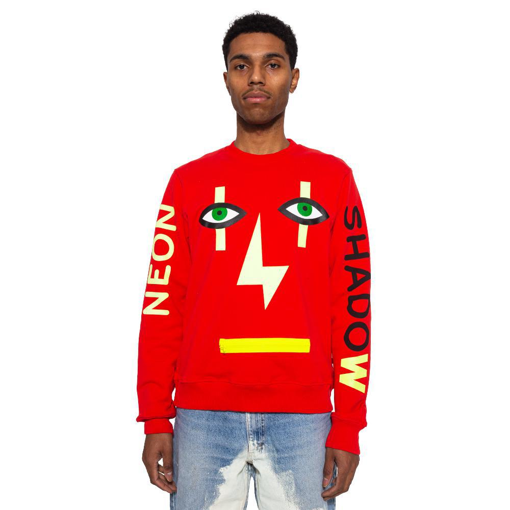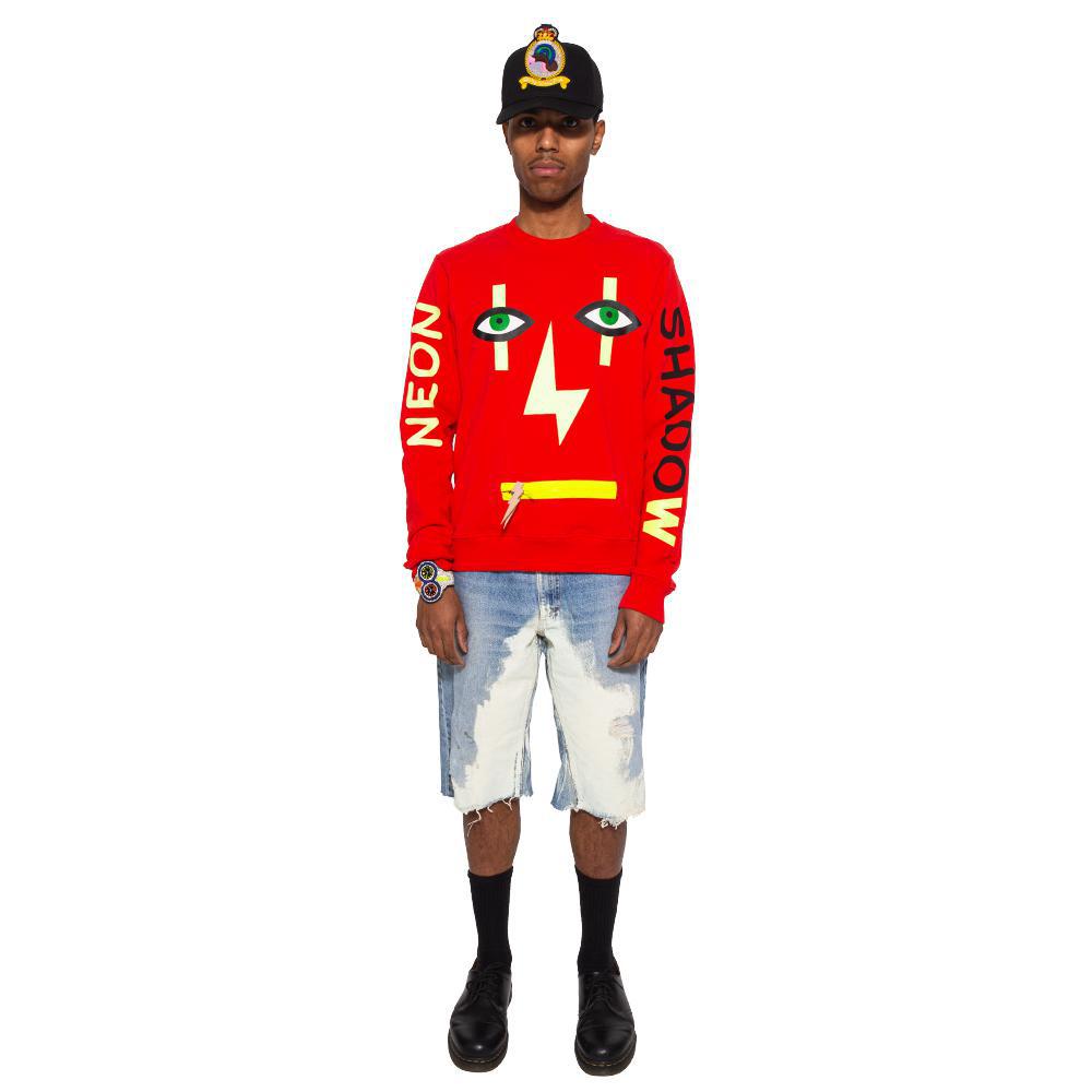 Bright red crew neck sweatshirt with black and yellow collection title “Neon Shadow,” on sleeves, with a “Walterman,” logo tag on hip. The eyeball jewel and the lightning clip from the collection make a guest appearance on the front, while a zipper mouth completes an uncaring face on the sweater. Surely, you'll be happier than the face on the sweater while wearing this piece.