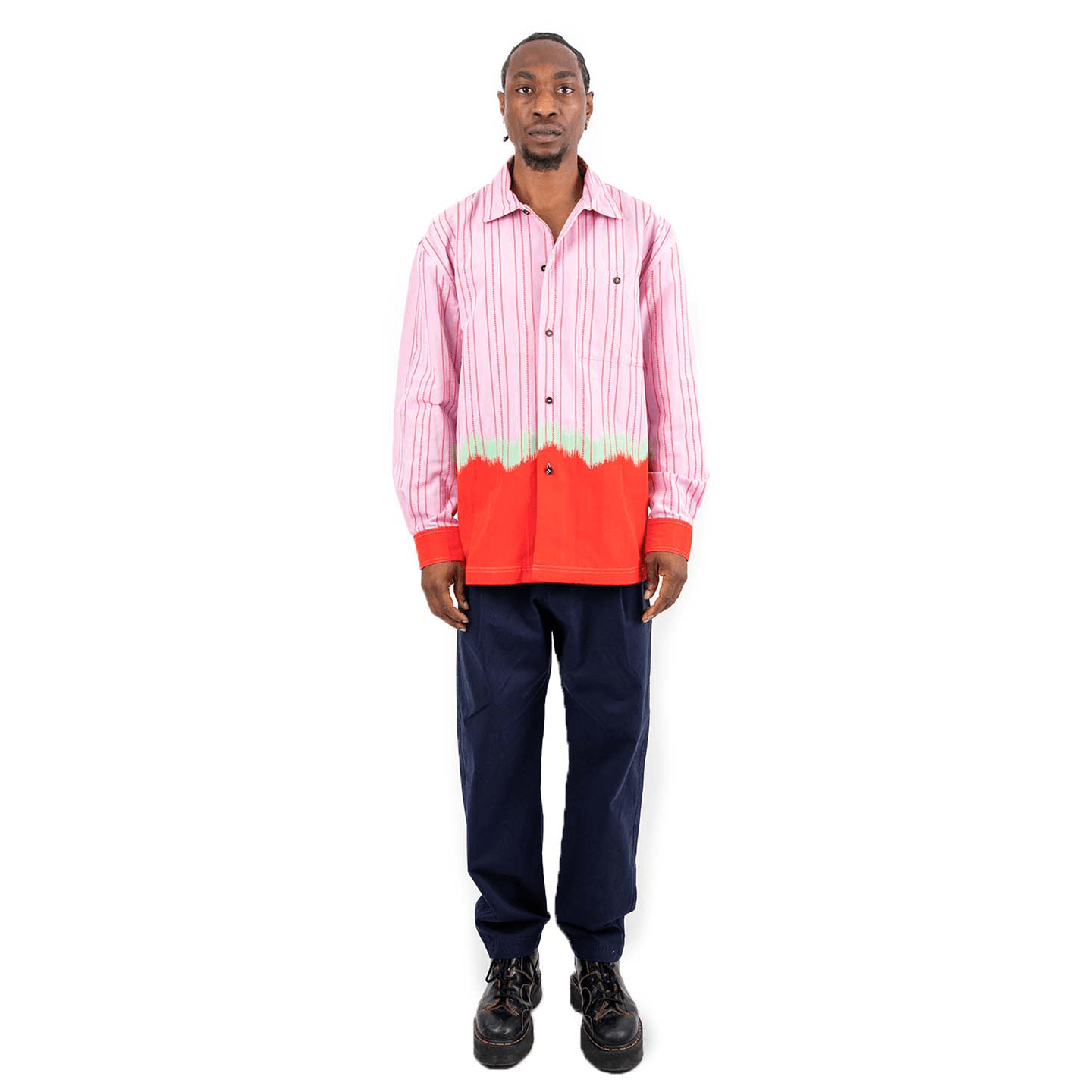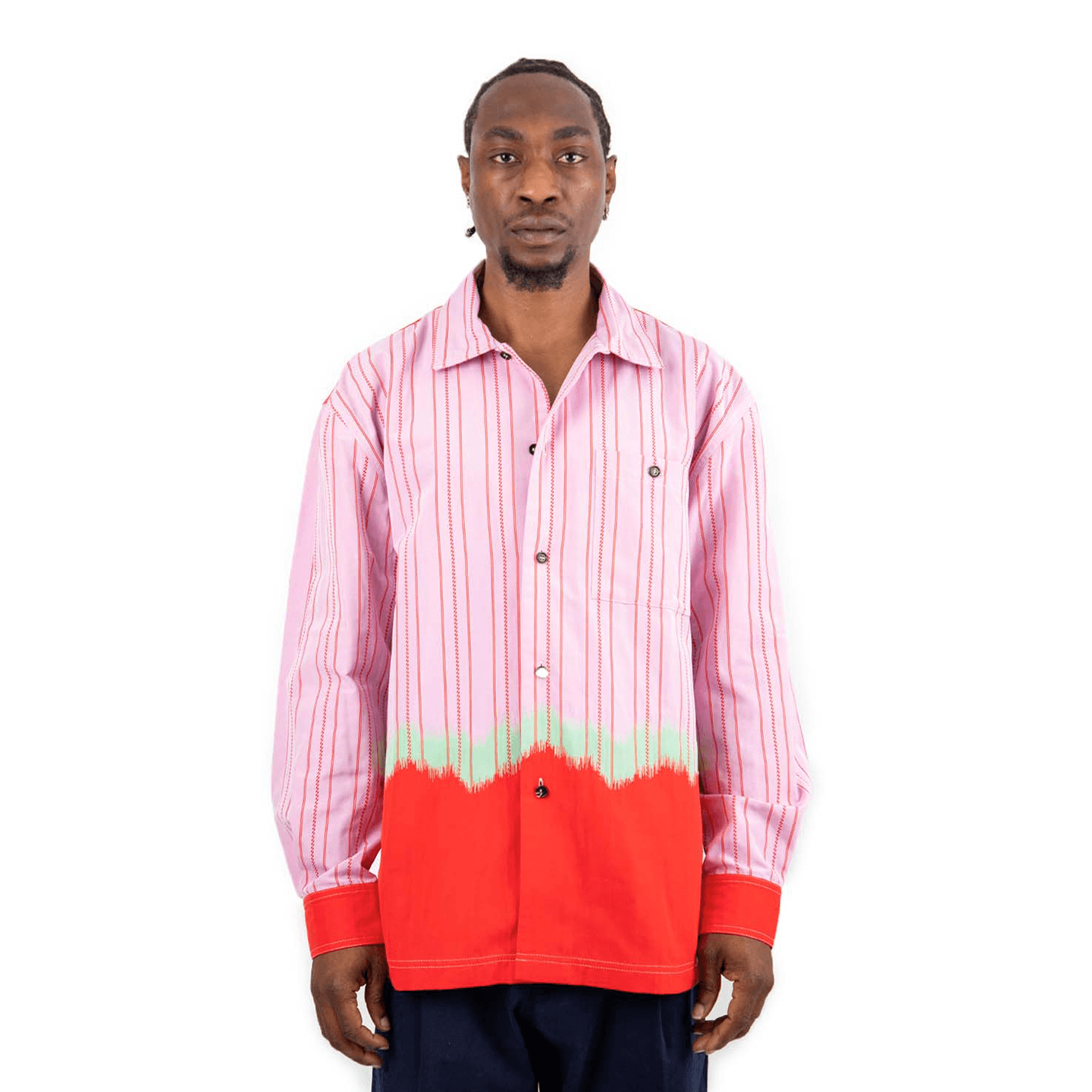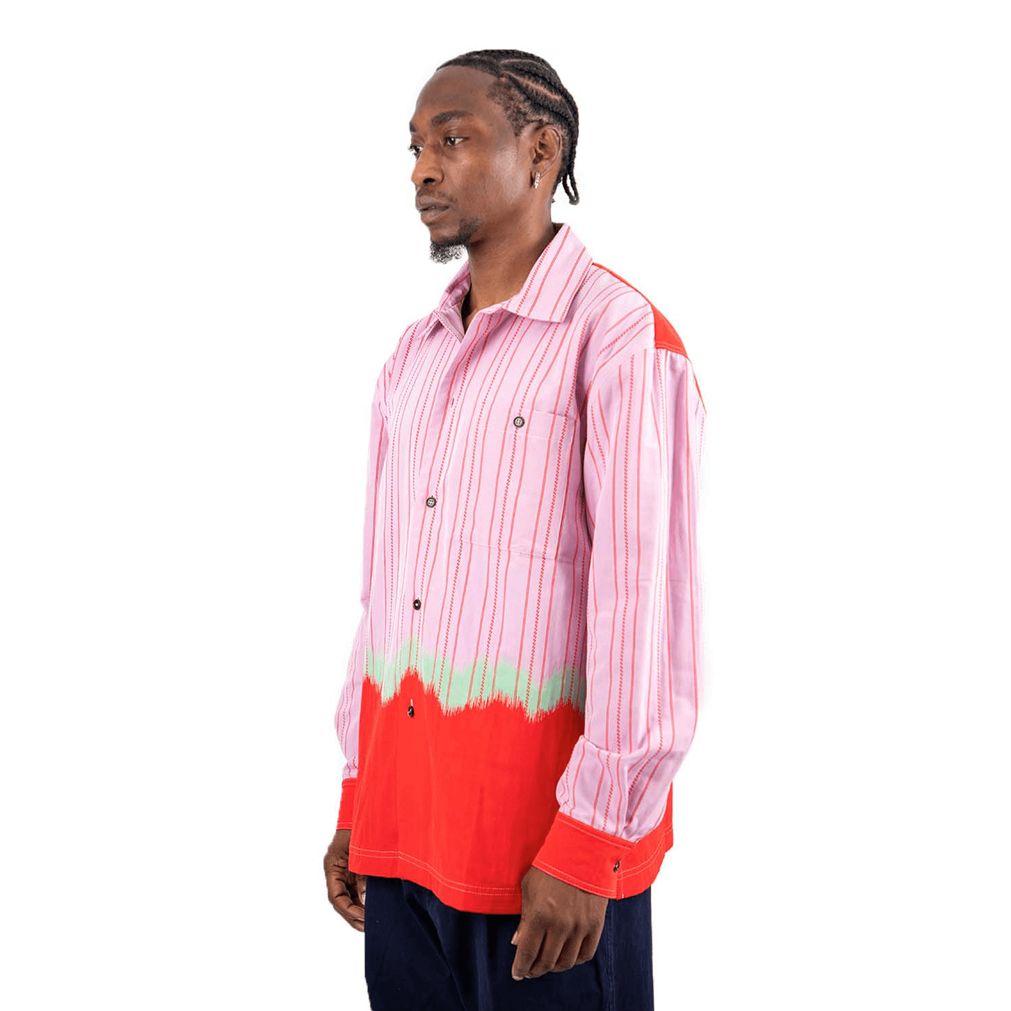 Pink, mint green and red relaxed fit button up shirt with white stitching details. Classic shaped collar with buttoned cuffs.