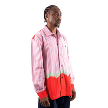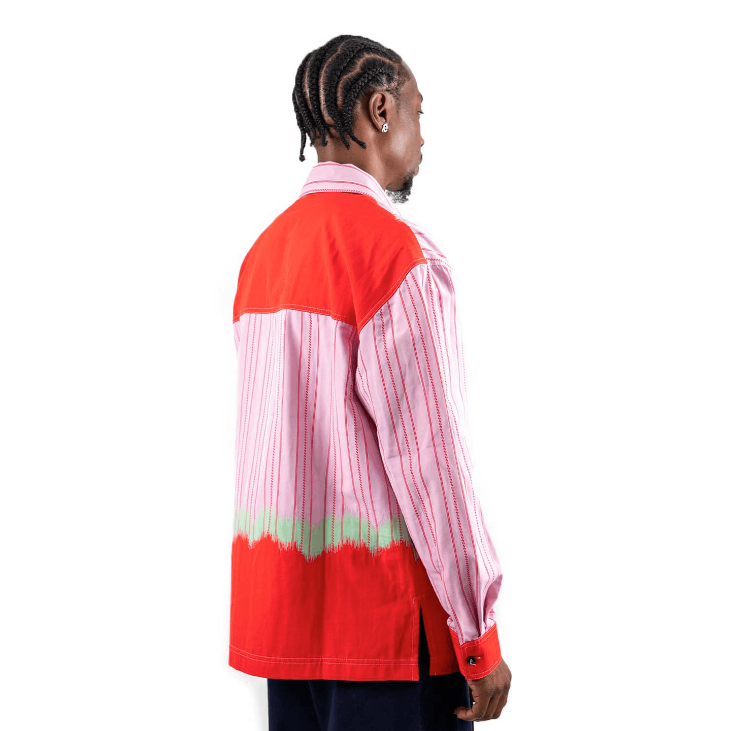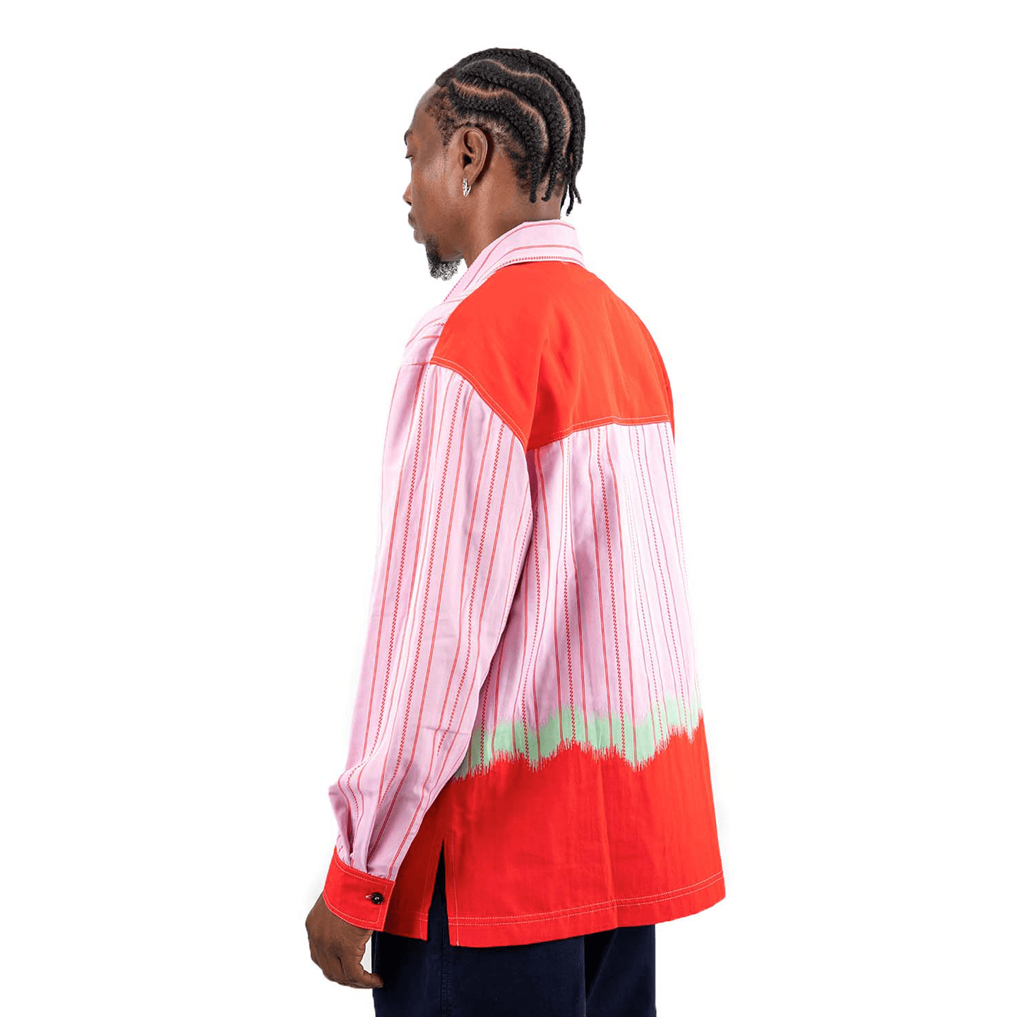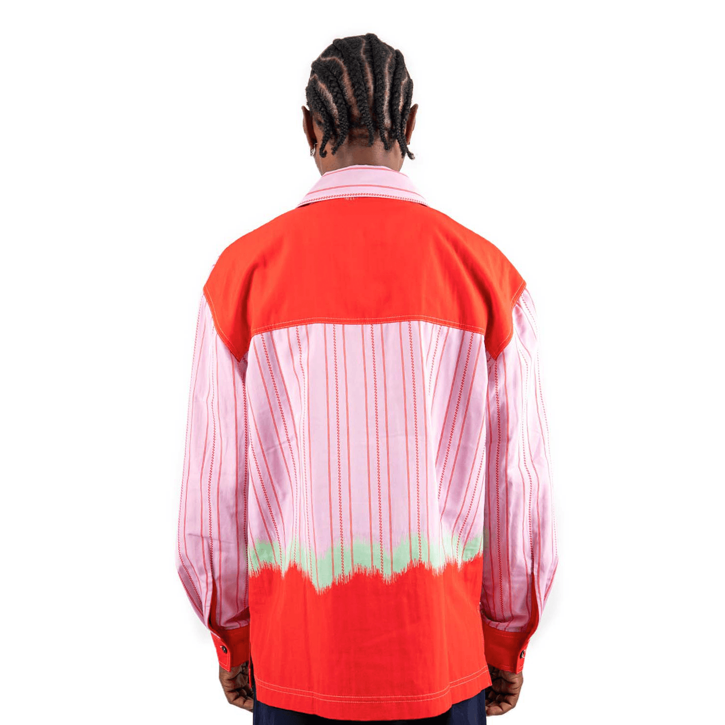 Pink, mint green and red relaxed fit button up shirt with white stitching details. Classic shaped collar with buttoned cuffs.