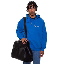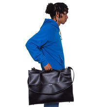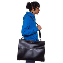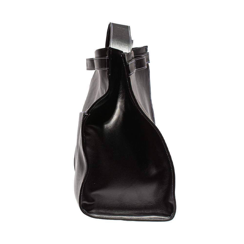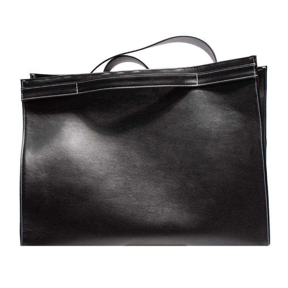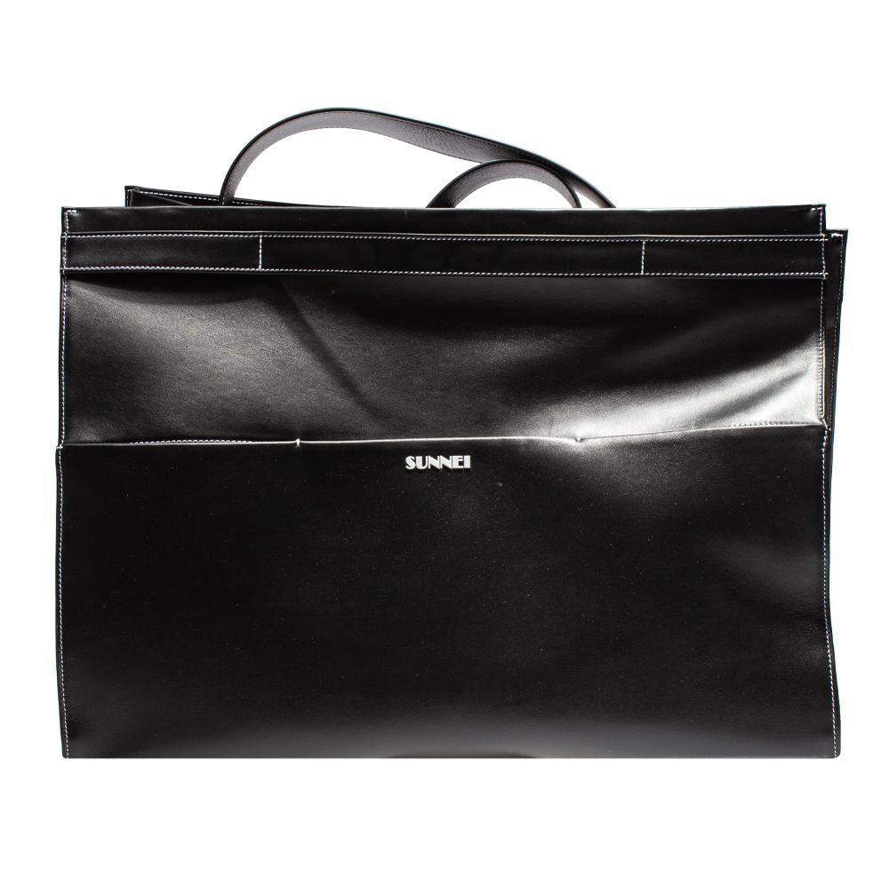 BLACK LEATHER BAG WITH DETACHABLE SHOULDER STRAP AND SHORT HANDLES ON FRONT AND BACK. EXTERNAL PANEL ON THE FRONT MAKING THREE POCKETS. INSIDE LAPTOP COMPARTMENT AND ZIPPERED POCKET. ZIPPERED CLOSURE AND INSIDE LEATHER FINISHING.