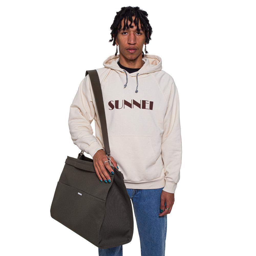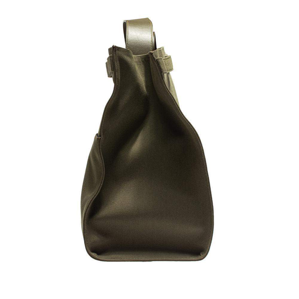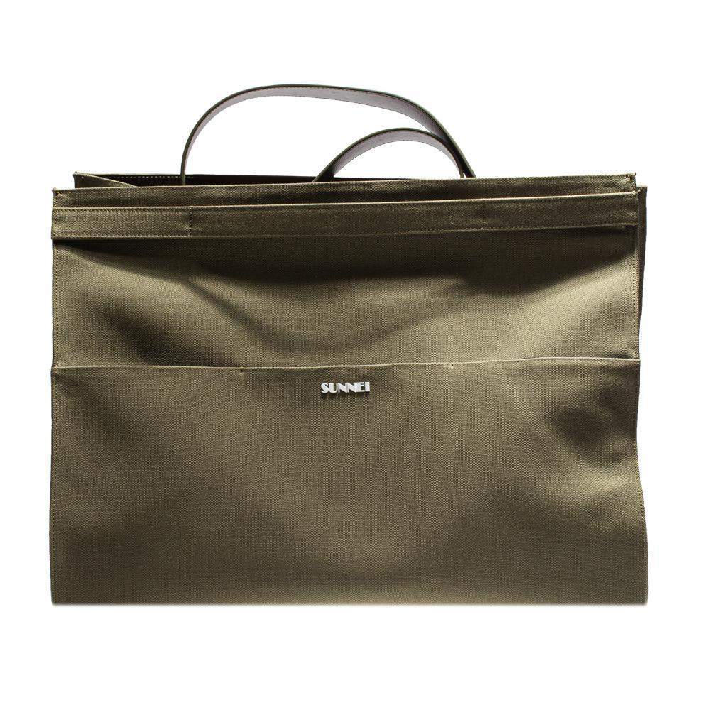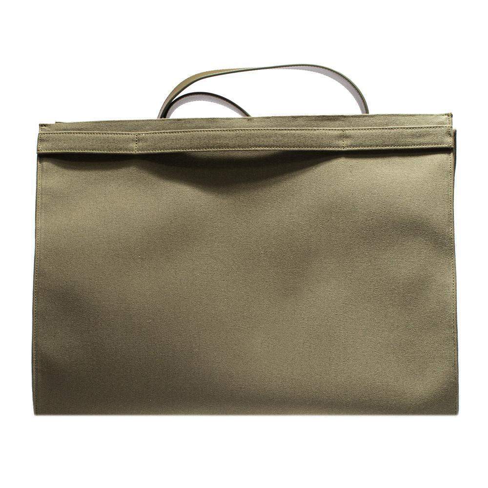 MILITARY GREEN CANVAS BAG WITH DETACHABLE SHOULDER STRAP IN LEATHER AND SHORT HANDLES ON FRONT AND BACK. EXTERNAL PANEL ON THE FRONT MAKING THREE POCKETS. INSIDE LAPTOP COMPARTMENT AND ZIPPERED POCKET. ZIPPERED CLOSURE AND INSIDE LEATHER FINISHING.