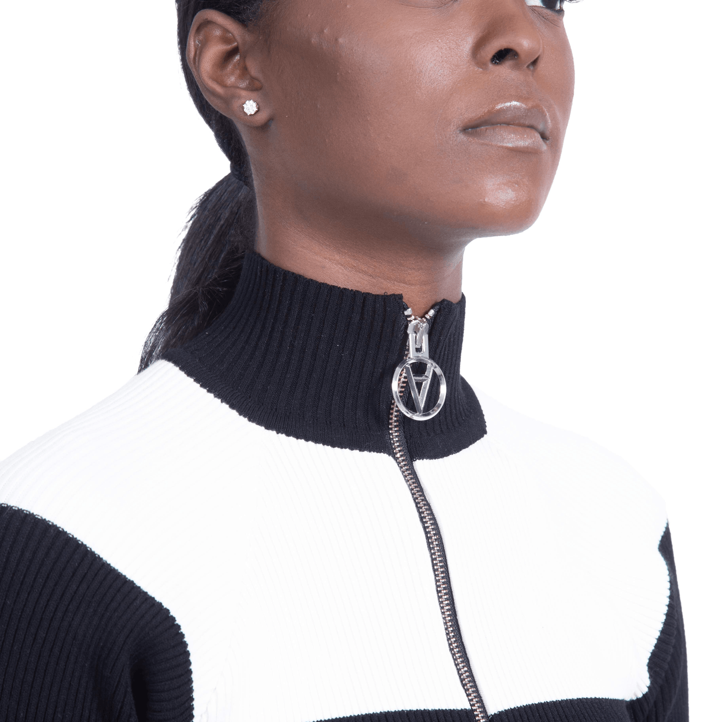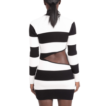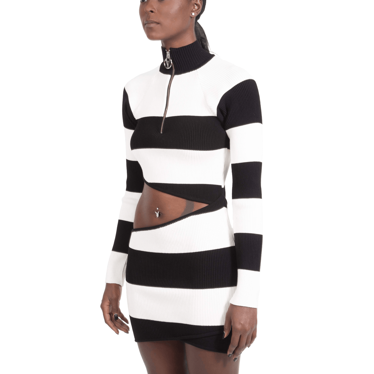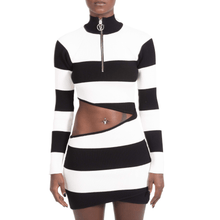 Black and white striped cut out ribbed mini dress with raglan long sleeves, high neck, and a silver metal logo zipper.