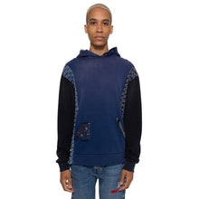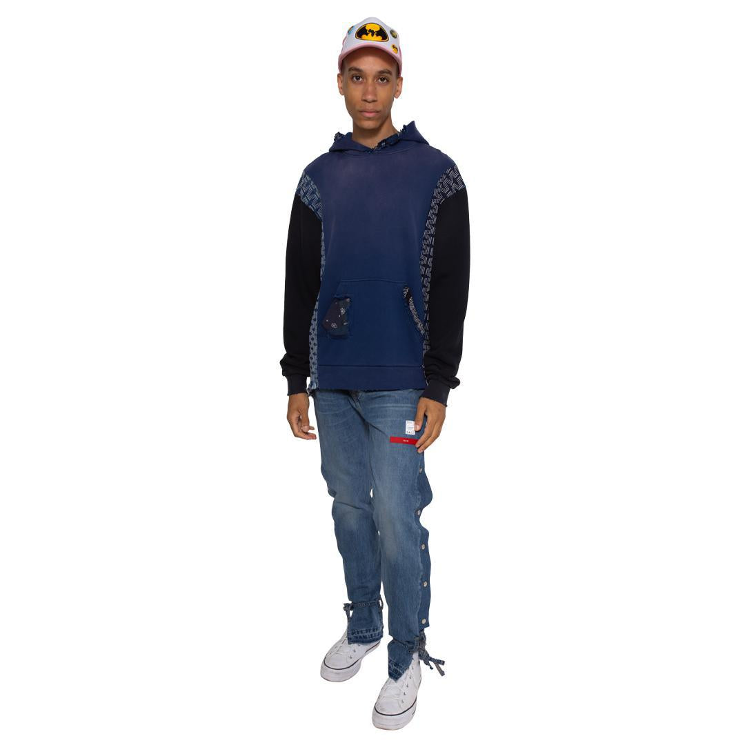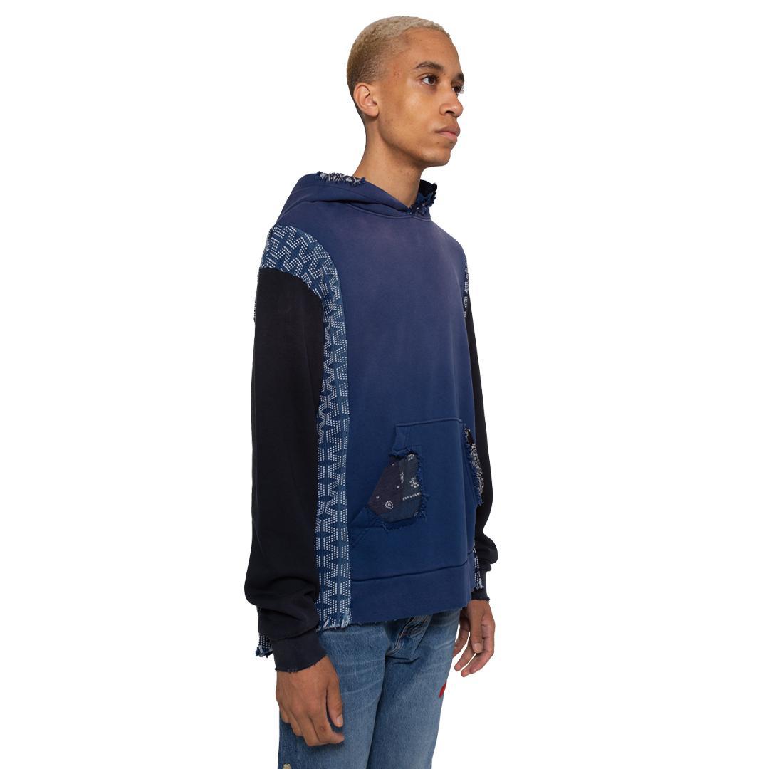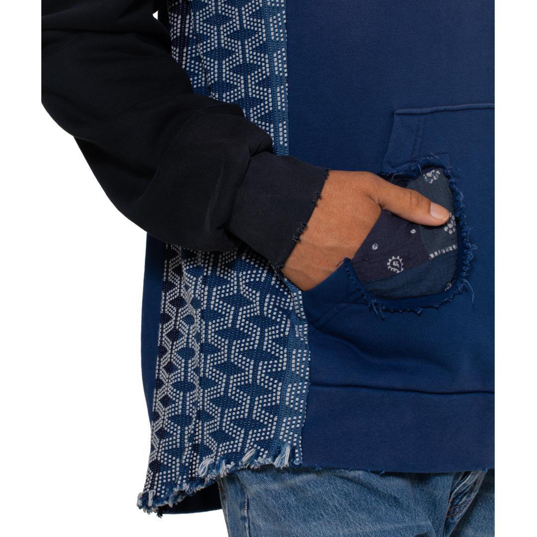 Sashiko Hoodie from Alchemist is a blue long sleeve panneled hooded sweatshirt. Featuring Alchemist's signature patchwork style with fading and distressing throughout. Textile pannels and textile trim on hood and pockets with contrast sleeves. Front kangaroo pocket and fringe detailing at drop-tail hem.