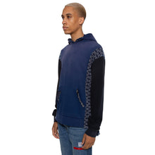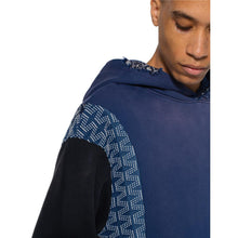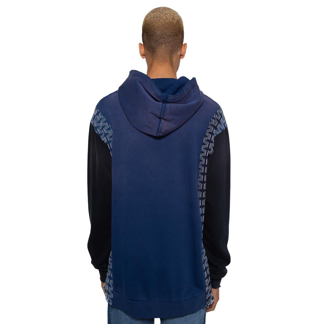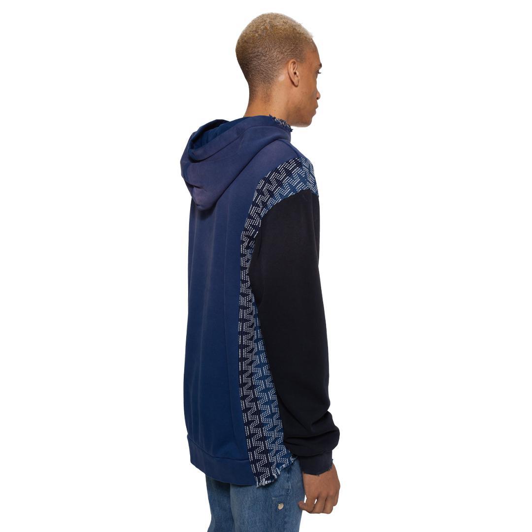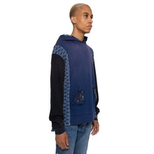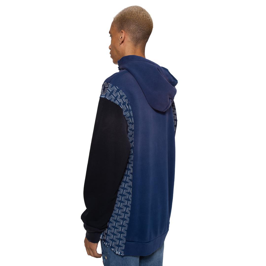 Sashiko Hoodie from Alchemist is a blue long sleeve panneled hooded sweatshirt. Featuring Alchemist's signature patchwork style with fading and distressing throughout. Textile pannels and textile trim on hood and pockets with contrast sleeves. Front kangaroo pocket and fringe detailing at drop-tail hem.