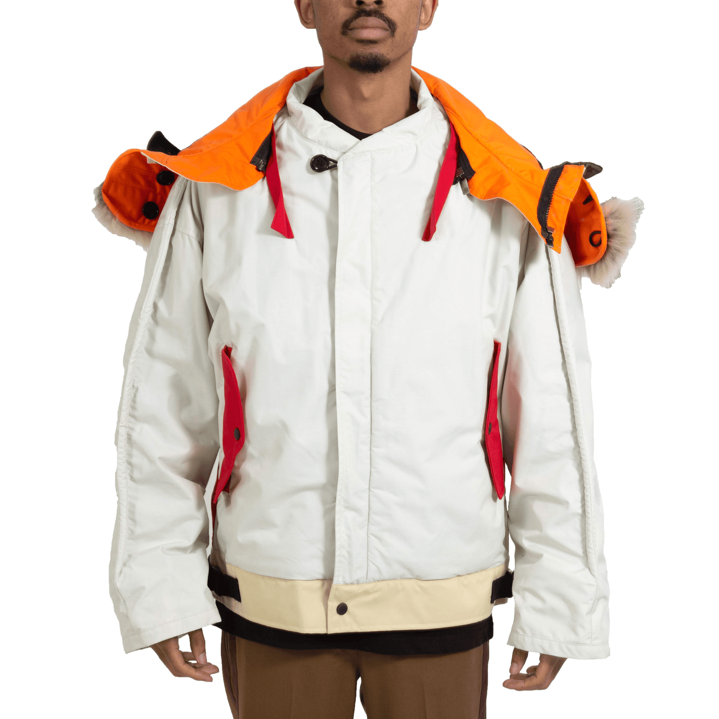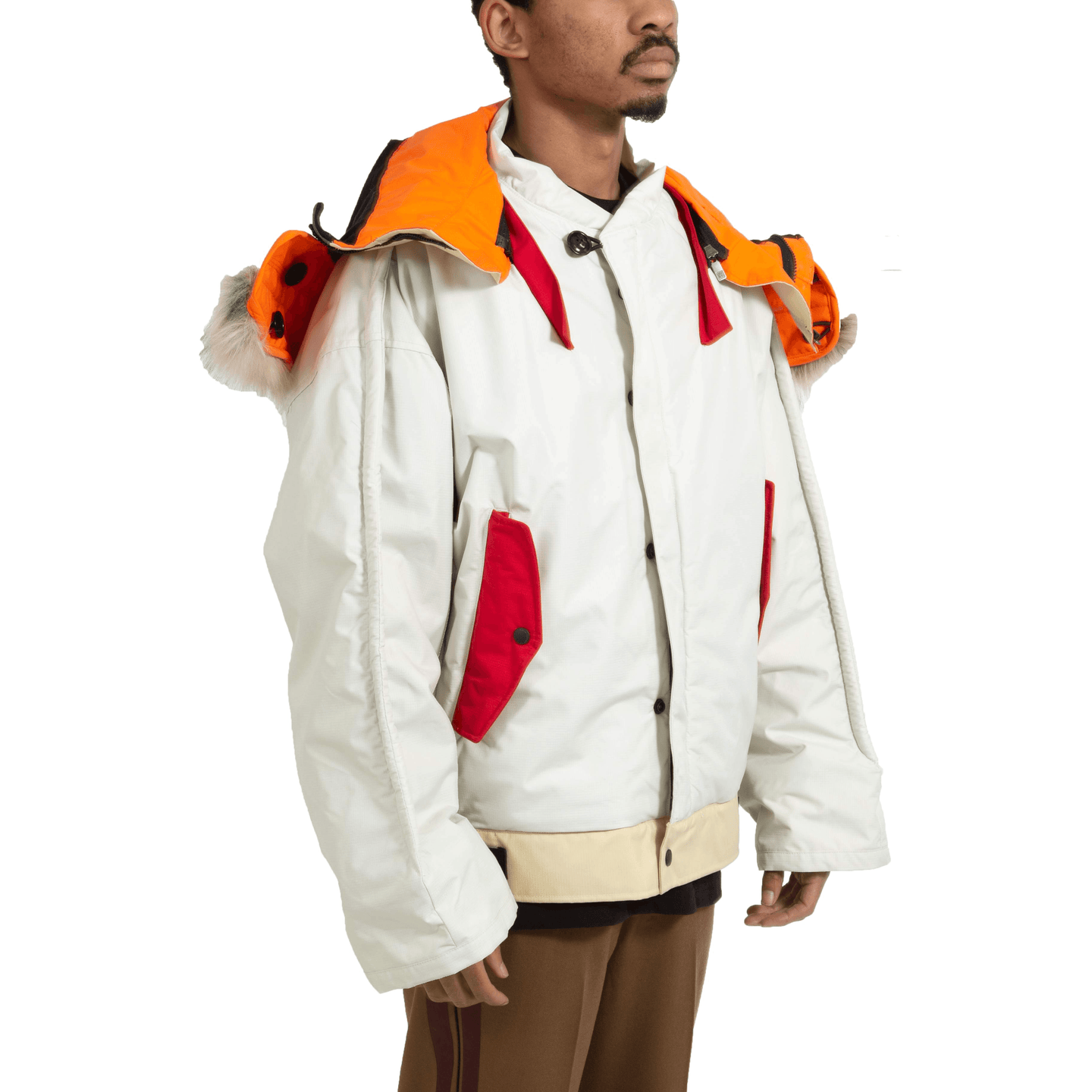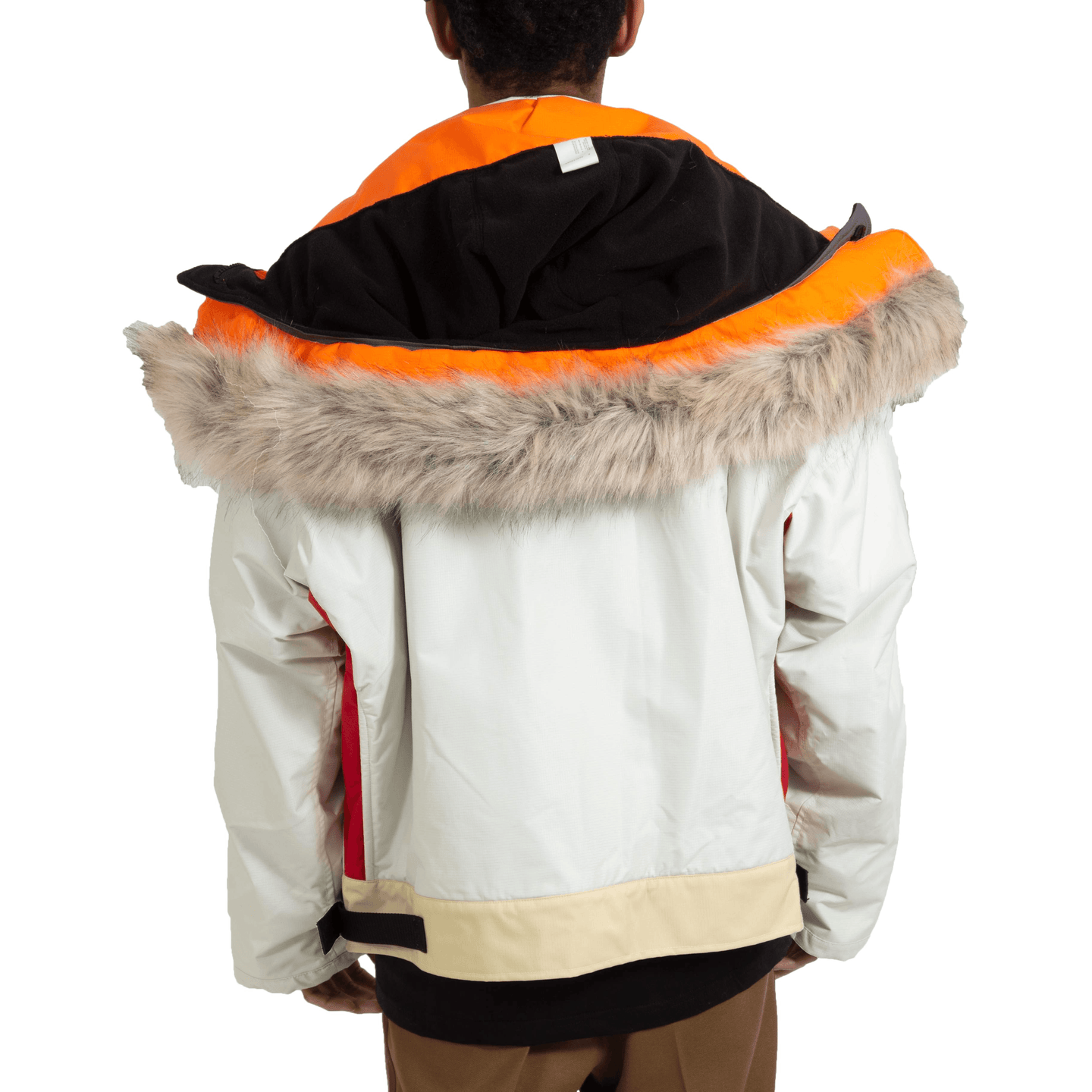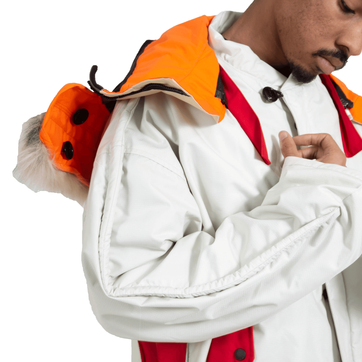 White ski jacket with red and orange accents throughout, detachable hood, adjustable strap at bottom hem. Timeless piece made from quality fabric to last you a lifetime
