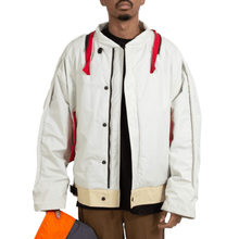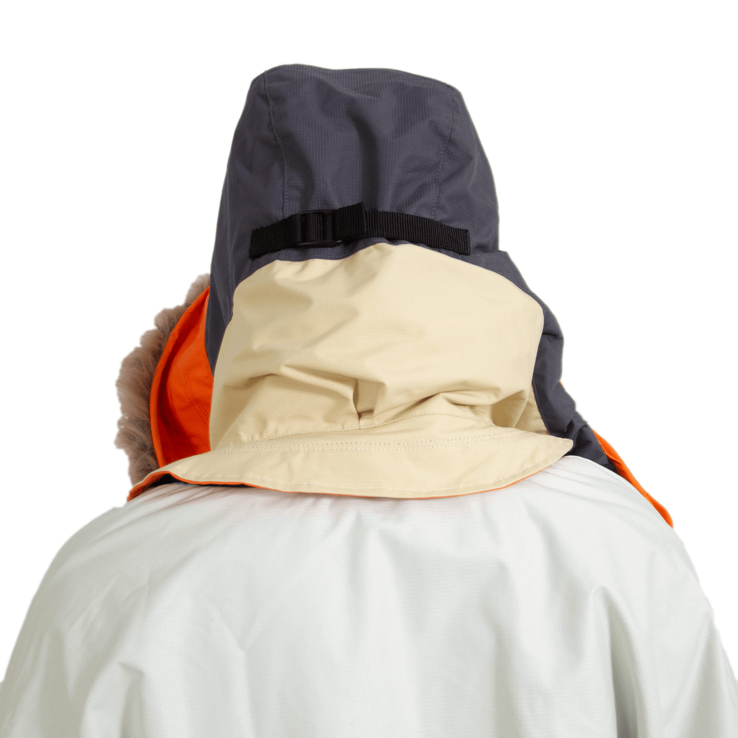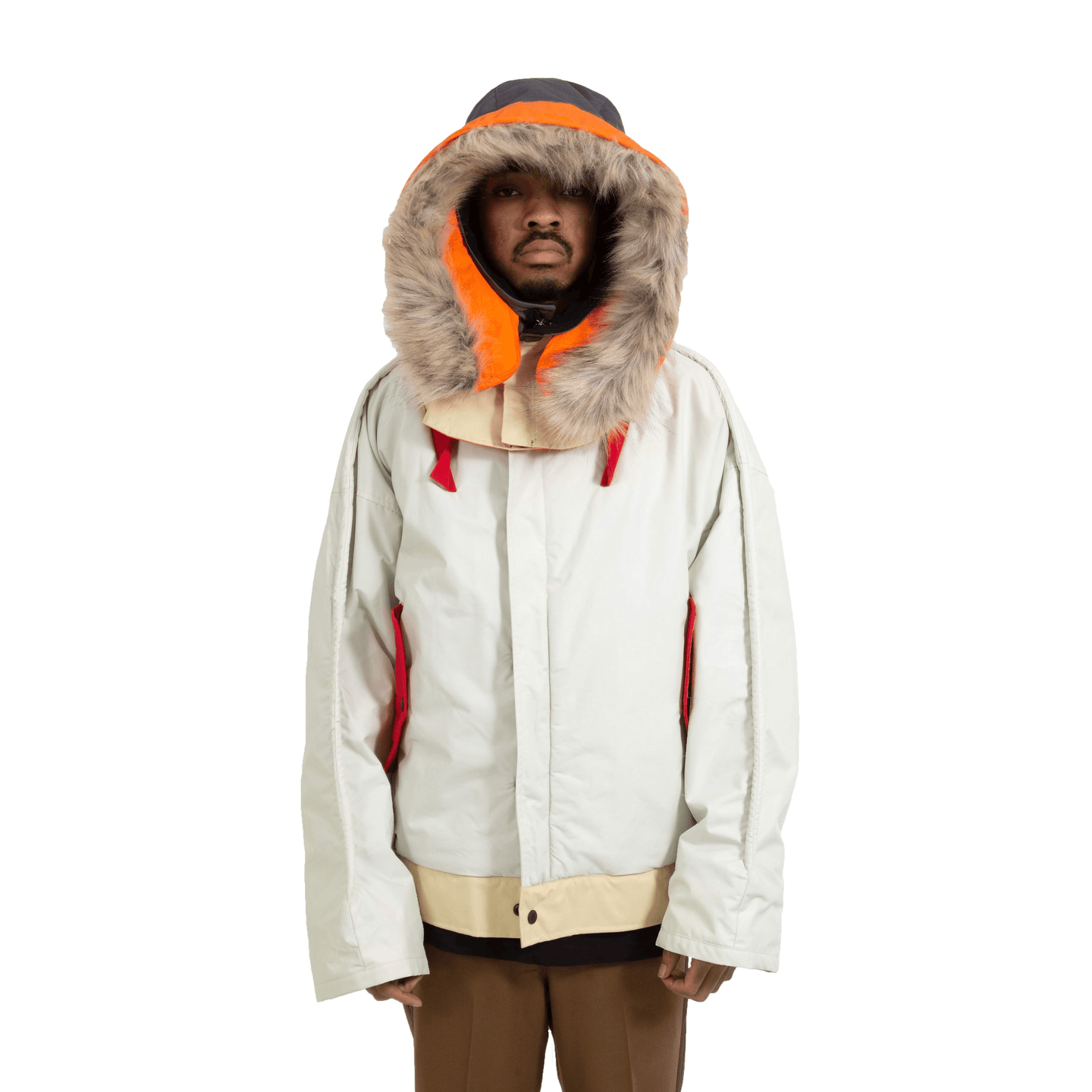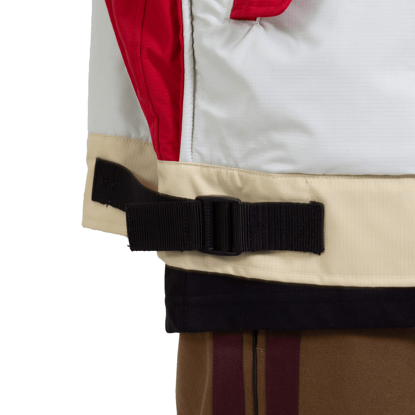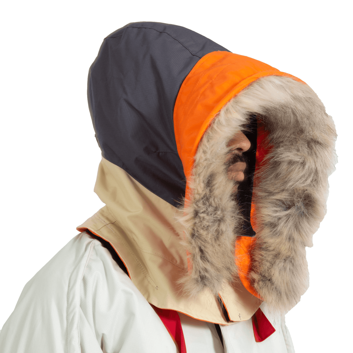 White ski jacket with red and orange accents throughout, detachable hood, adjustable strap at bottom hem. Timeless piece made from quality fabric to last you a lifetime