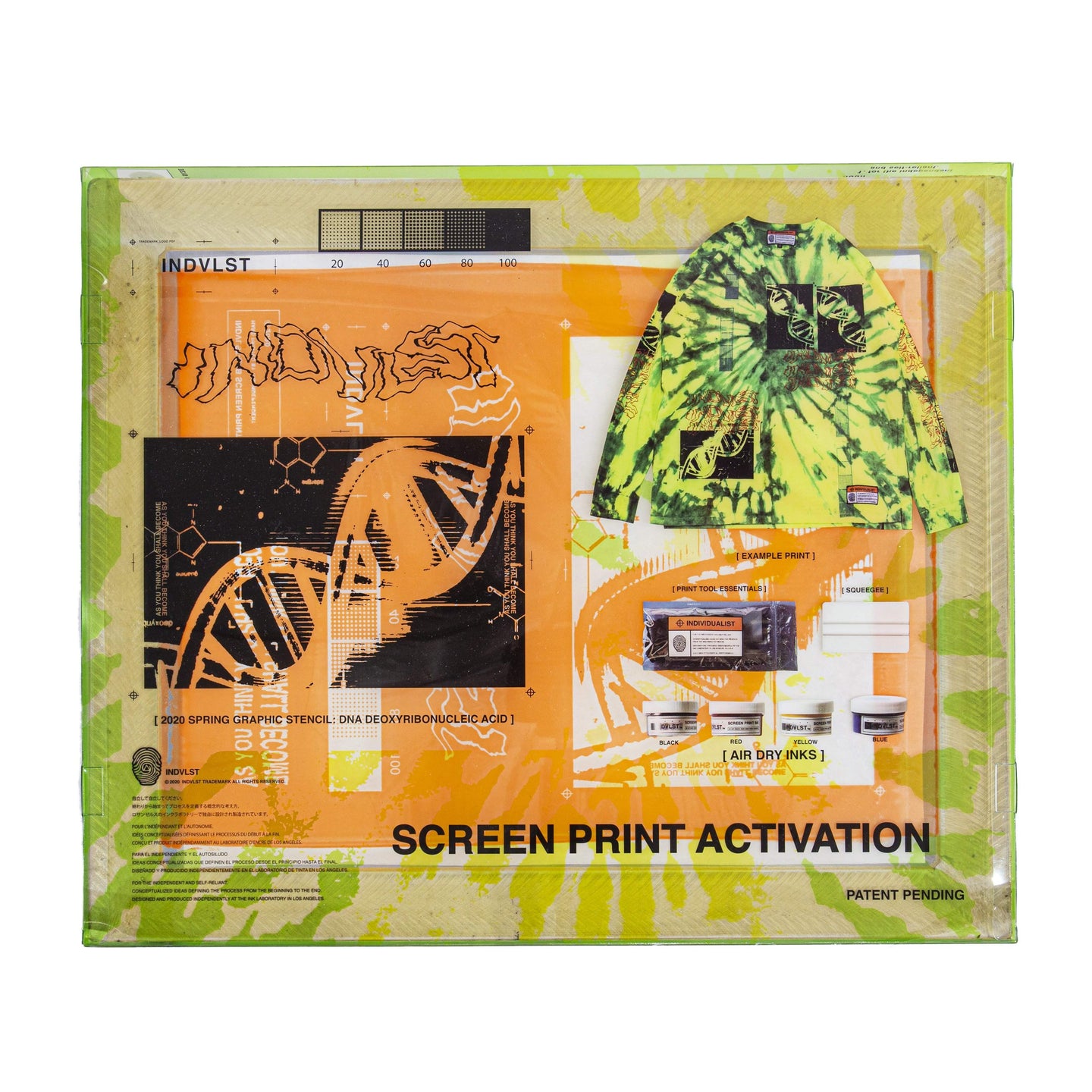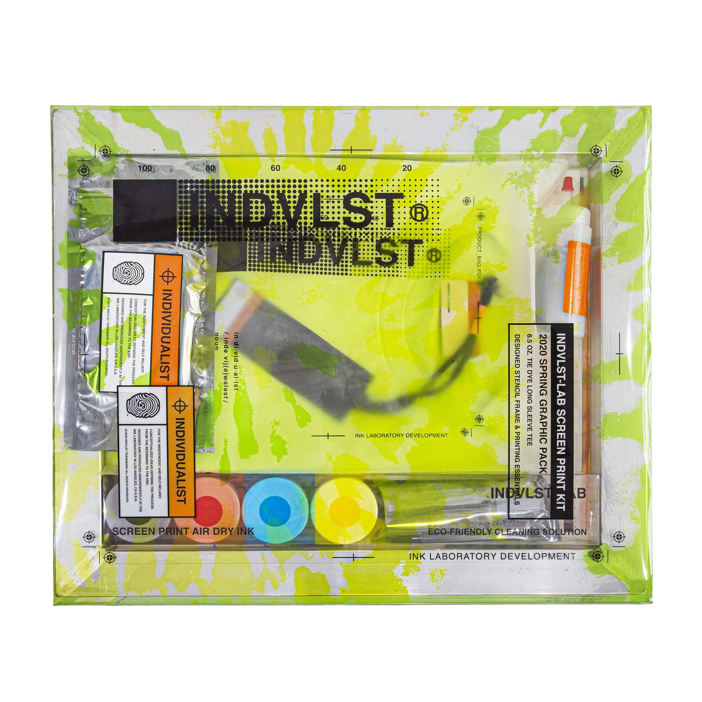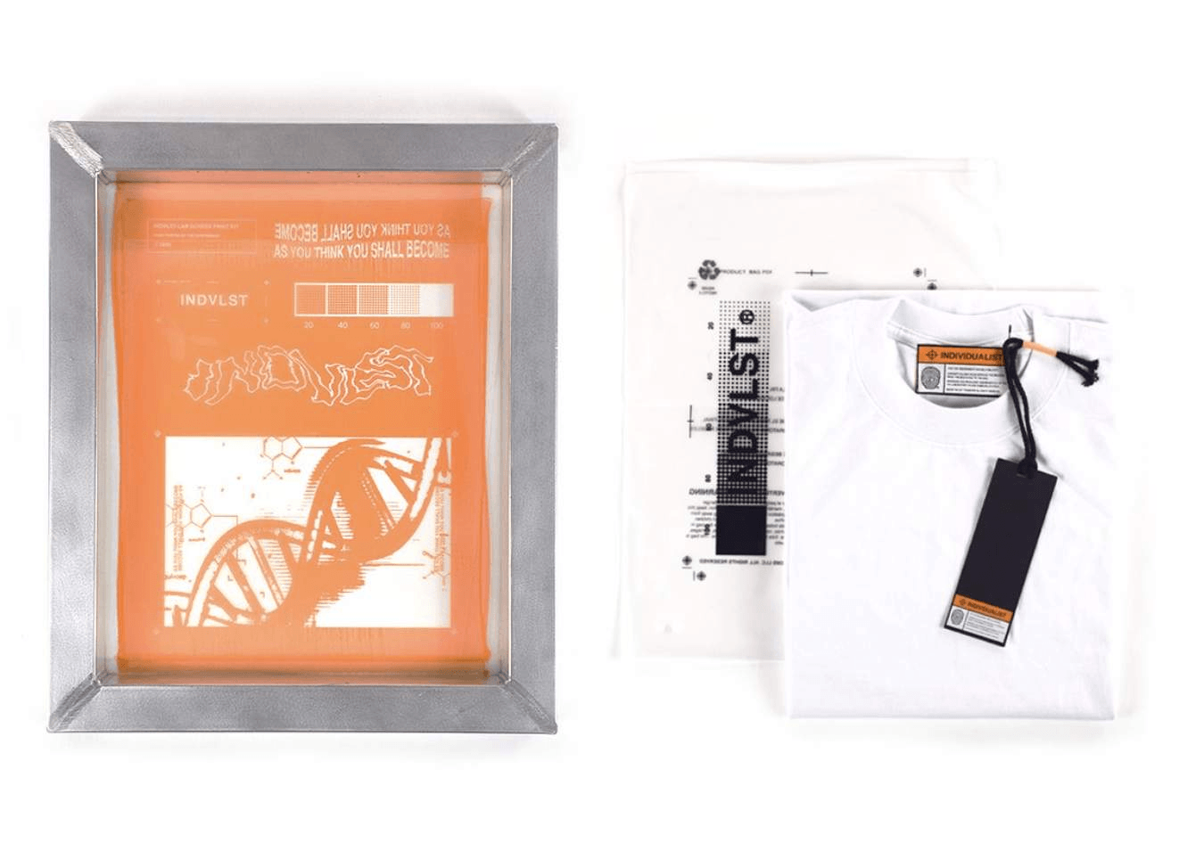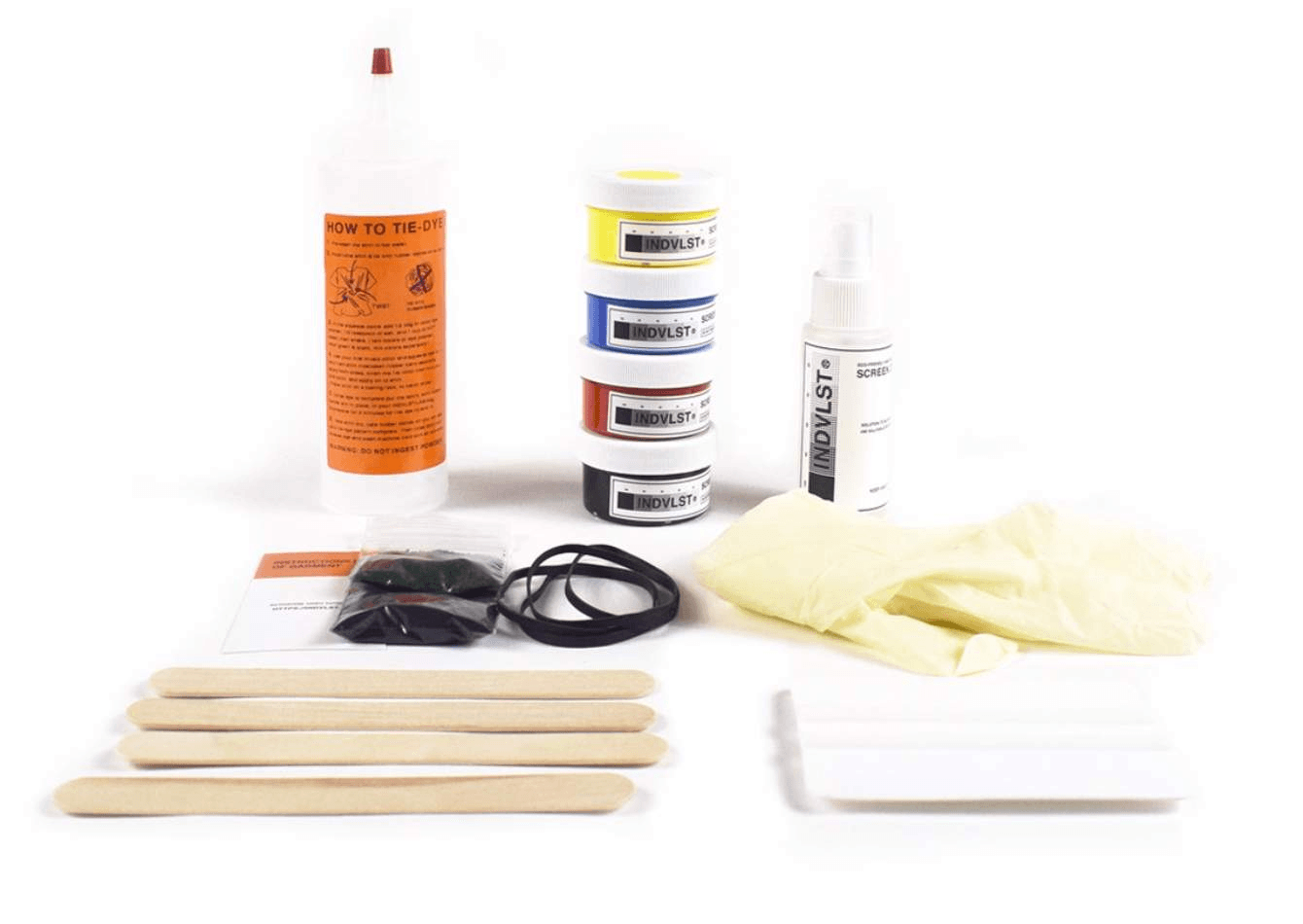 INDVLST-LAB Screen print kit including a 6 step instruction and all the elements for print design in the comfortably of your own home. Soap, water, & blow dryer not included.