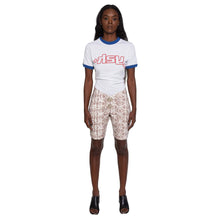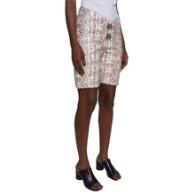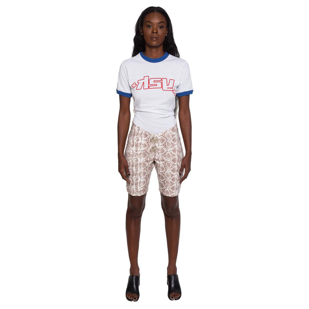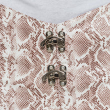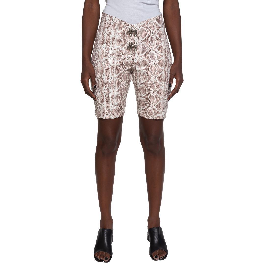 From LĒO Spring/Summer '22 collection 'Aura.' White faux leather shortd with snakeskin pattern throughout. V cut waist, front ox horn clasp closure with silver-tone hardware.