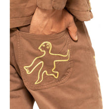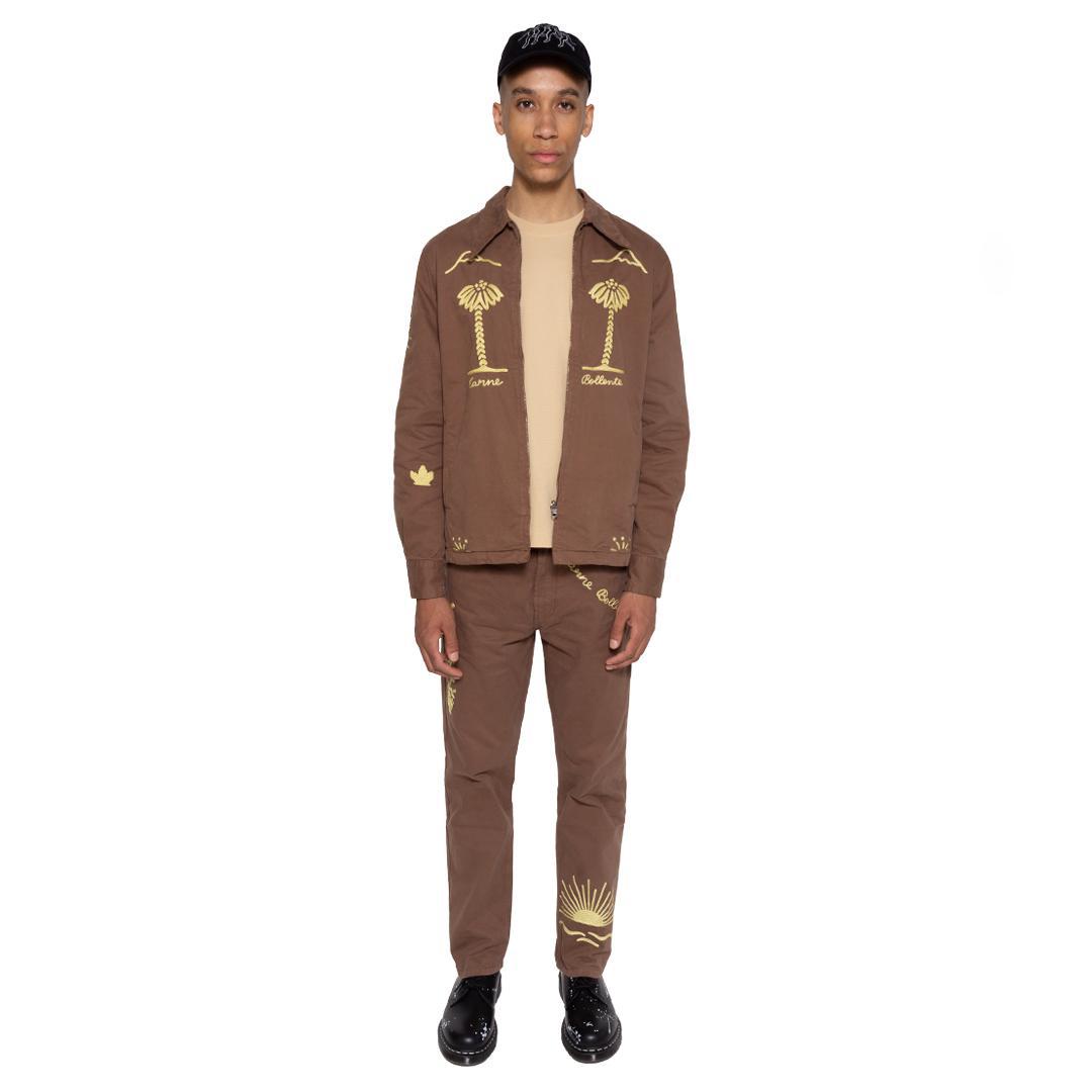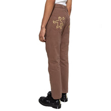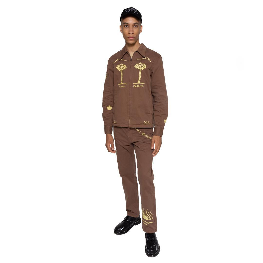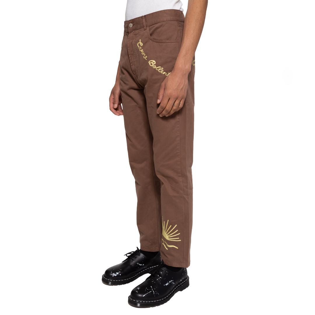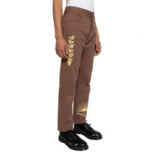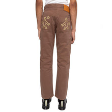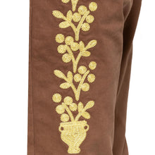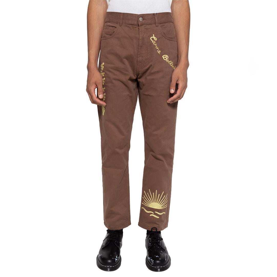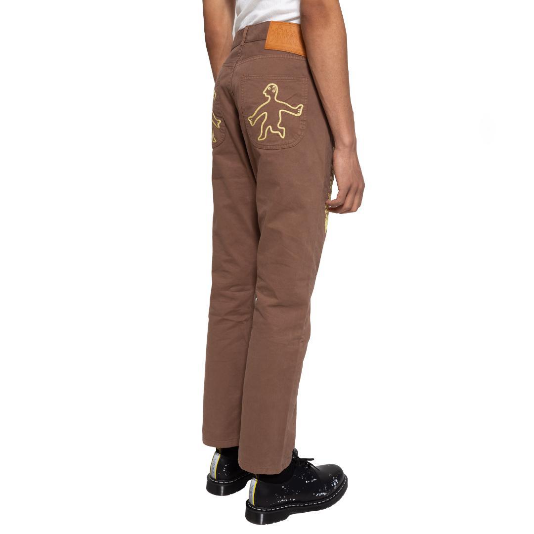 From Carne Bollente Spring/Summer 22. Brown straight leg trouser with yellow Nature pattern embroideries on thigh and ankle. Logo embroidery on hip. Loving embroideries on back pockets. Straight leg high rise jeans.