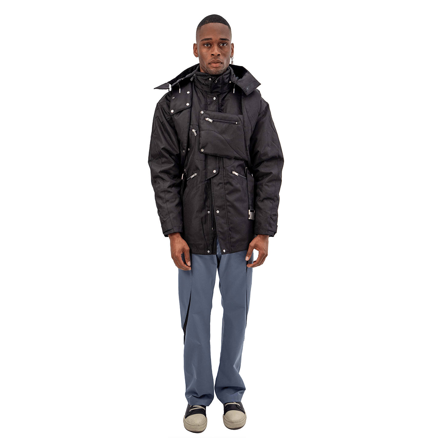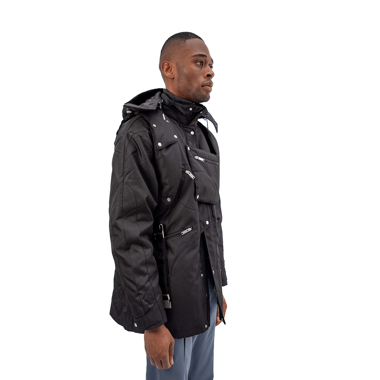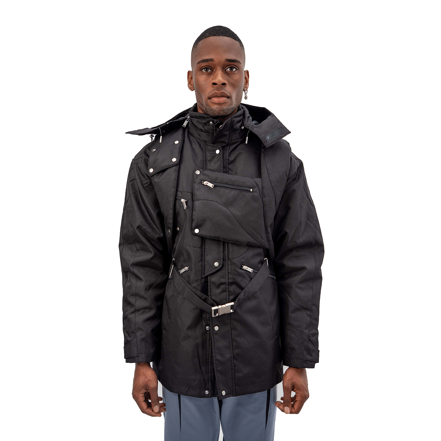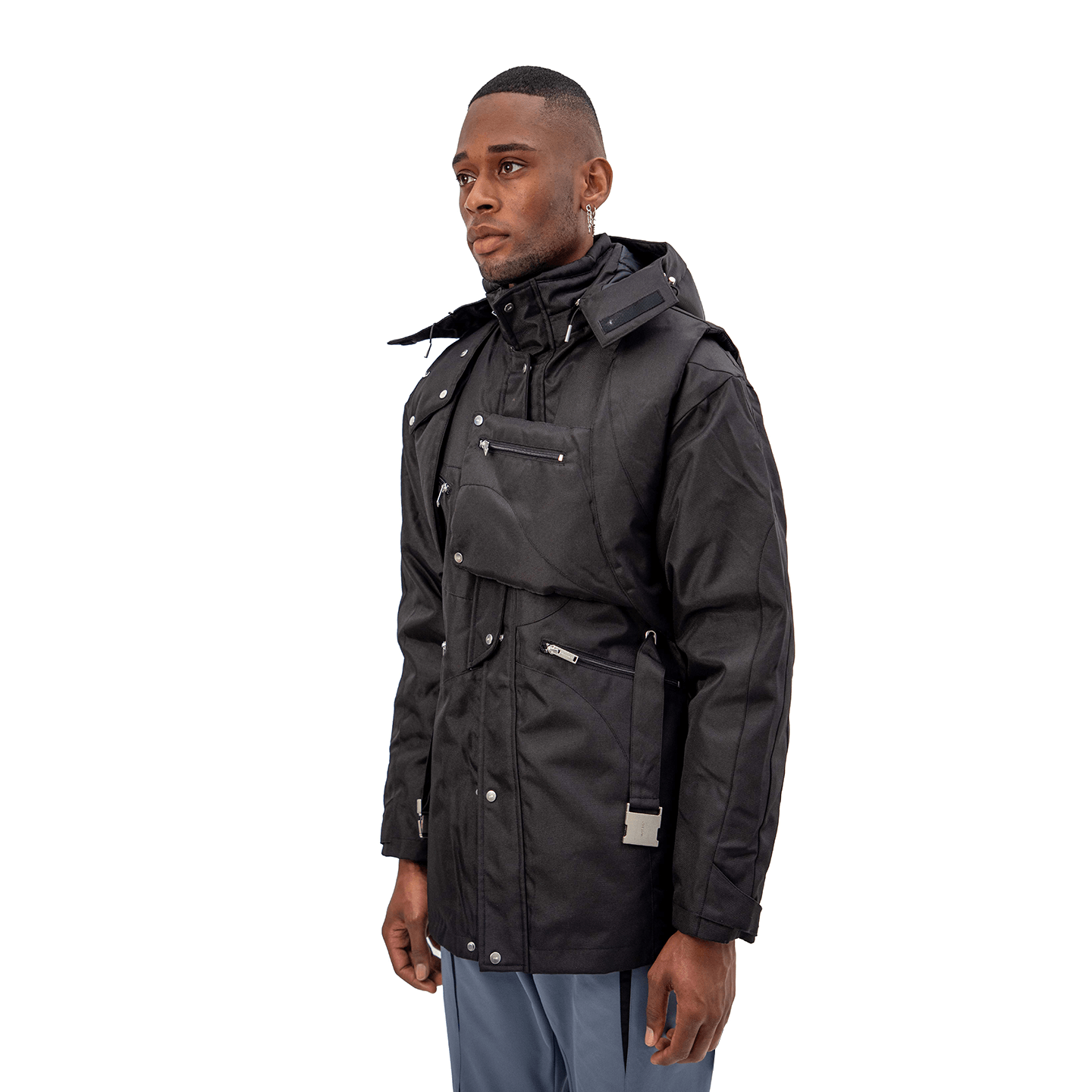 Heliot Emil water repelant layered vest parka. Inspired by Arctic Parkas, but immersed in functional tactical precision. Complete with an adjustable waist belt and silver hardware trimmings.