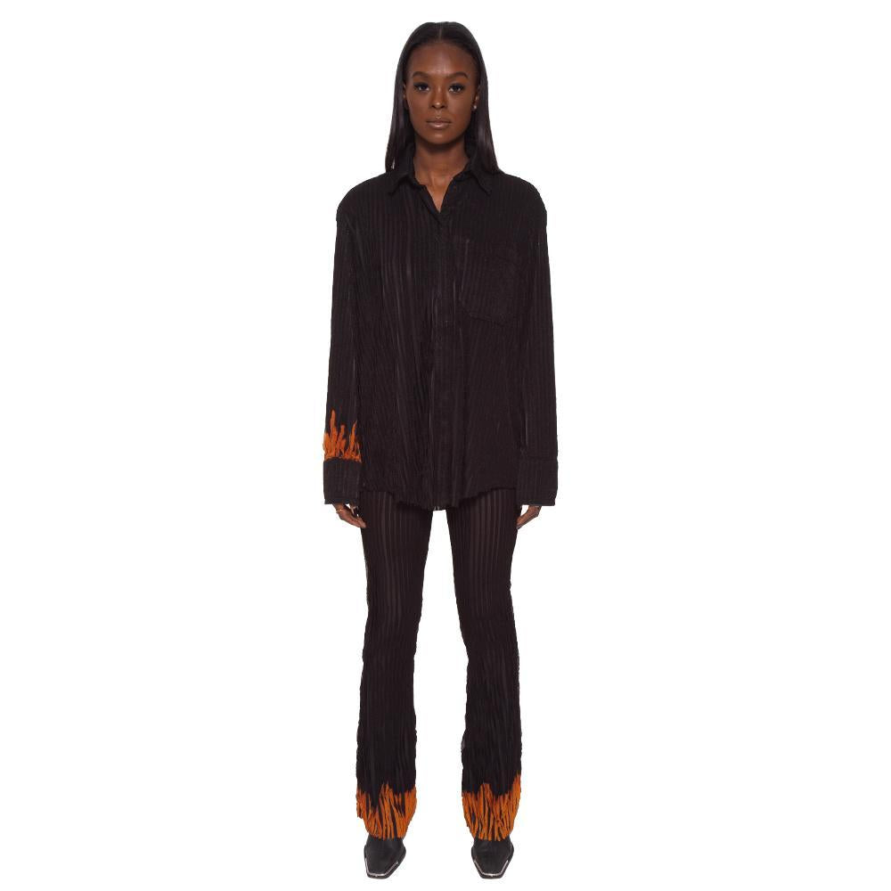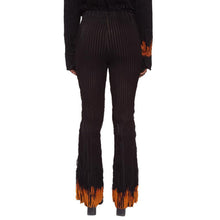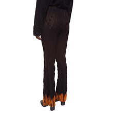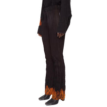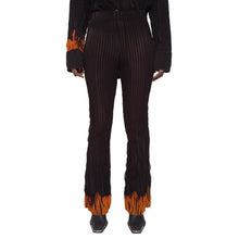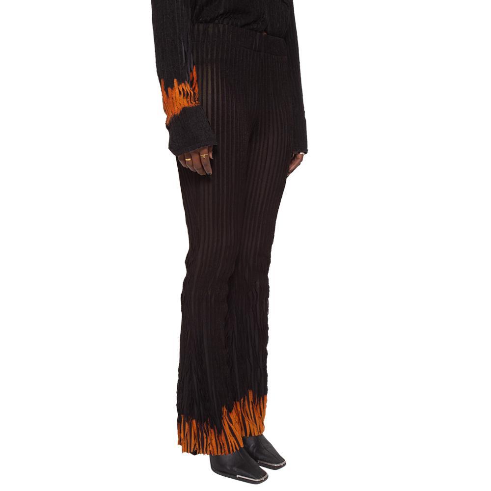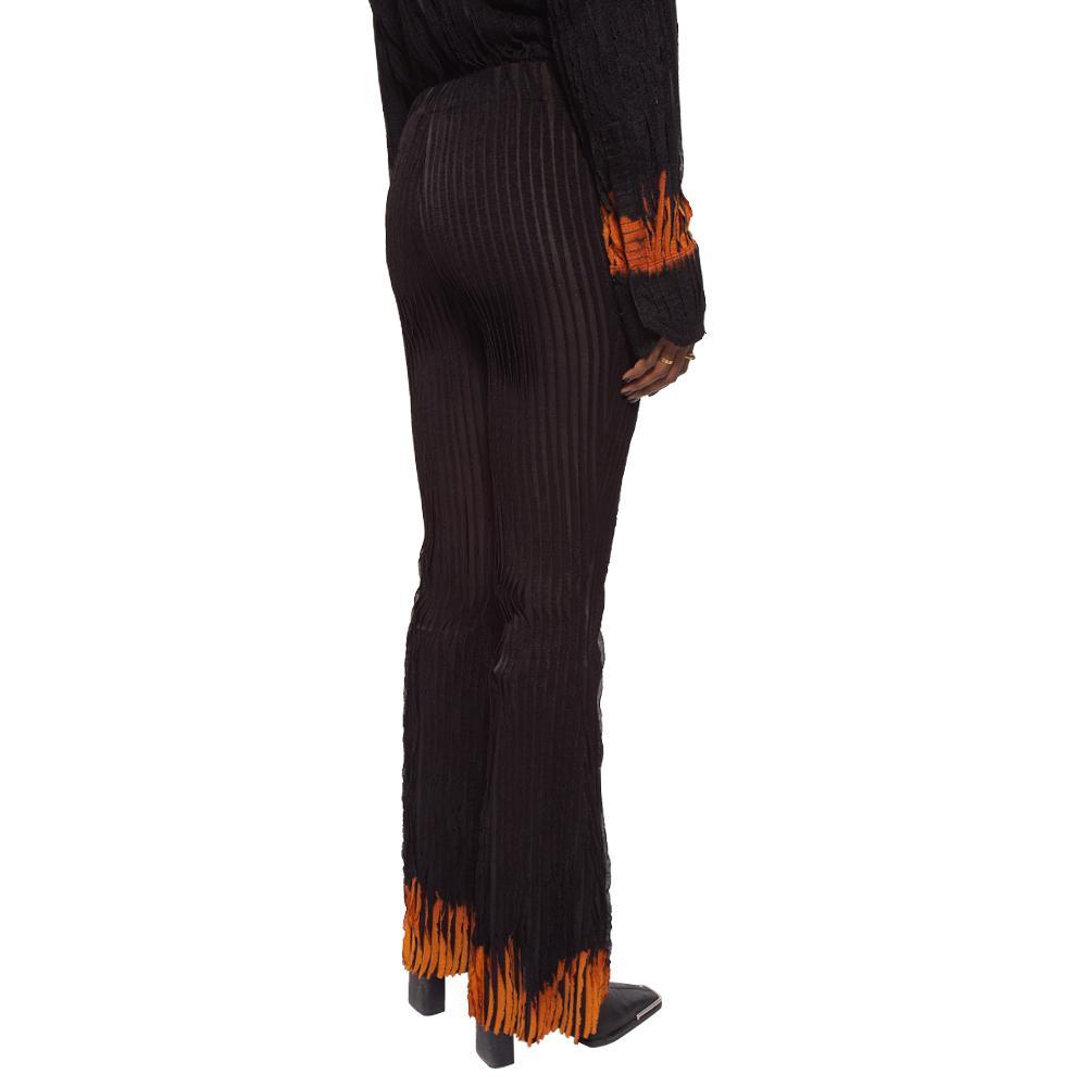 From LĒO Spring/Summer '22 collection 'Aura.' Flared wavy jersey pants soft touch texture in black with horizontal tie dye placement at bottom of legs.