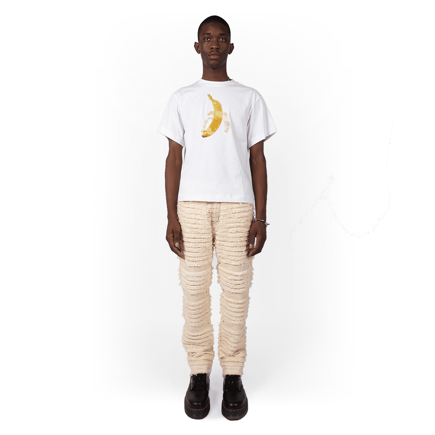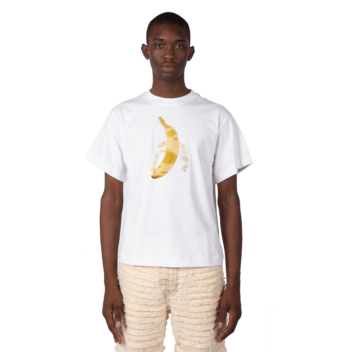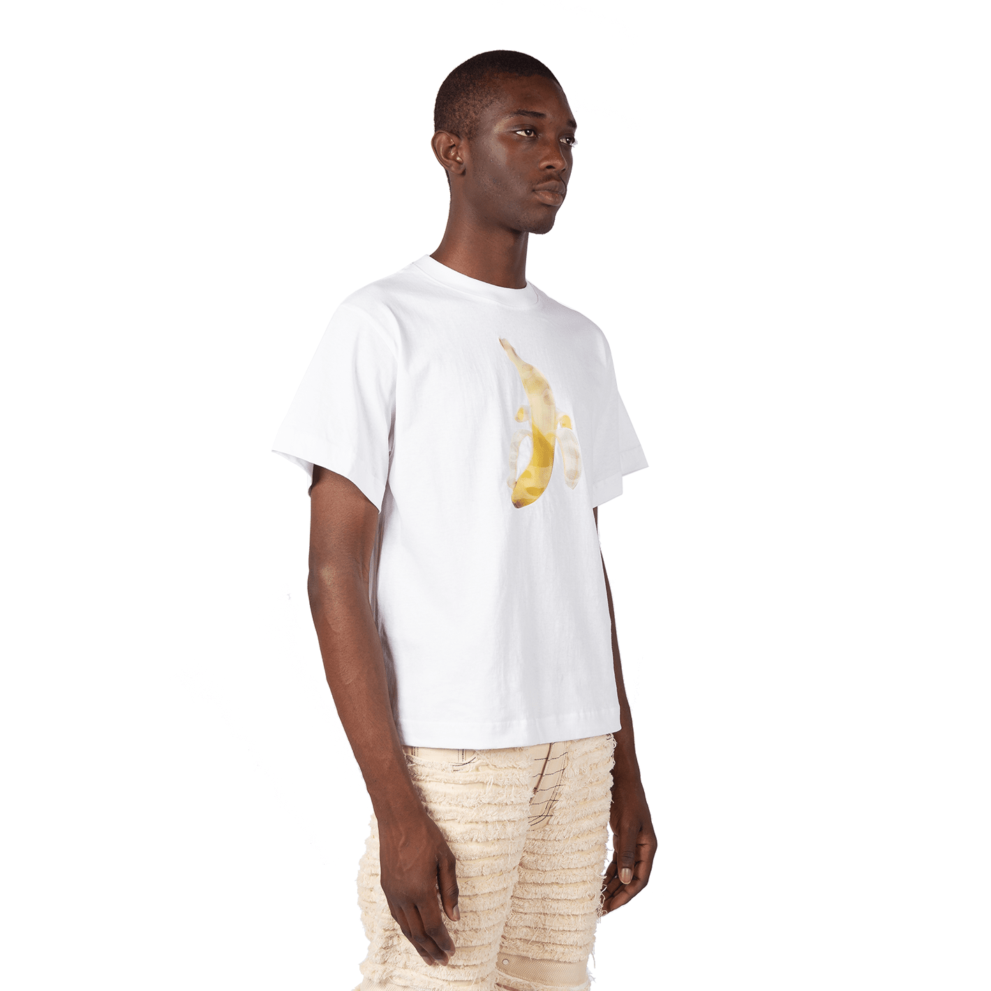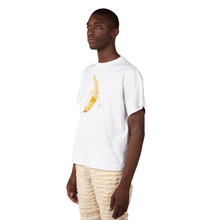 White recycled cotton T-shirt with lenticular Banana patch. The banana peels as the viewing angle changes (peep the gif it's out of this world)