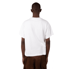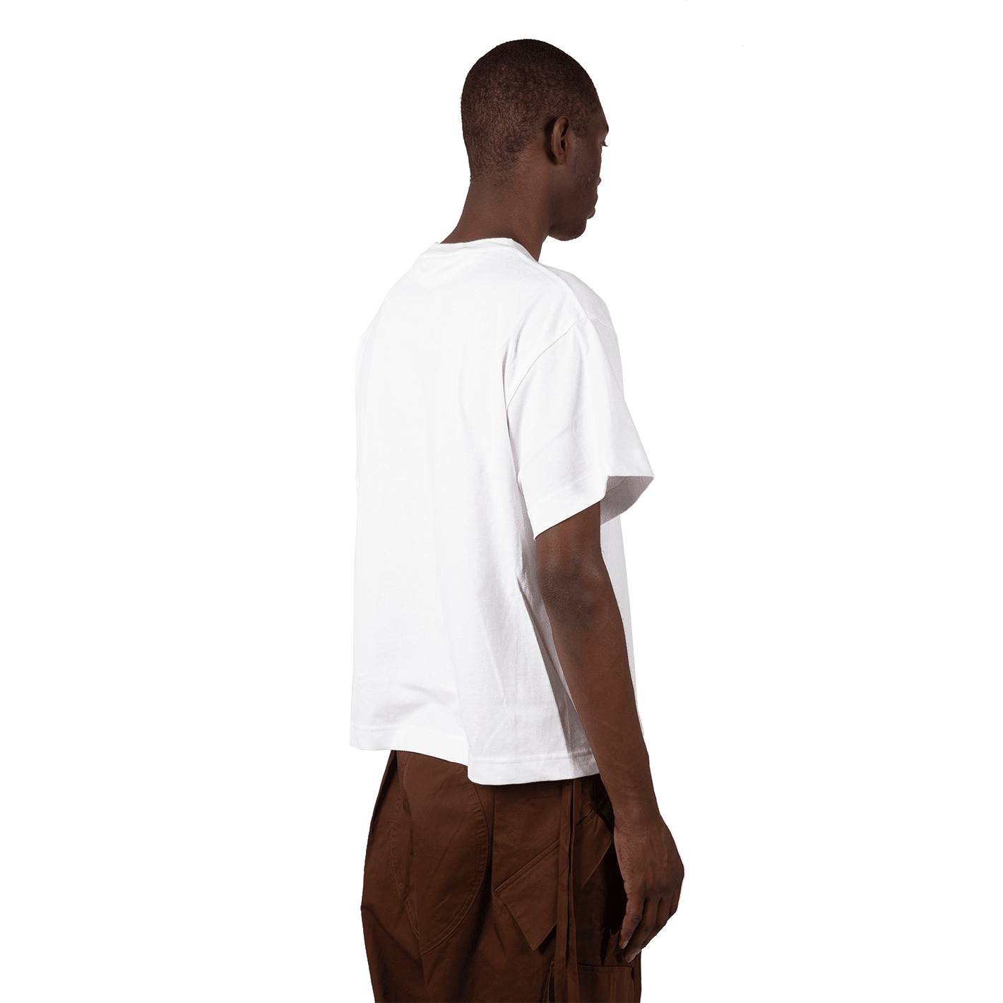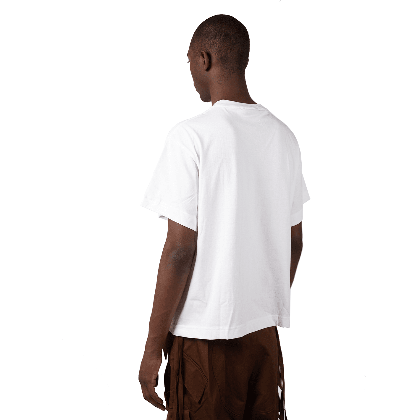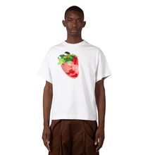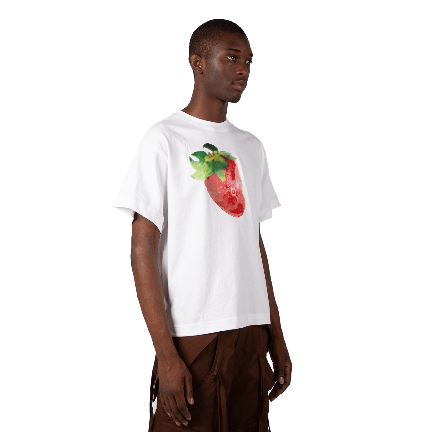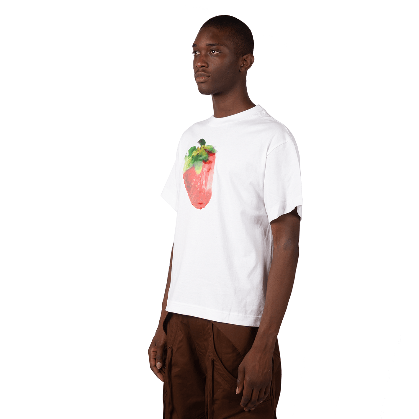 White recycled cotton T-shirt with lenticular Strawberry patch. The strawberry gets eaten as the viewing angle changes (peep the gif it's out of this world)