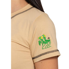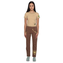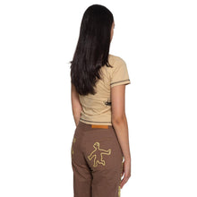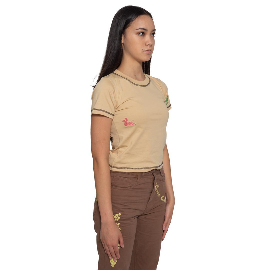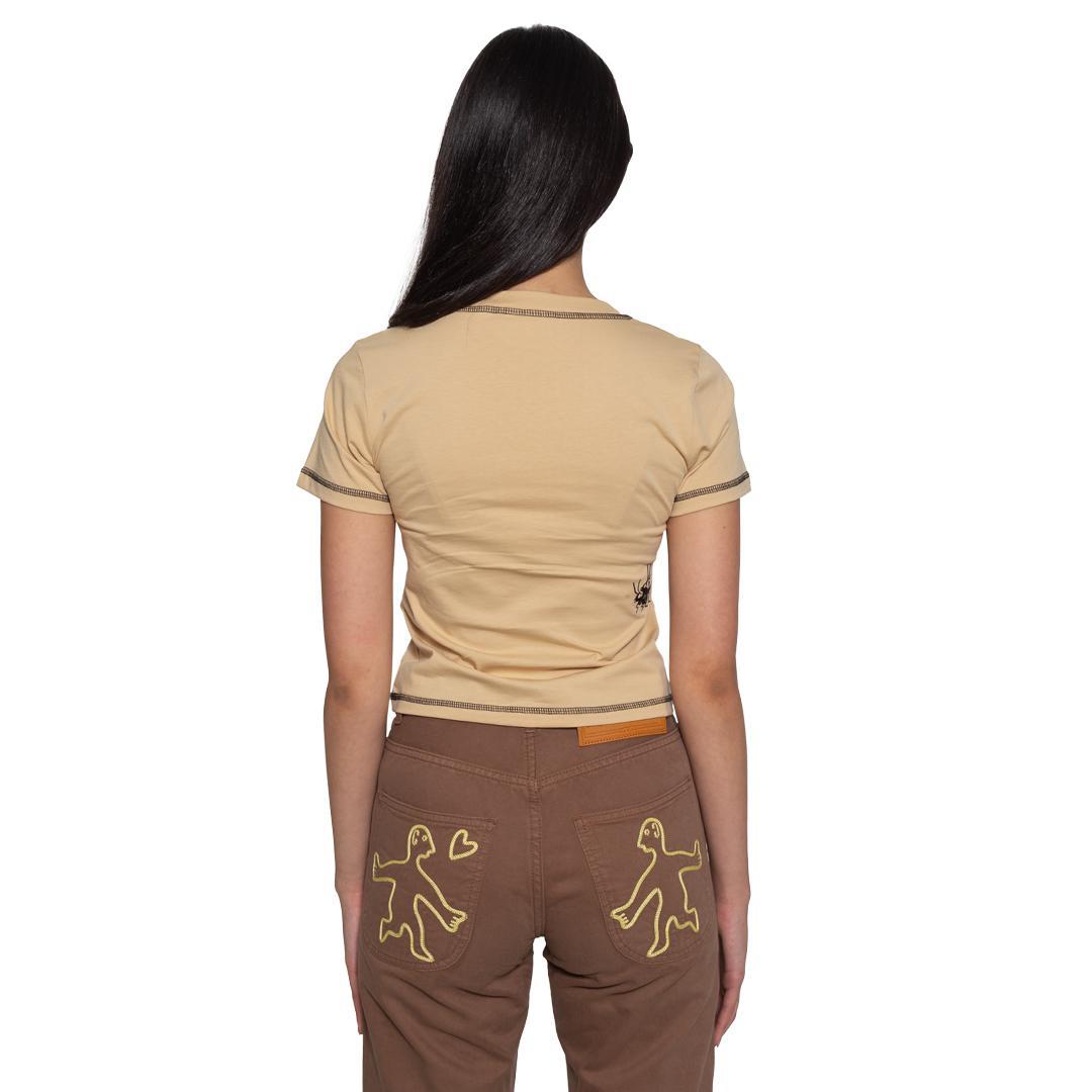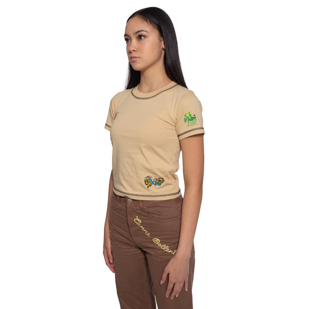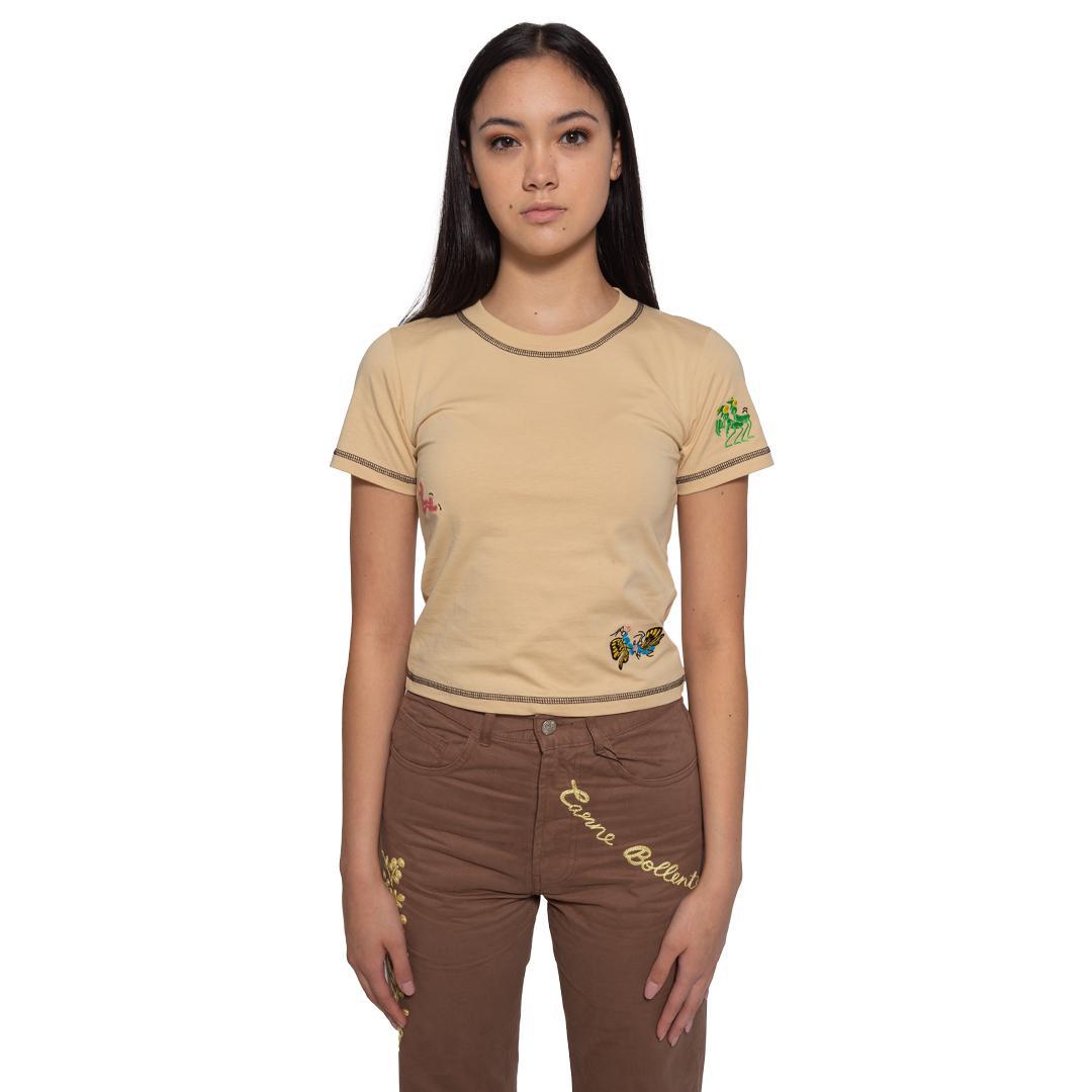 From Carne Bollente Spring/Summer 22. Beige baby t-shirt with playfully placed multicolored insect embroideries. Contrast stitching on arms, neck, and waistline.