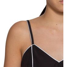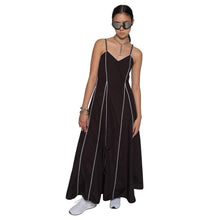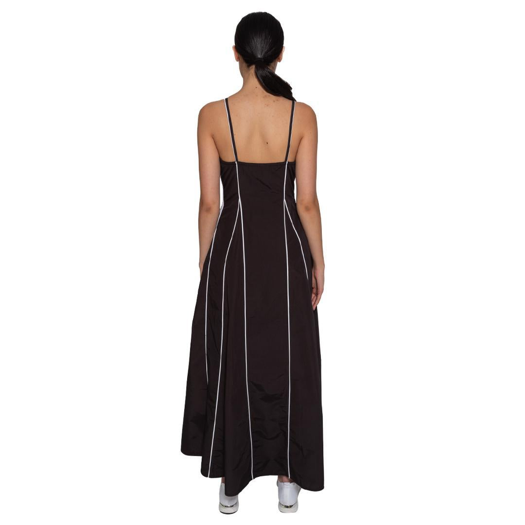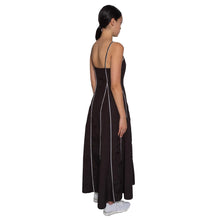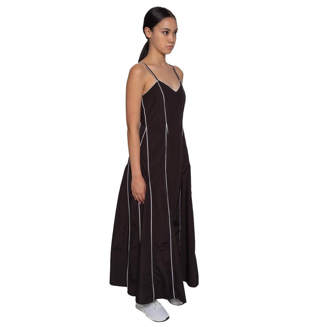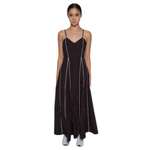 Sleeveless dress fitted at the bust and high waist, and flares out into A line skirt, with piping streamlining the body.