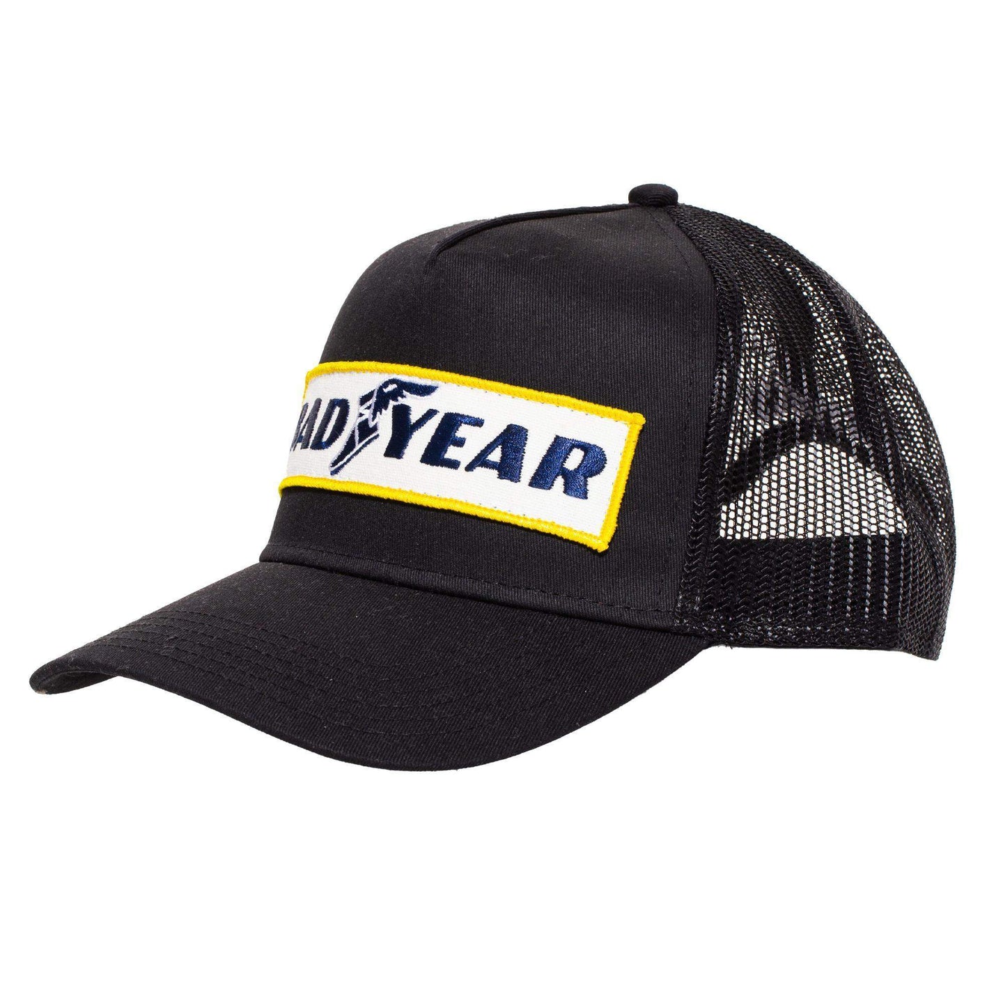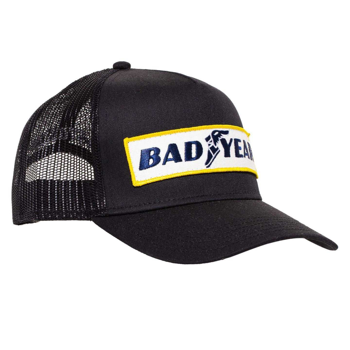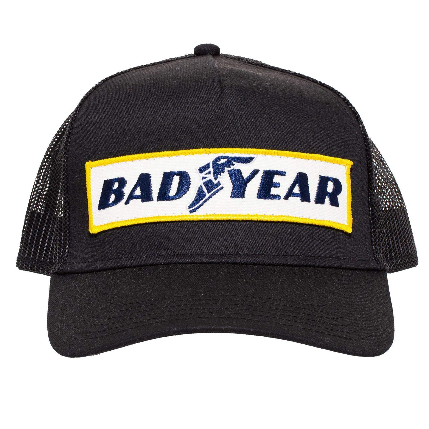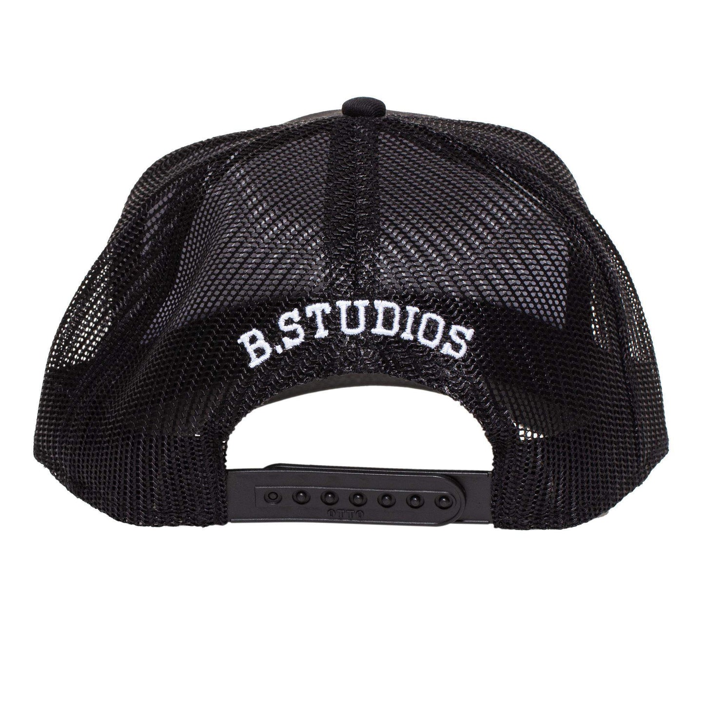 Navy Blue classic style trucker cap with embroidered BADYEAR patch on front. B. Studios emroidered on mesh above the adjustable strap on the backside.