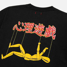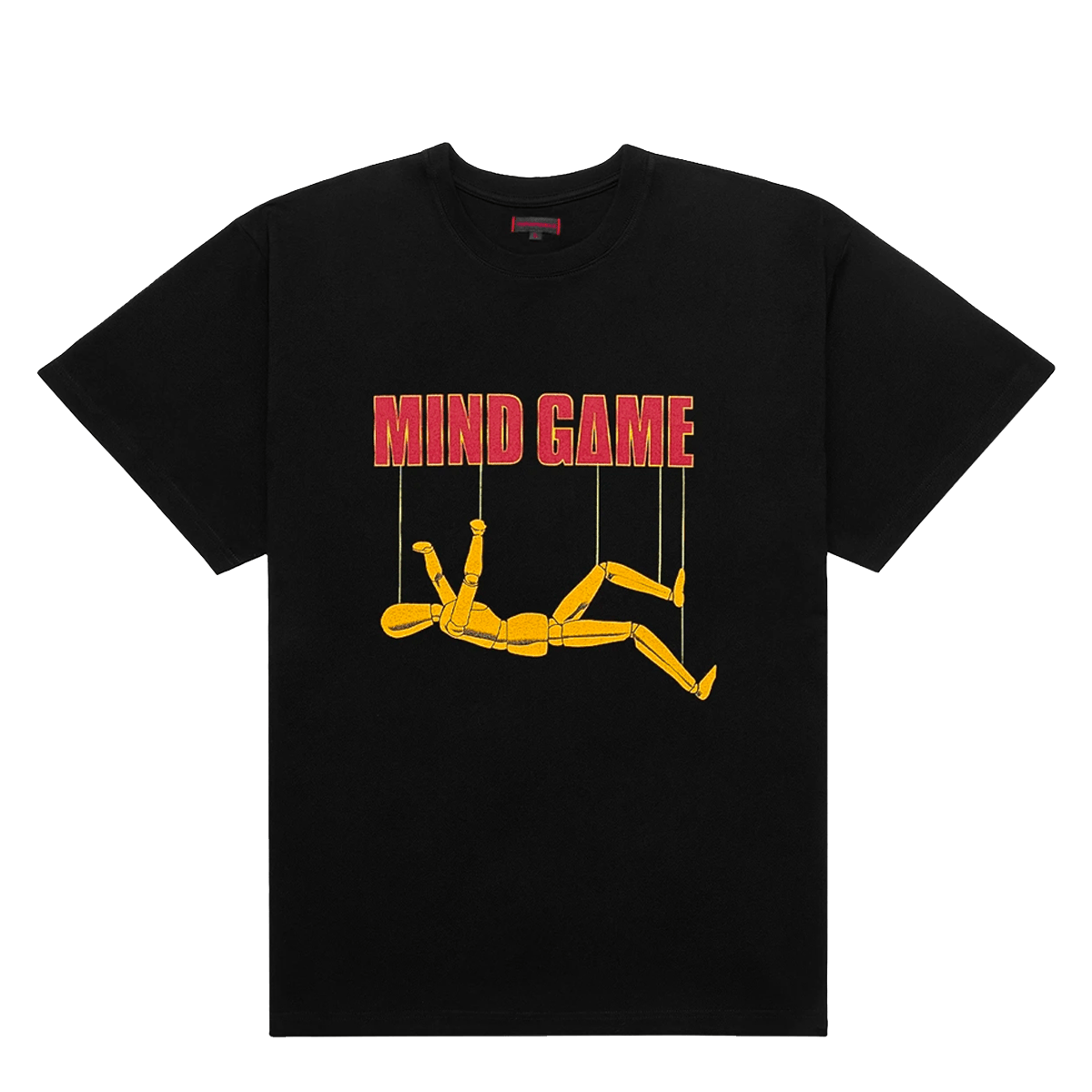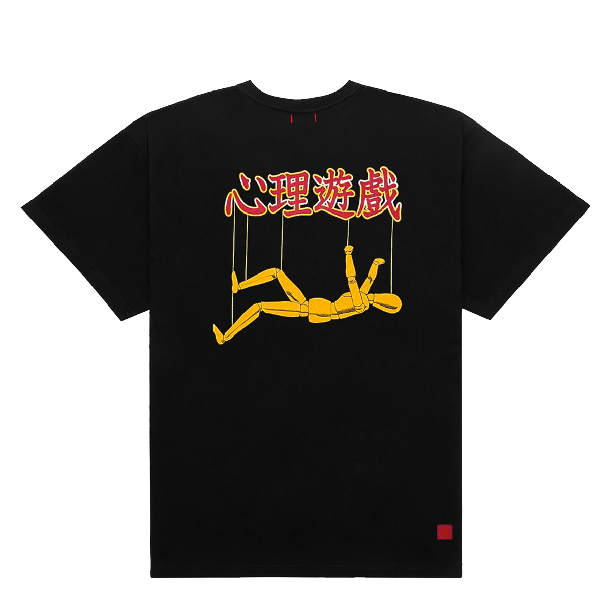CLOT black short sleeve t-shirt. Front screen print "MIND GAME" with a marionette puppet, back screen print of Kanji graphics with puppet.