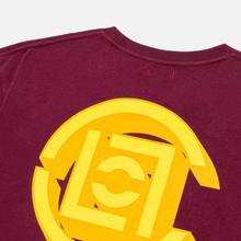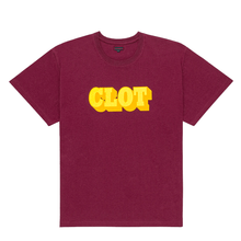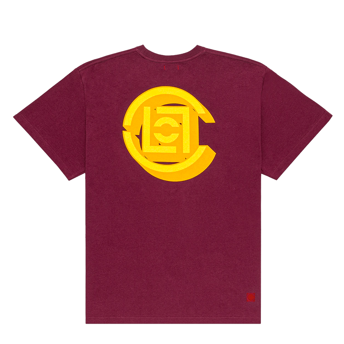 Burgundy shortsleeved T-shirt with yellow CLOT typography screen printed on chest with yellow CLOT "C" logo screenprinted on the back.