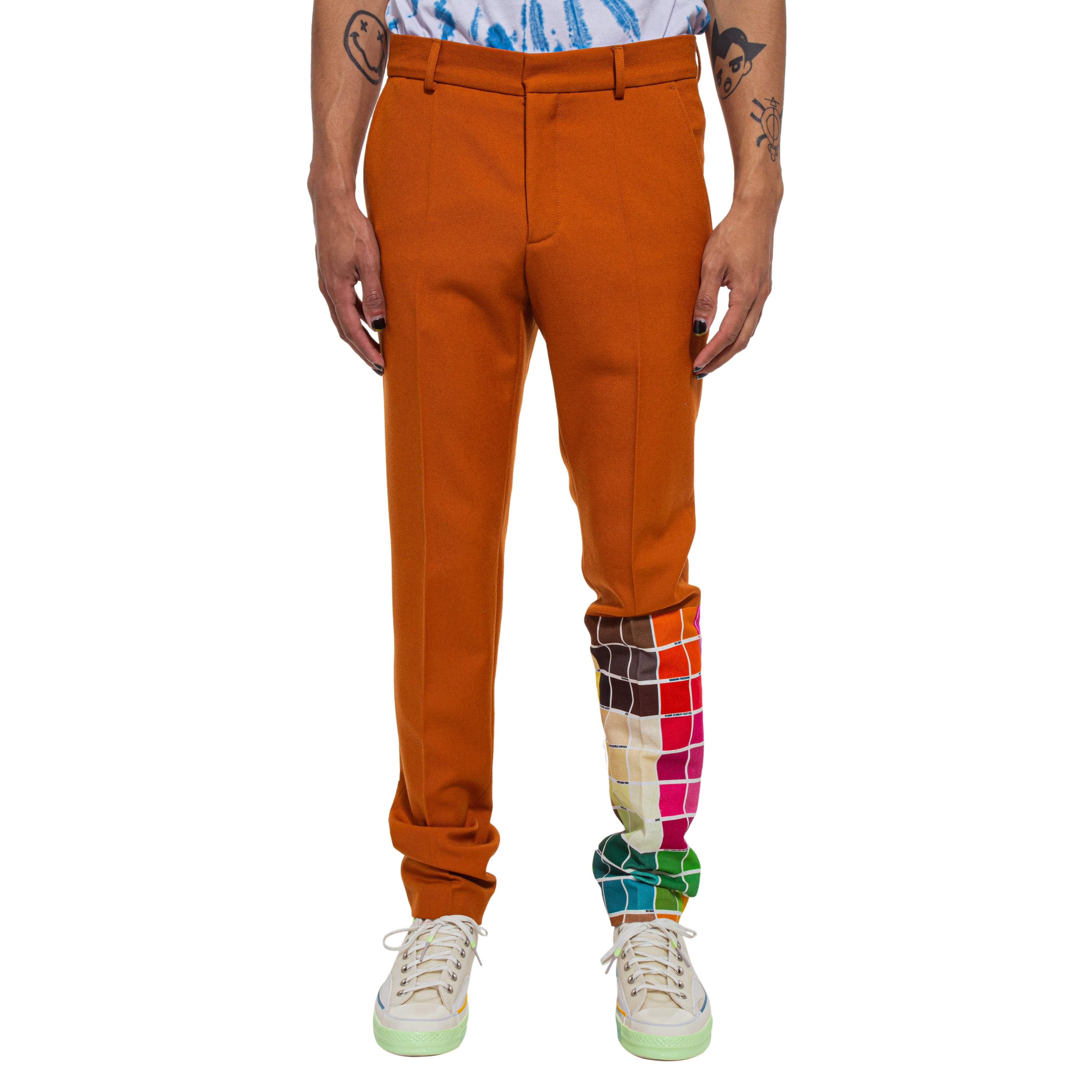 Wool check trousers in orange rust color, adjustable buttoned closure, belt loops, zip-up fly, front waist slash hand pockets, pleats through leg, left leg multicolor block fabric panel, rear pouch pocket, straight/finished hem, tonal stitching.
