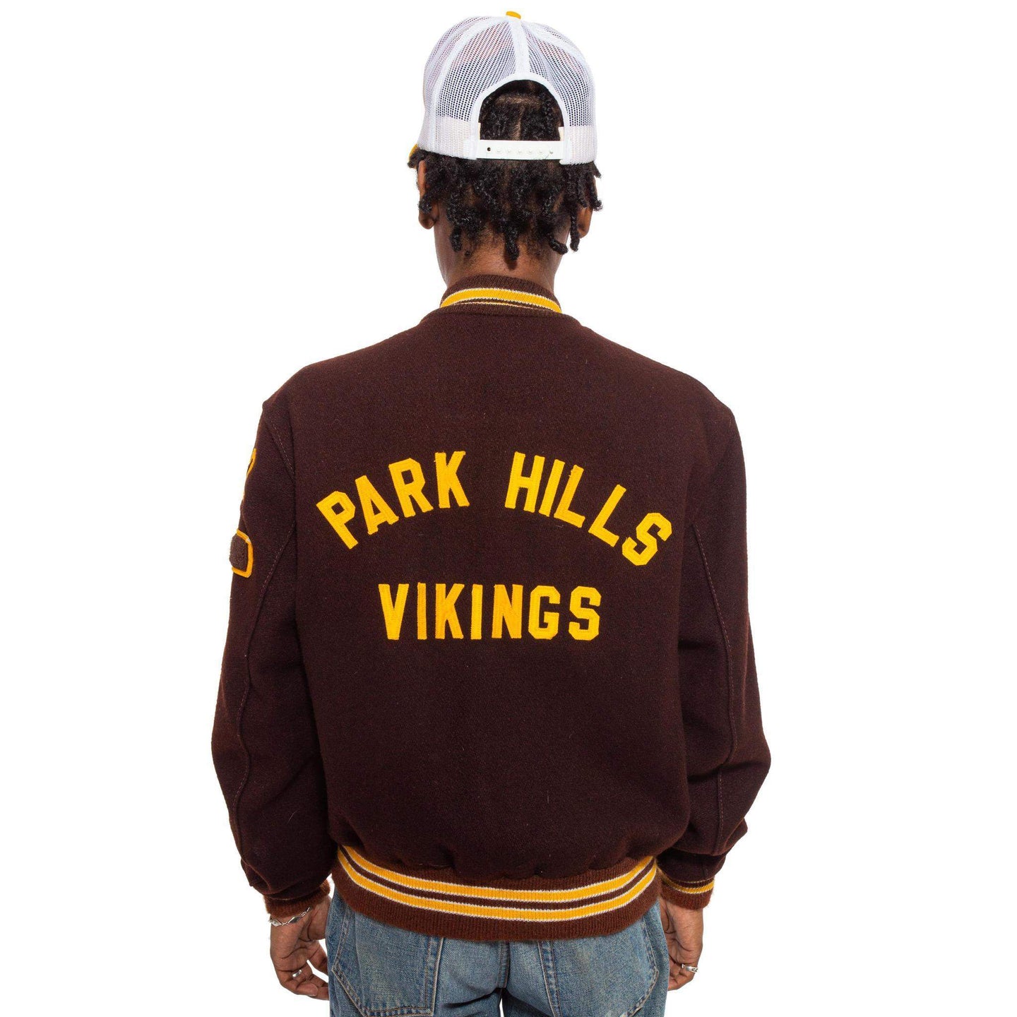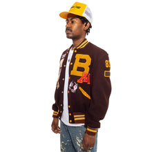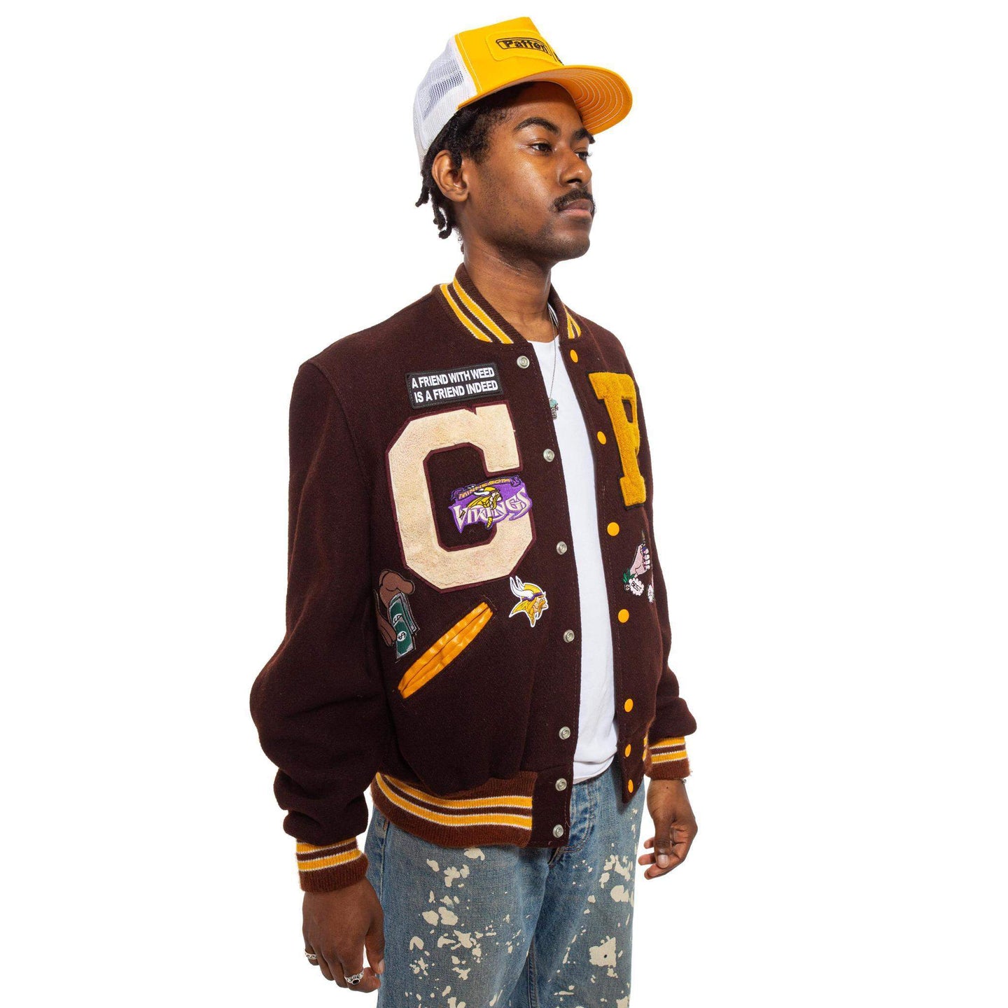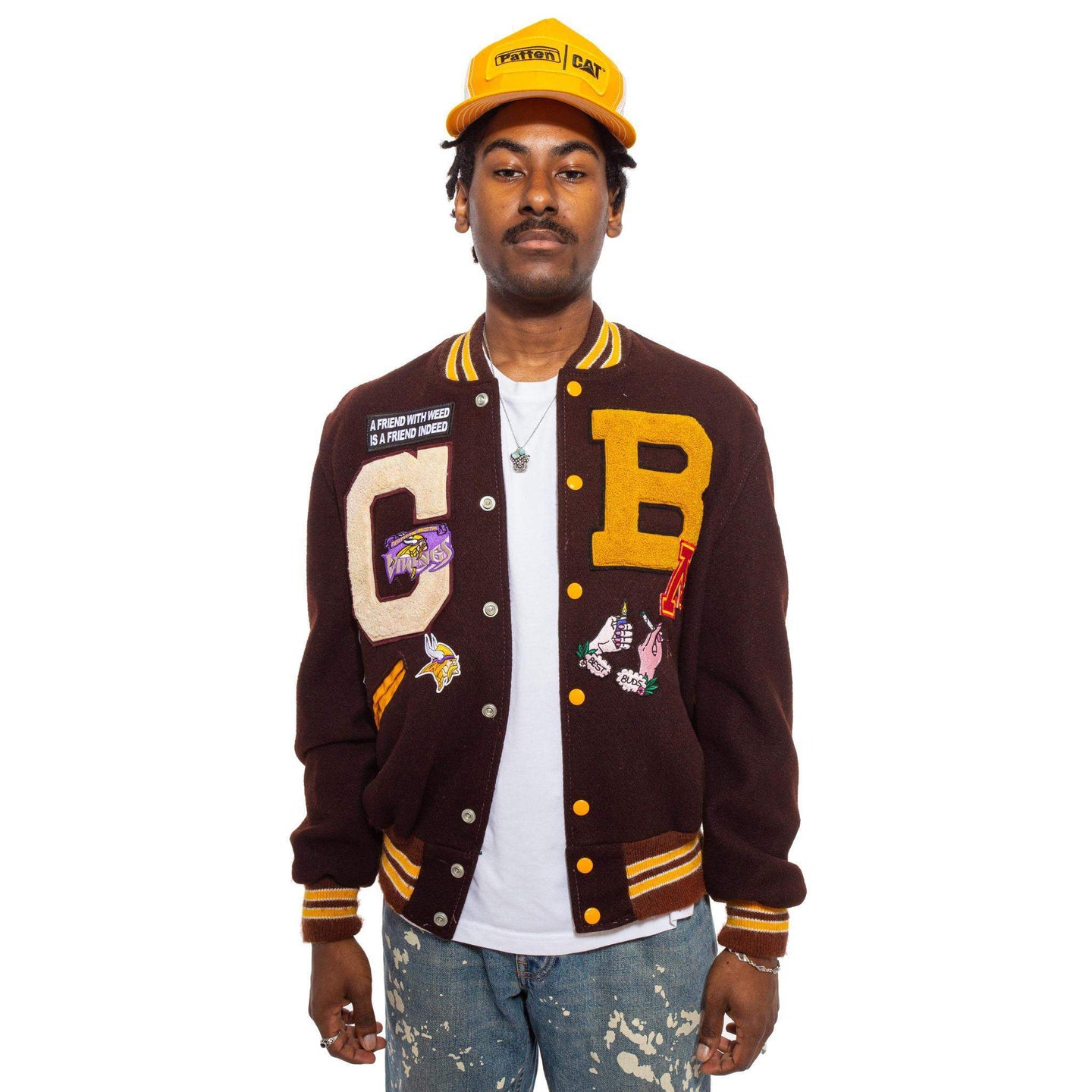 Brown wool varsity jacket with snap buttons, two front pockets, and all over patches. Fits a size small.
