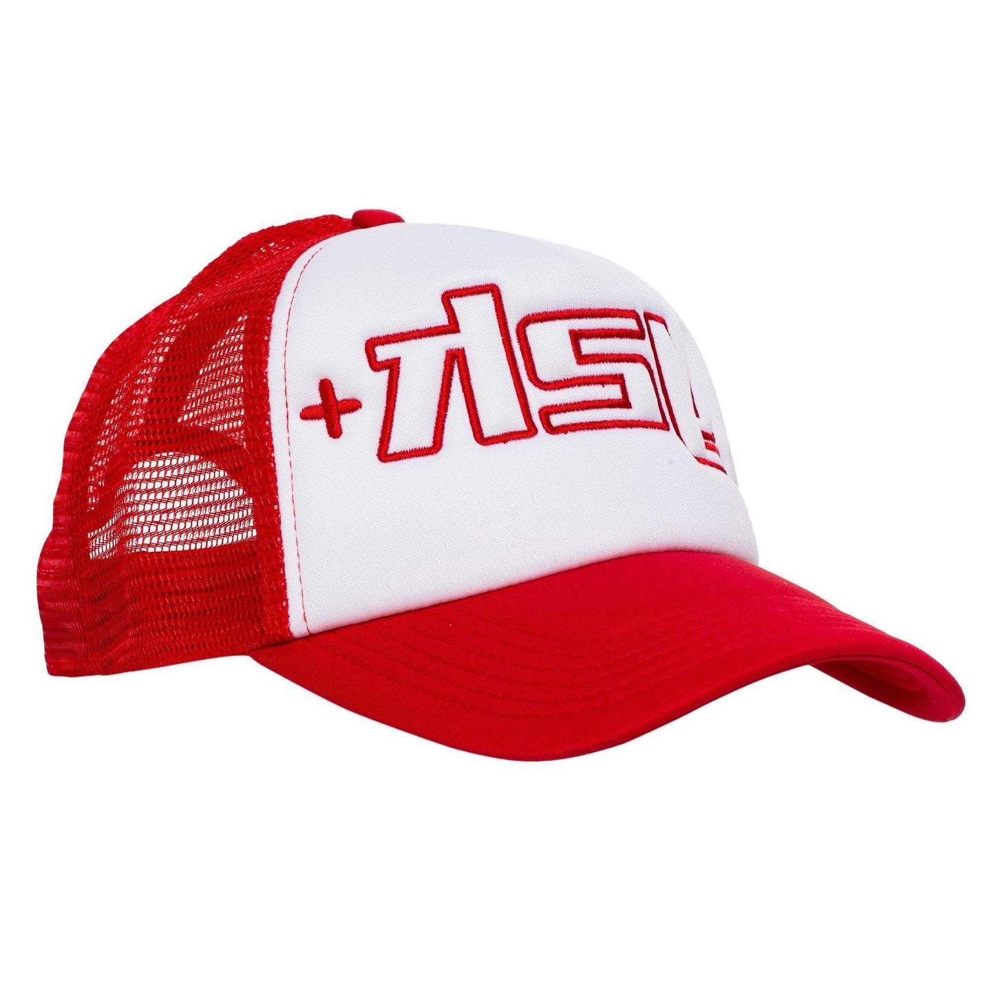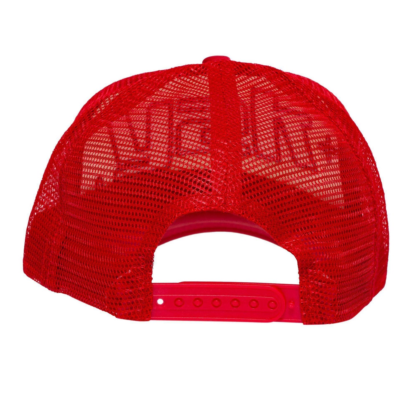 One size, snap back enclosure. White front with red mesh back with red embroidered y2K logo.