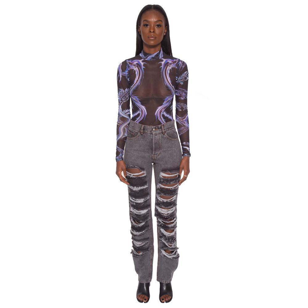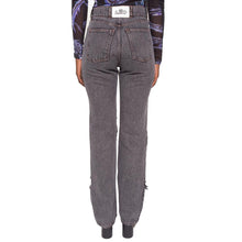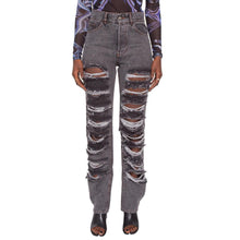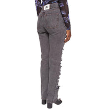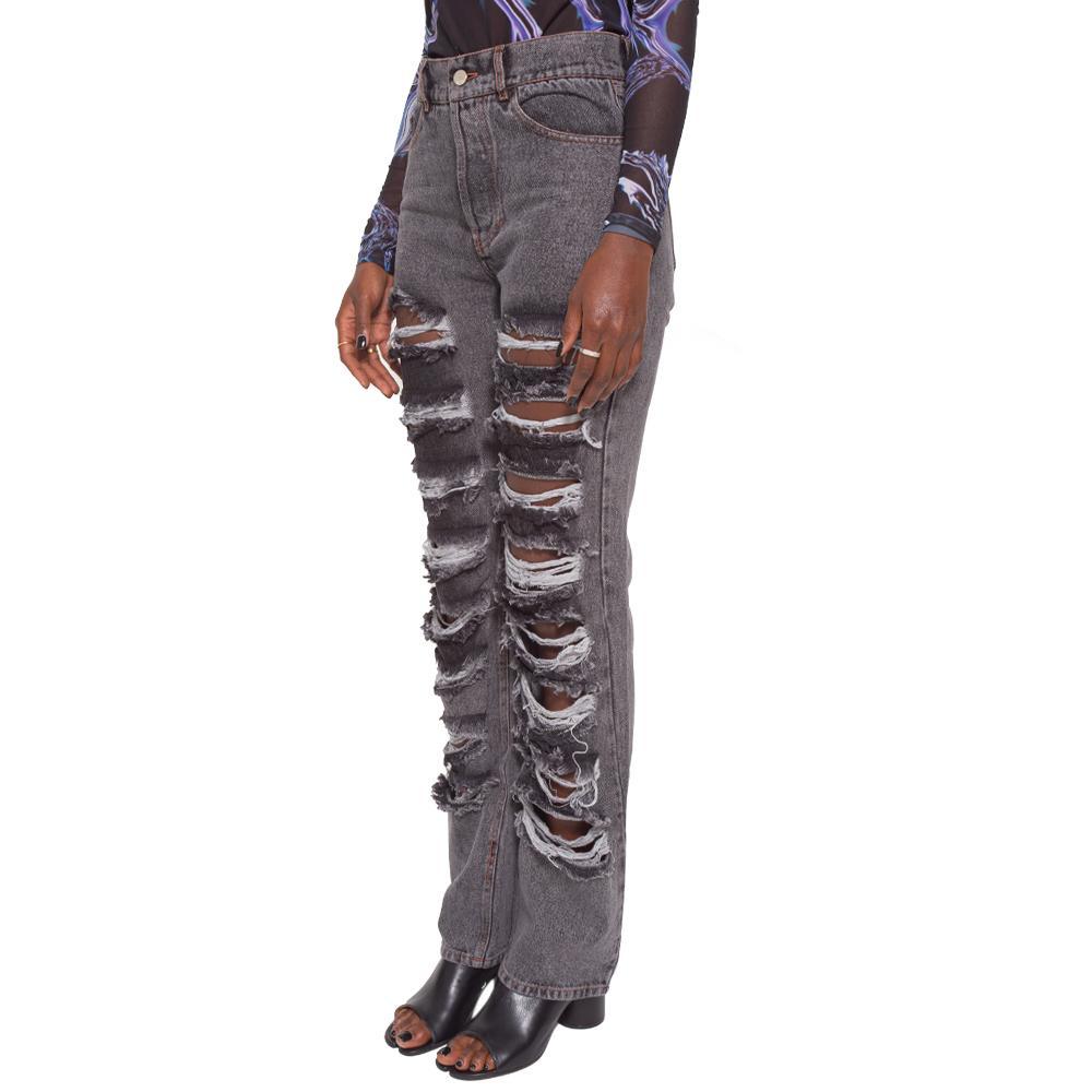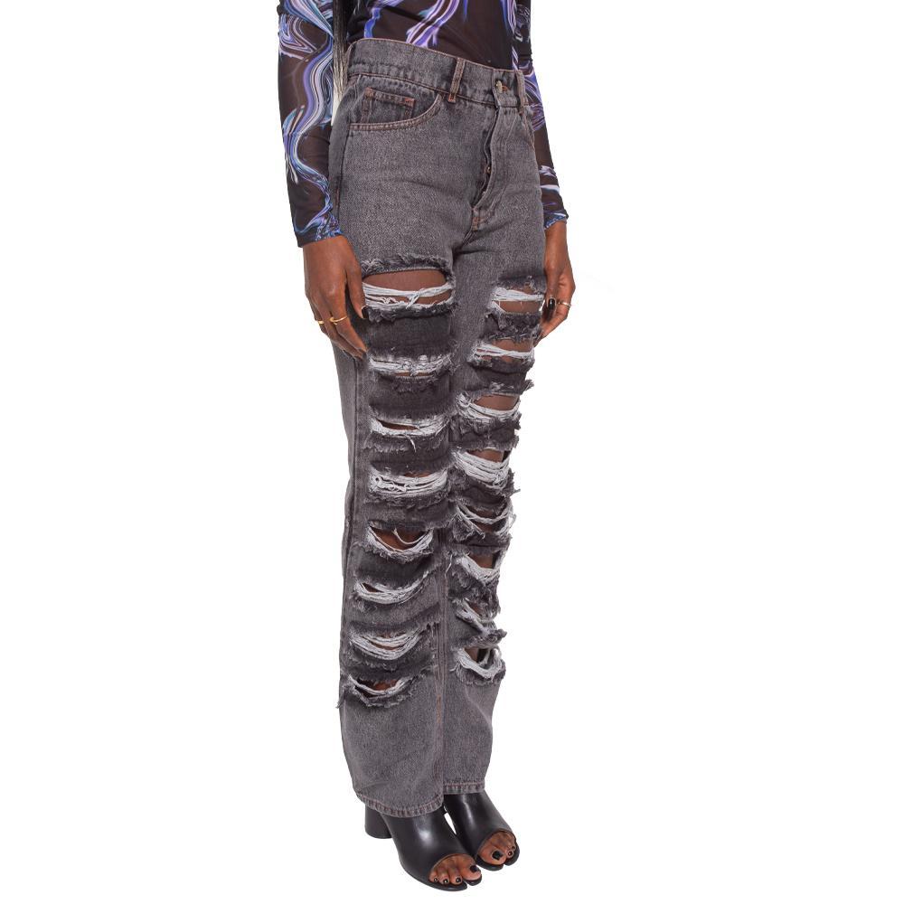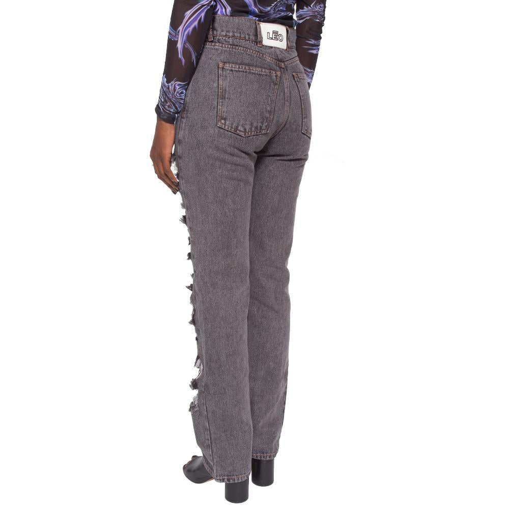 From LĒO Spring/Summer '22 collection 'Aura.' Washed grey denim with rough edged horiztonal slits down the front of both legs. Regular fit, straight cut, heavy weight denim.