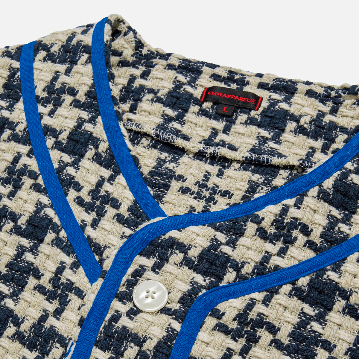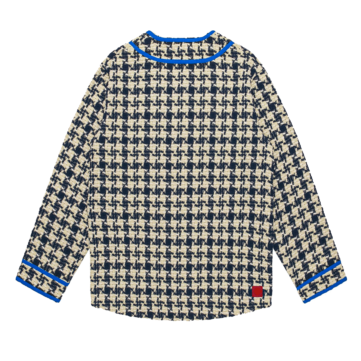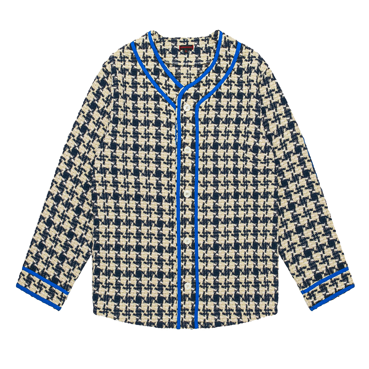 From CLOT FW21 "New Dynasty" collection; thick woven houndstooth style fabrication with electric blue piping on button closure and cuffs.