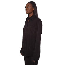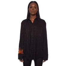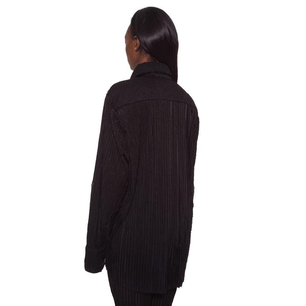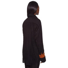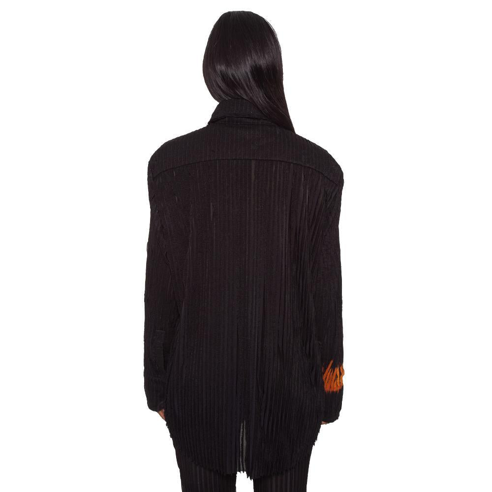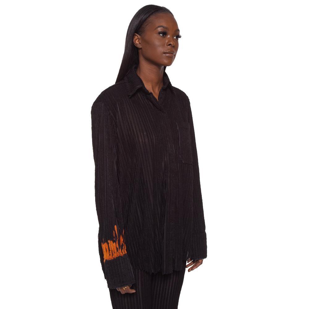 From LĒO Spring/Summer '22 collection 'Aura.' Wavy jersey with soft touch texture in black with tie dye placement on right sleeve. This top fire (literally)! Press button closing on center front, one breast pocket, classic collar, long sleeved, adjustable cuffs with press buttons.